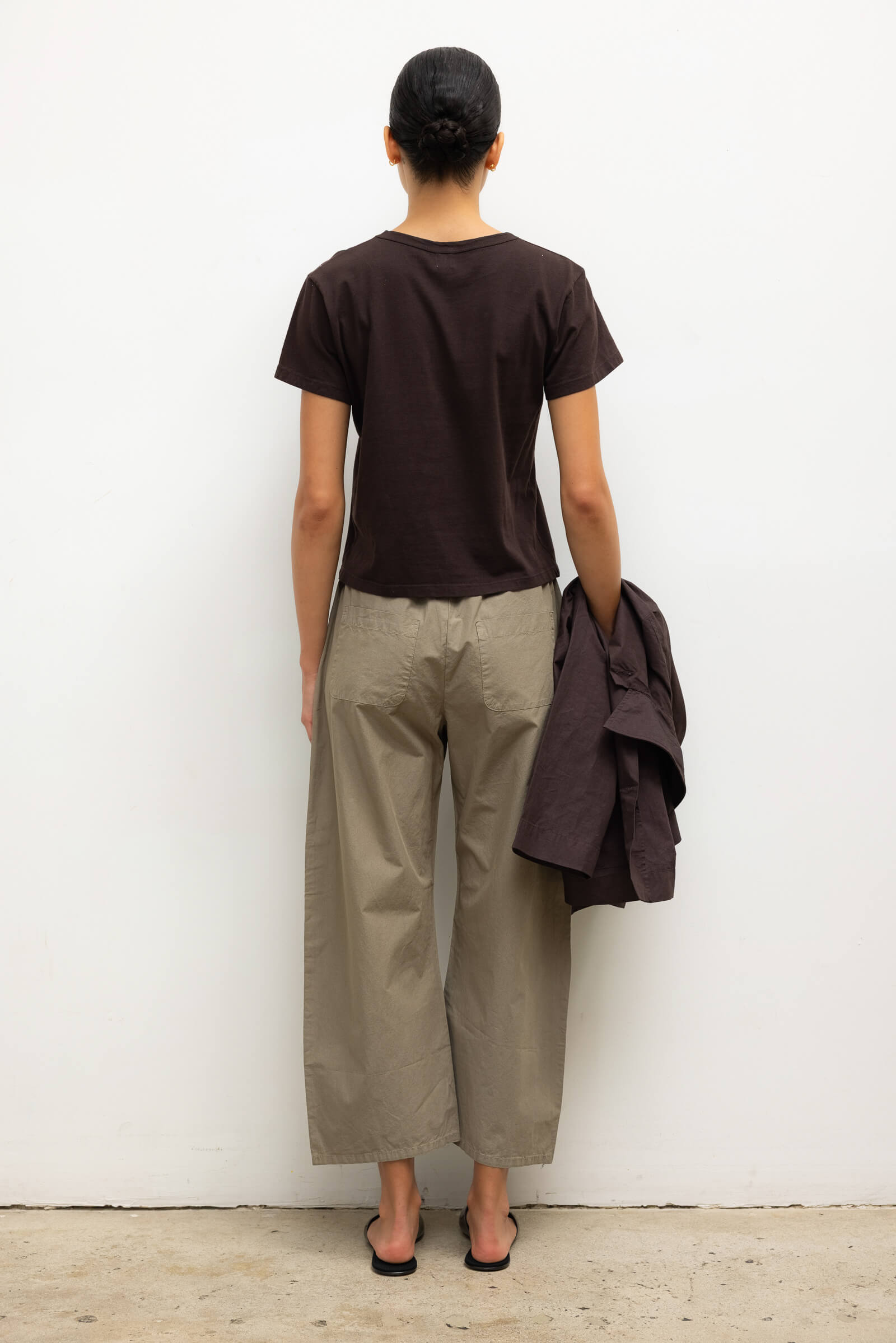Cut in our garment dyed Kyoto Cotton, The Kyoto Carpenter Pant is a classic utility inspired trouser now in limited edition Cypress. This pull-on style pant features a baggy leg silhouette that hits at the ankle, with topstitched utility panels at front, an adjustable waistband, and patch pockets at back.