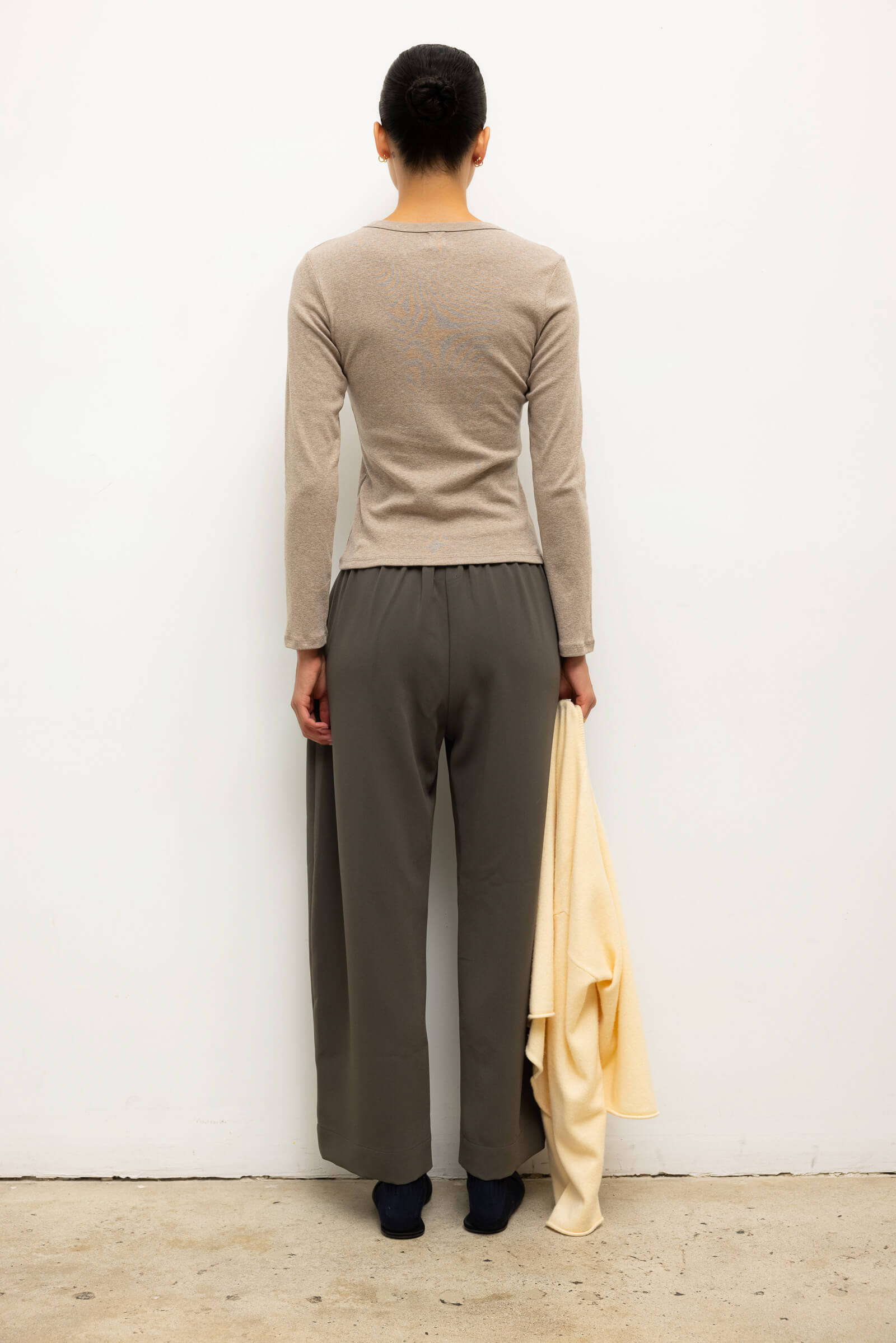 Cut in our Japanese-crafted Arielle Crepe, The Arielle Barrel Pant is a rounded, cropped leg silhouette that drapes neatly at front. Finished with a faux zipper fly and comfortable, ruched elastic waistband at back.