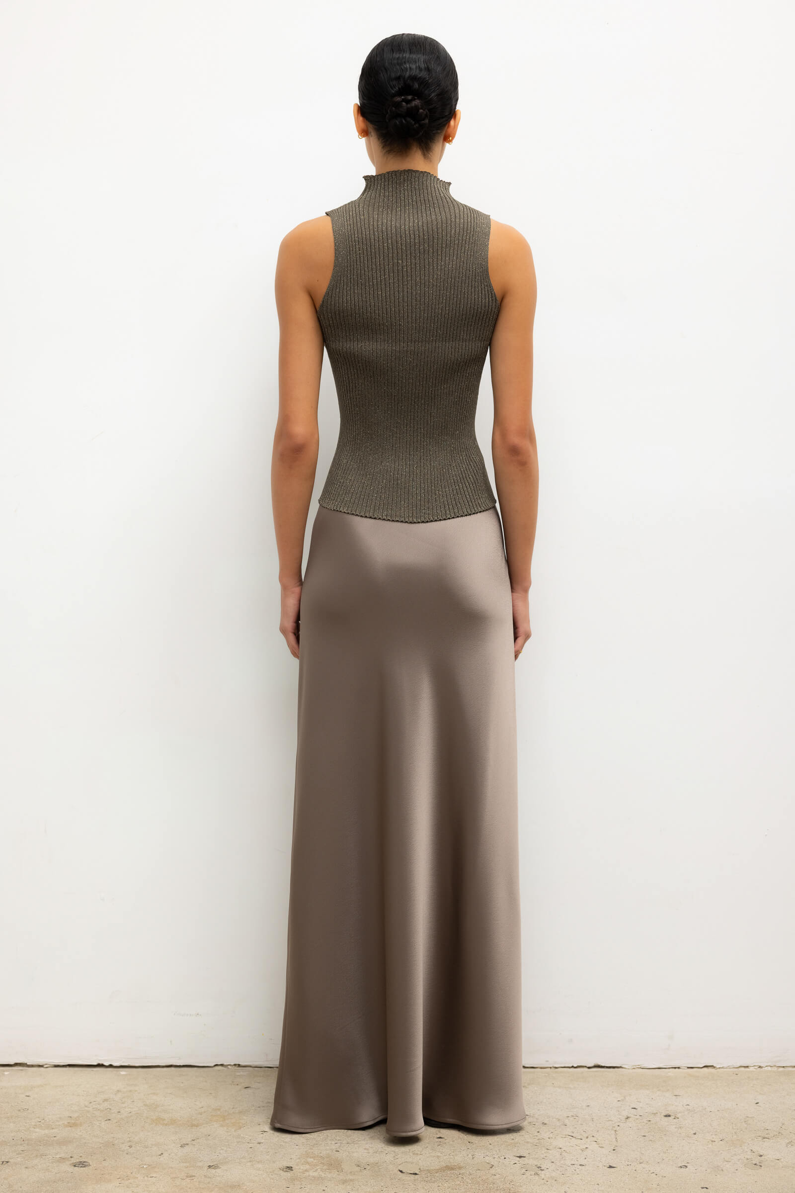 Cut in our best-selling Japanese-crafted Barb Satin, The Barb Bias Skirt is a full length maxi that perfectly drapes to flatter the form. Make it a matching set with any Barb top or mix it tonally with The Blake Rib Set in Moss.
