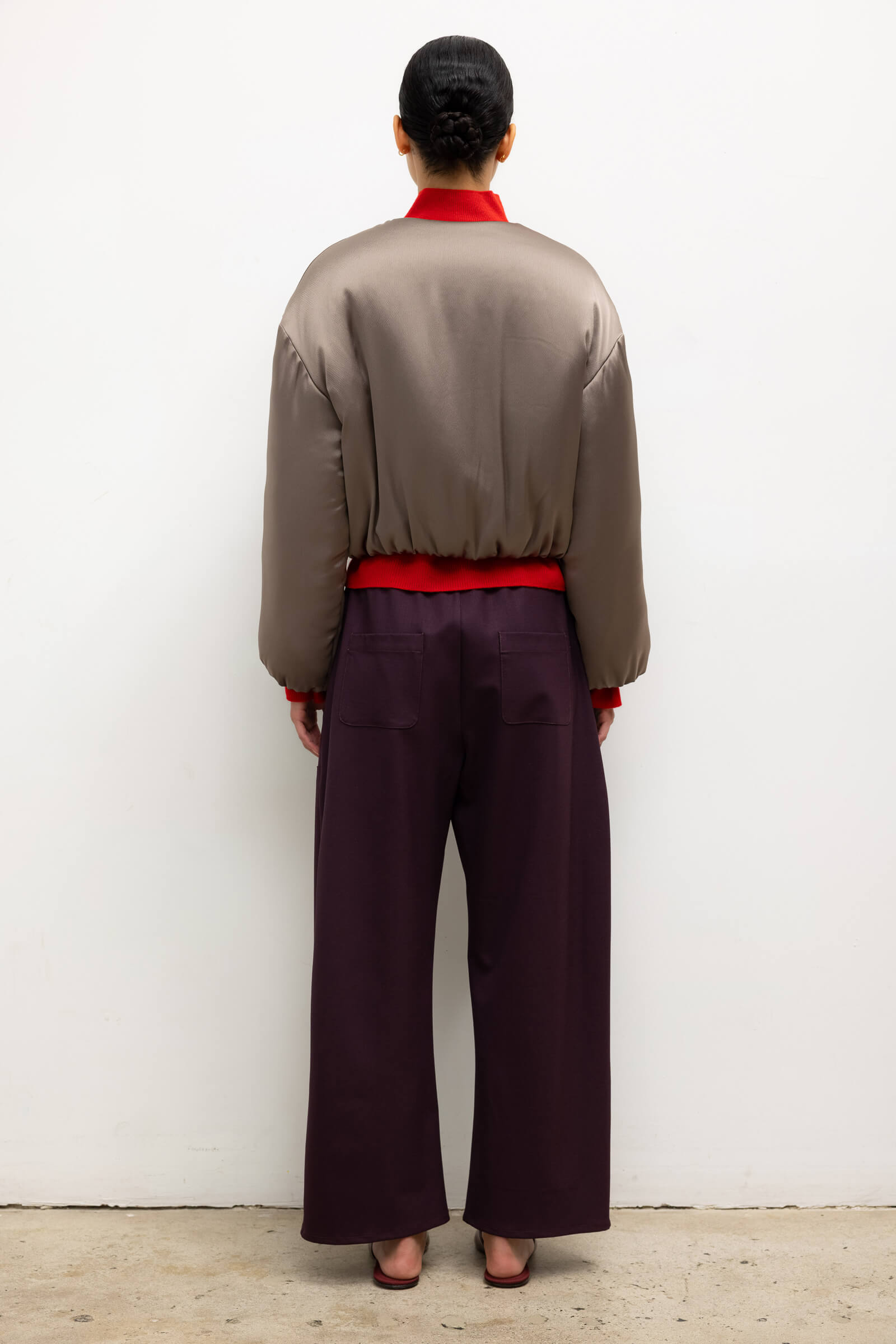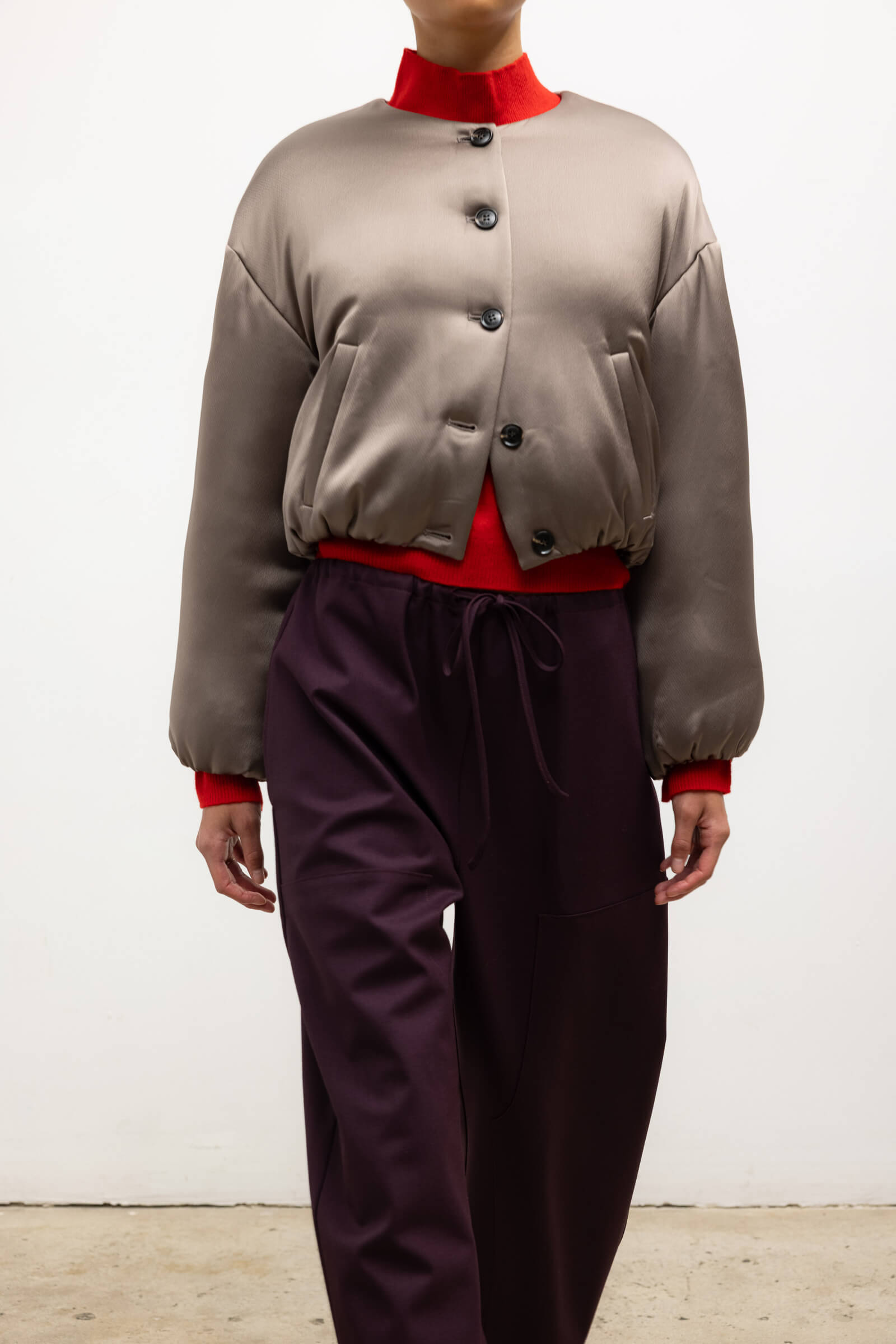 Cut in our best-selling, Japanese-crafted Barb Satin, The Barb Bomber reimagines the classic utility bomber. This collarless crop jacket features a soft poly faille, button front closure and shapely full length sleeves. Make it a matching set with any Barb style.