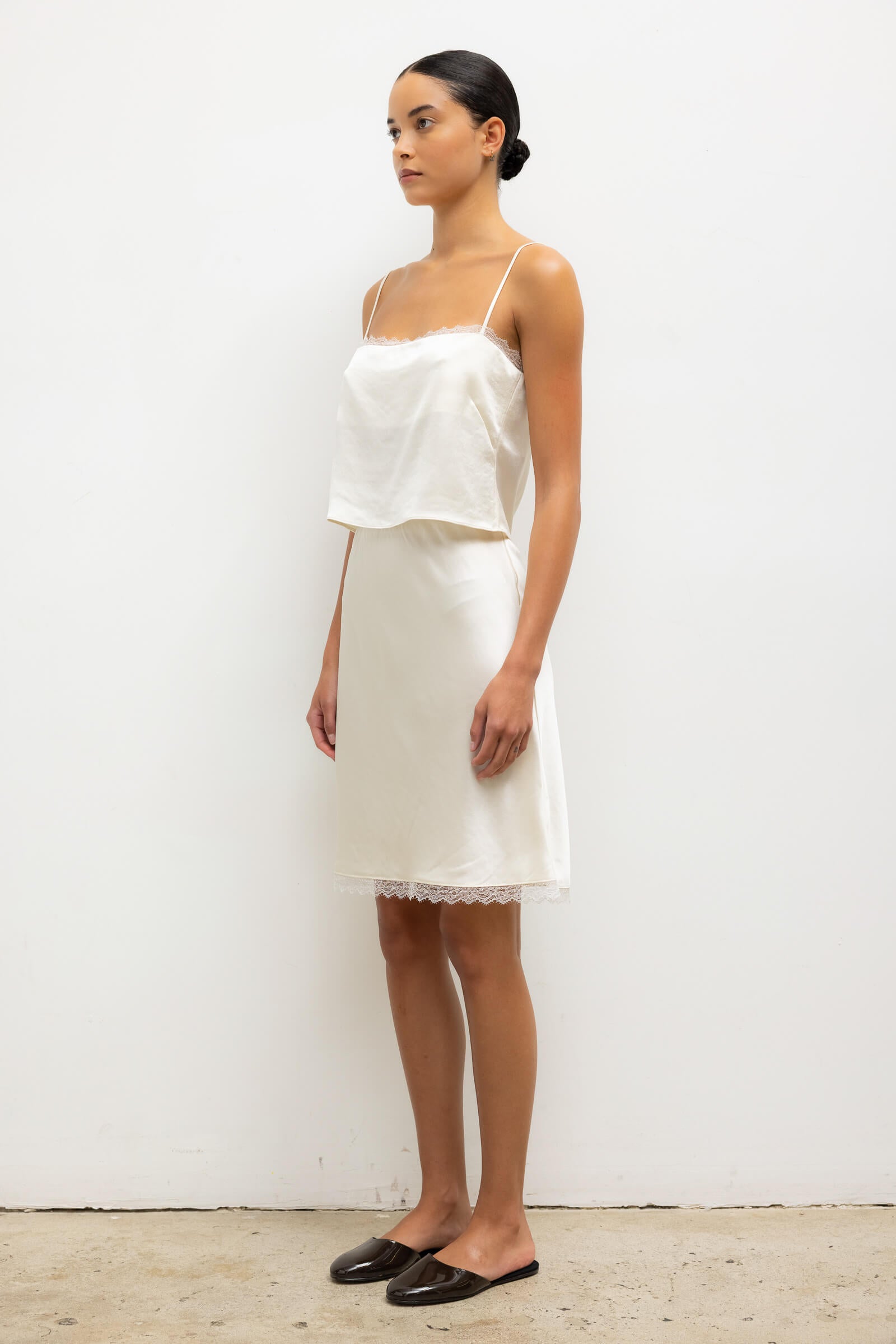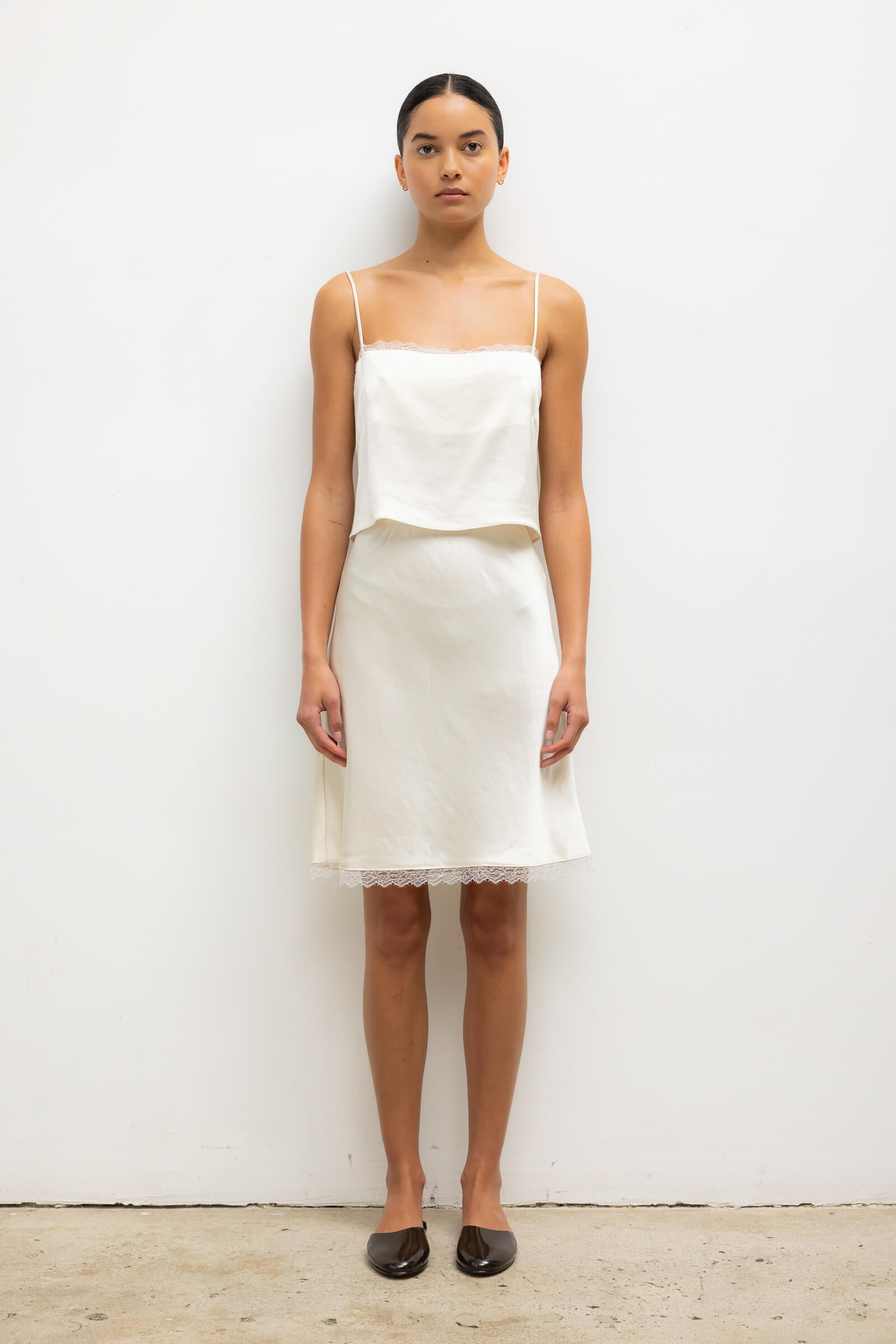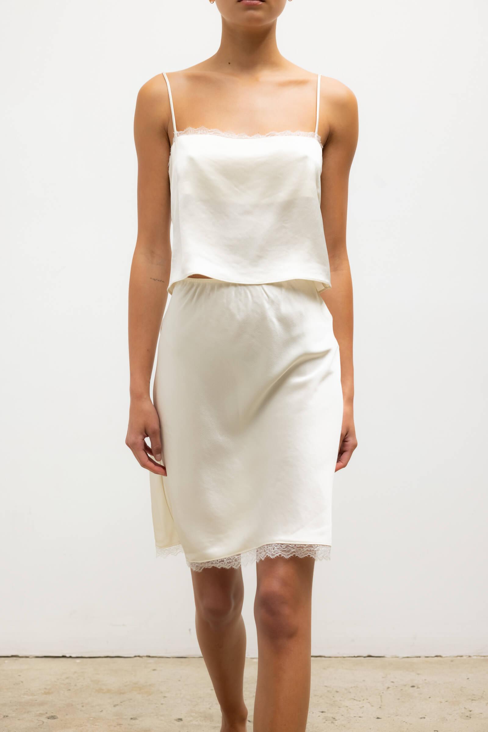 Cut in our Japanese-crafted Barb Lace Satin, the Barb Lace Slip Skirt features a straight midi length and soft elastic waistband. Finished with a fine, scalloped lace edge.