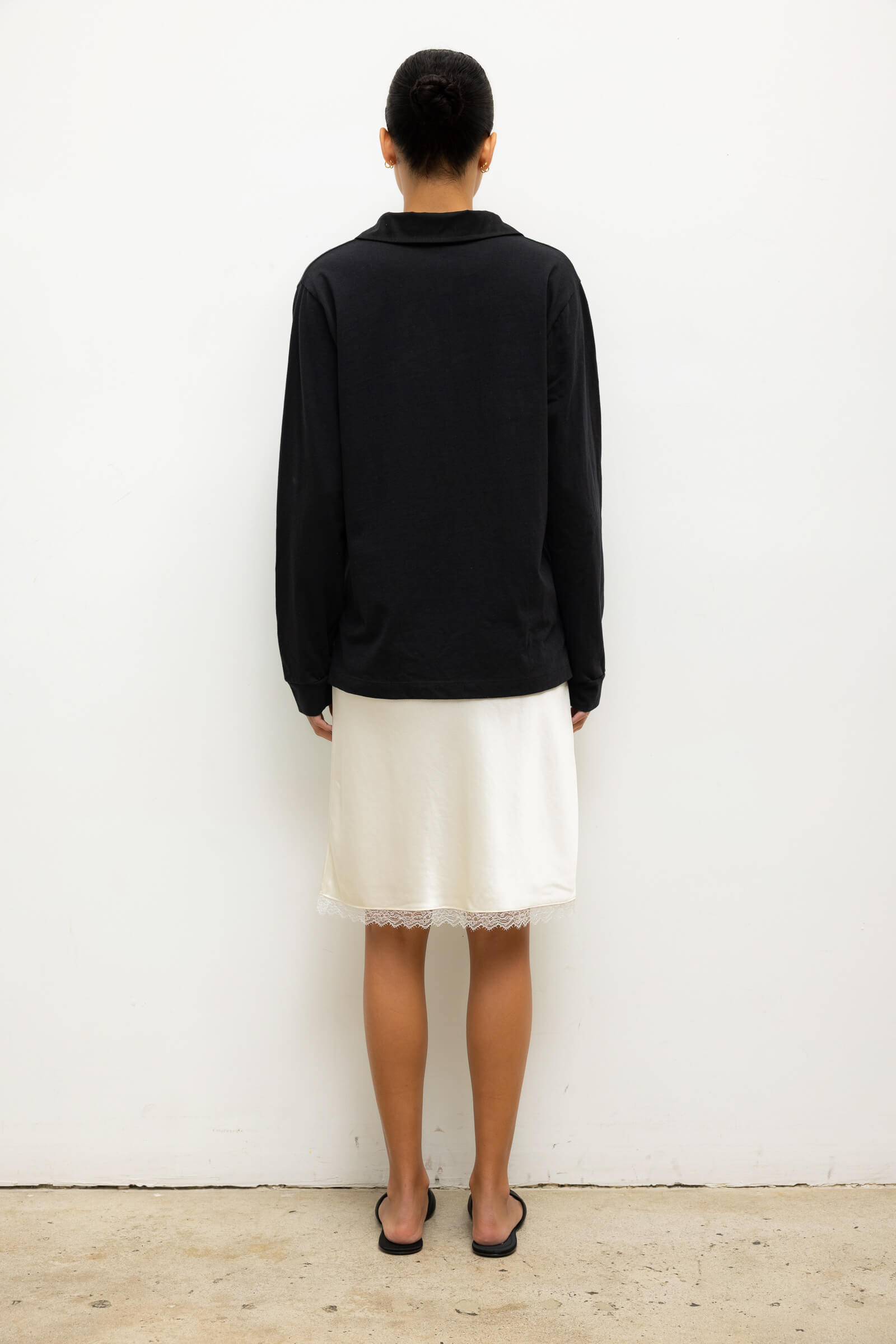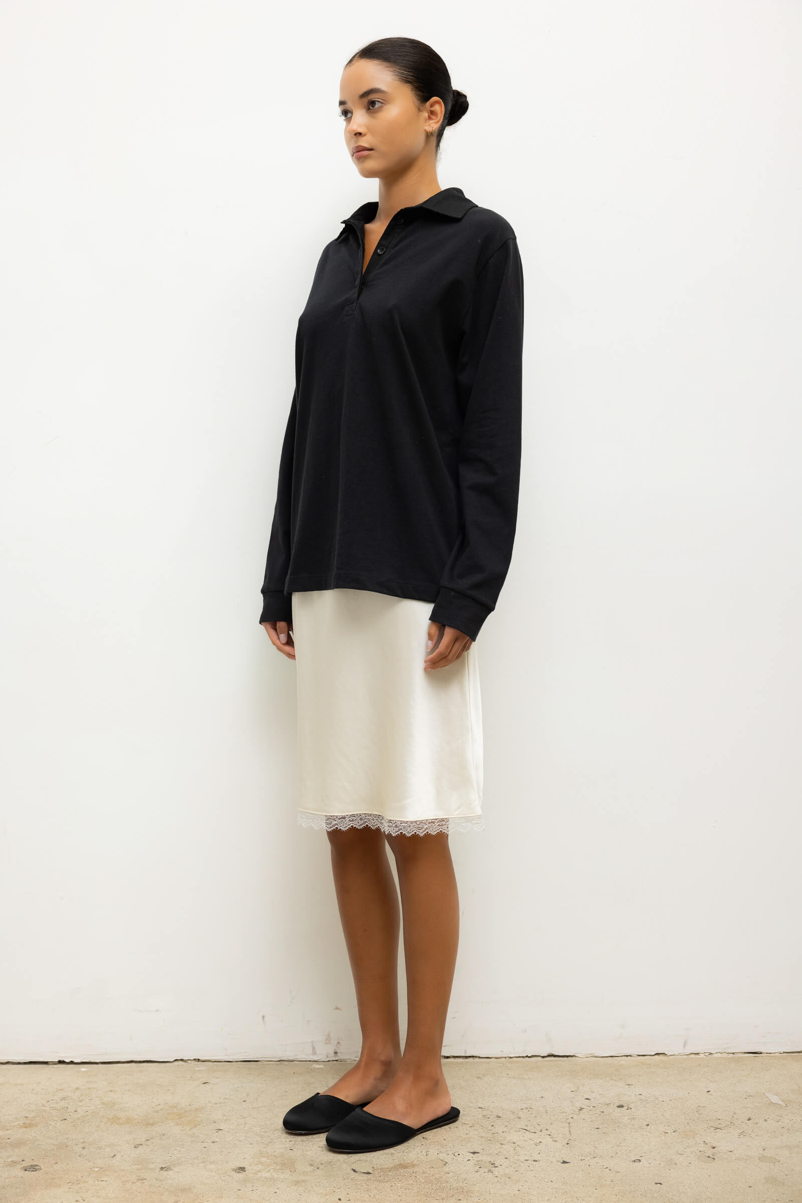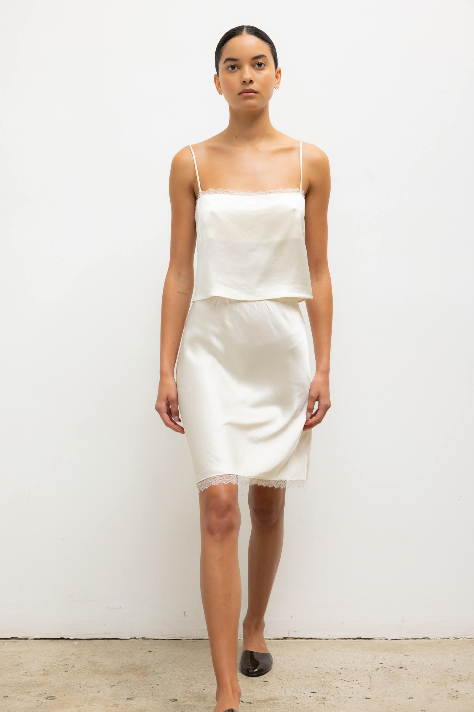 Cut in our Japanese-crafted Barb Lace Satin, the Barb Lace Slip Skirt features a straight midi length and soft elastic waistband. Finished with a fine, scalloped lace edge.