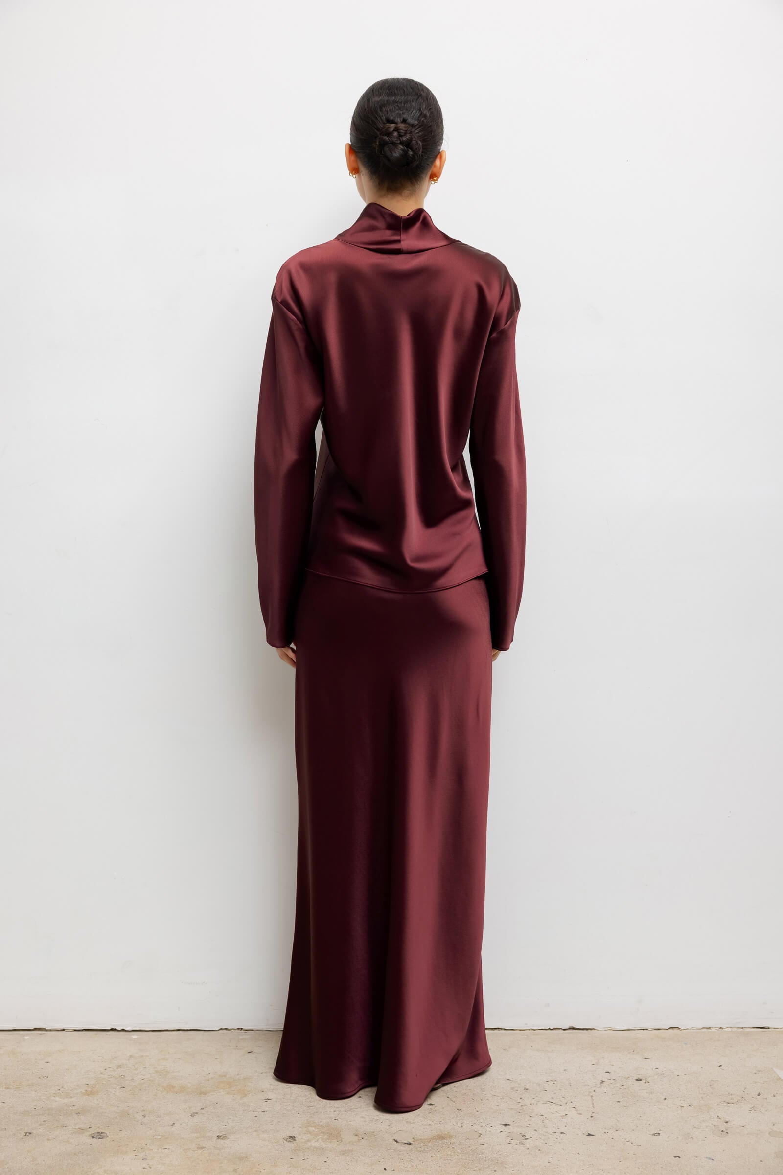Cut in our best-selling Japanese-crafted Barb Satin, The Barb Long Sleeve Cowl Neck is a classic long sleeve top, featuring a perfectly draped cowl neckline and tuckable length. Make it a matching set with any Barb bottom in Bordeaux.