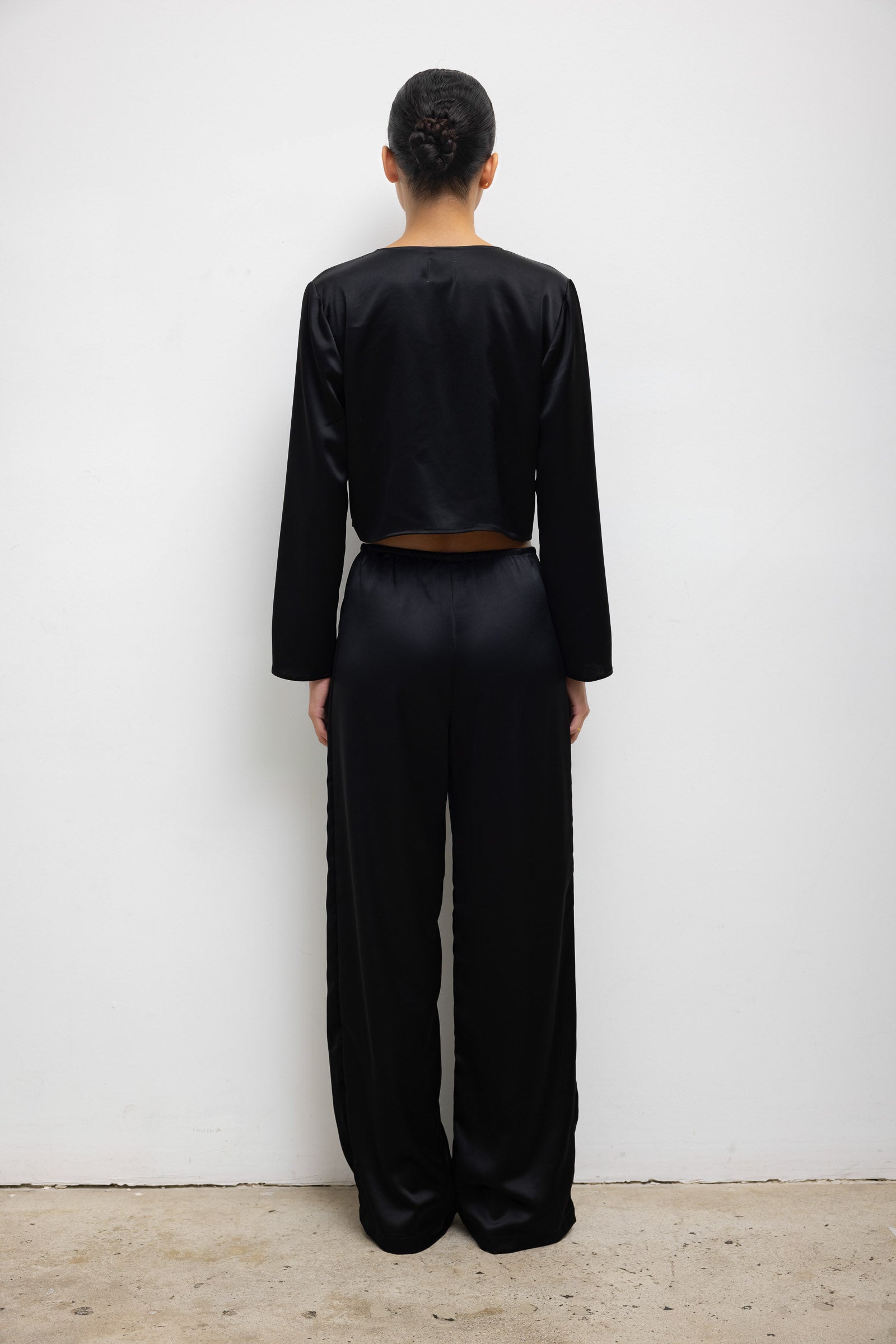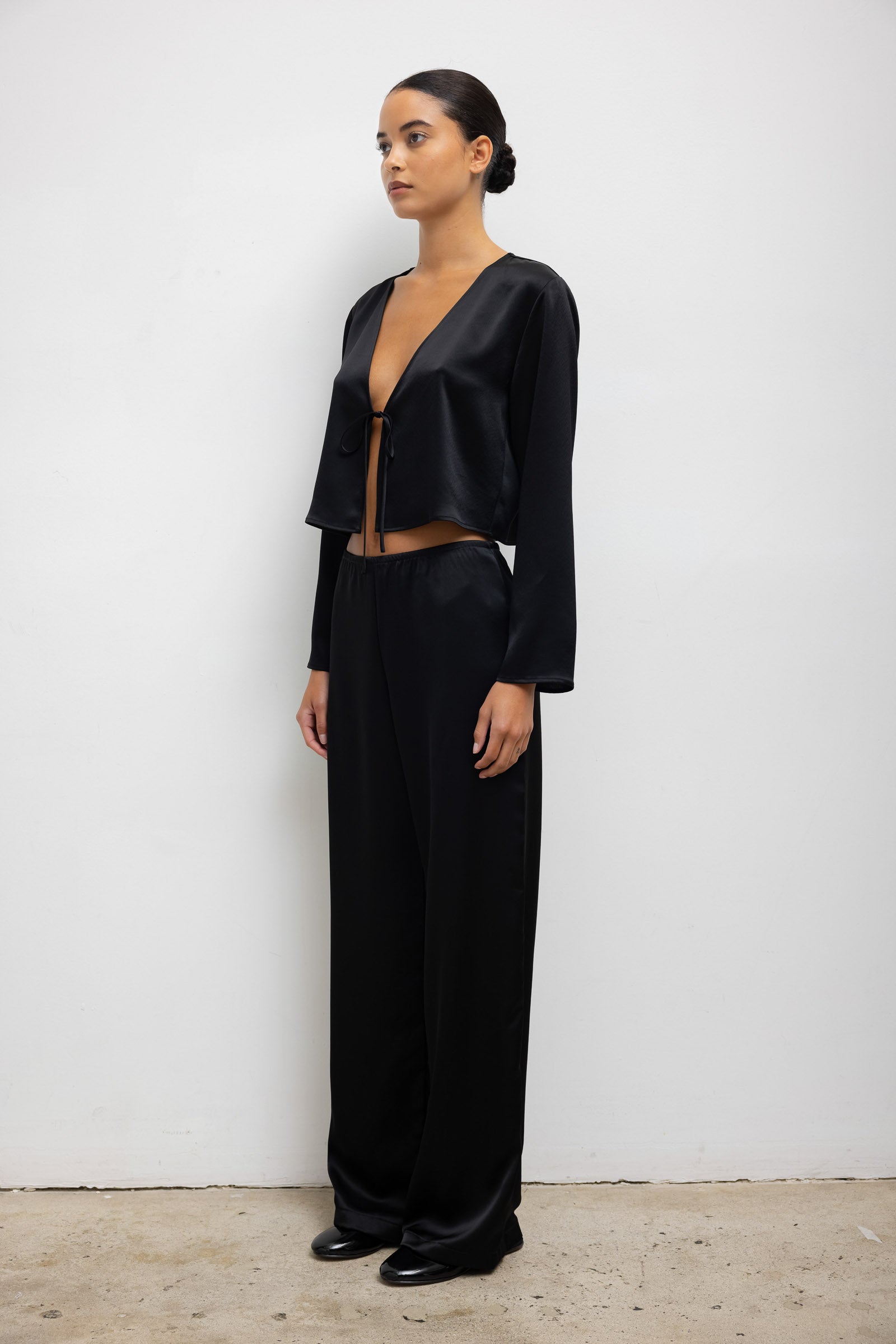 Cut in our Japanese-crafted satin, The Barb Long Sleeve Tie Top is the long sleeved sister to our bestselling Barb Tie Top. This pull on style top features a deep V neckline finished with a delicate tie closure, cropped length, and full length sleeves.