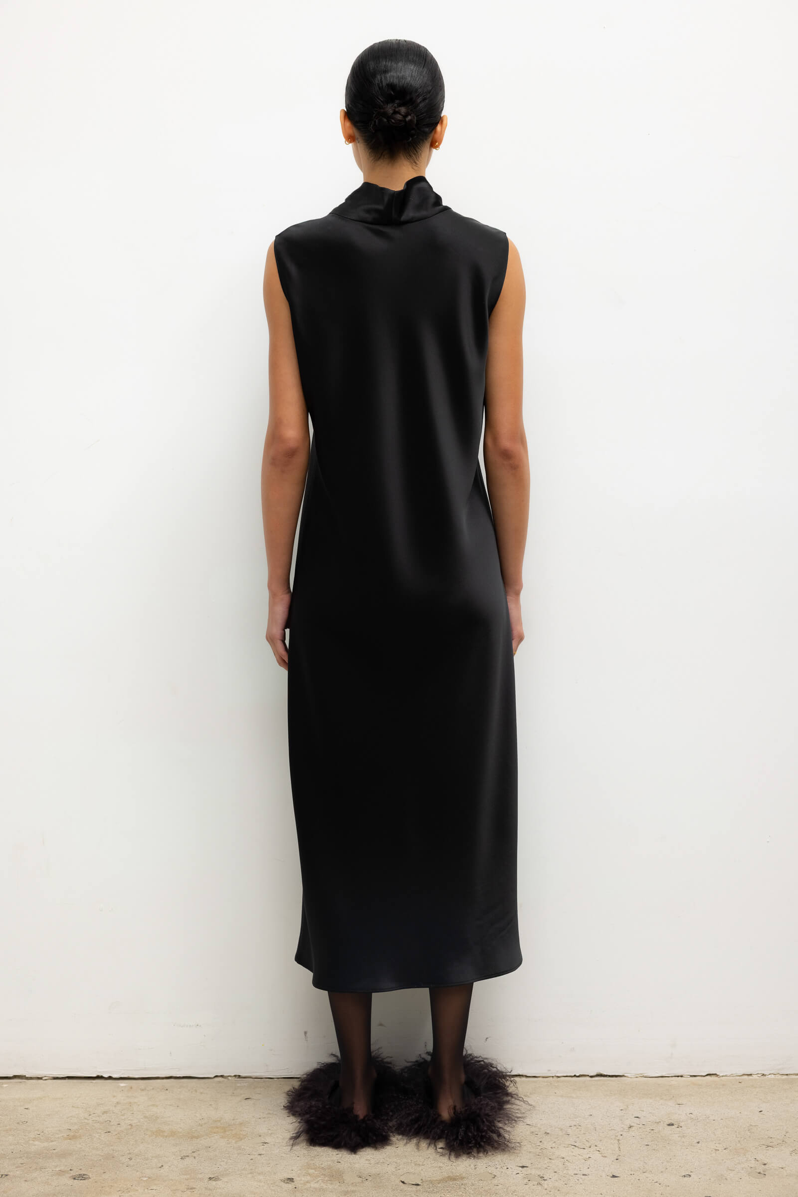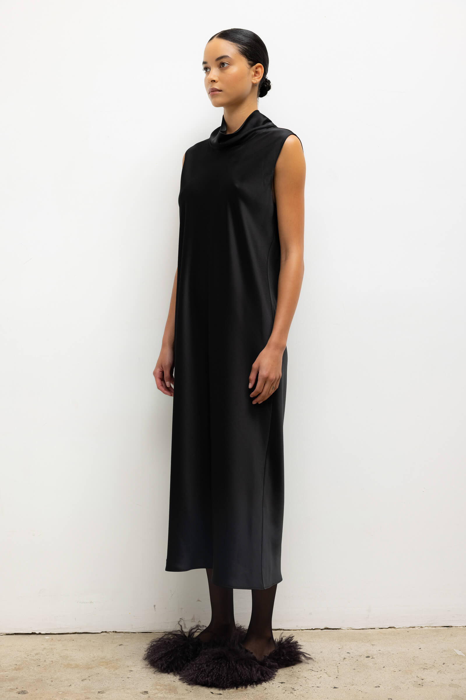 Cut in our best-selling, Japanese-crafted Barb Satin, The Barb Mock Neck Sleeveless Dress is a midi length dress, featuring a perfectly draped mock neck and sleeveless silhouette. Make it a matching set with The Barb Bomber.