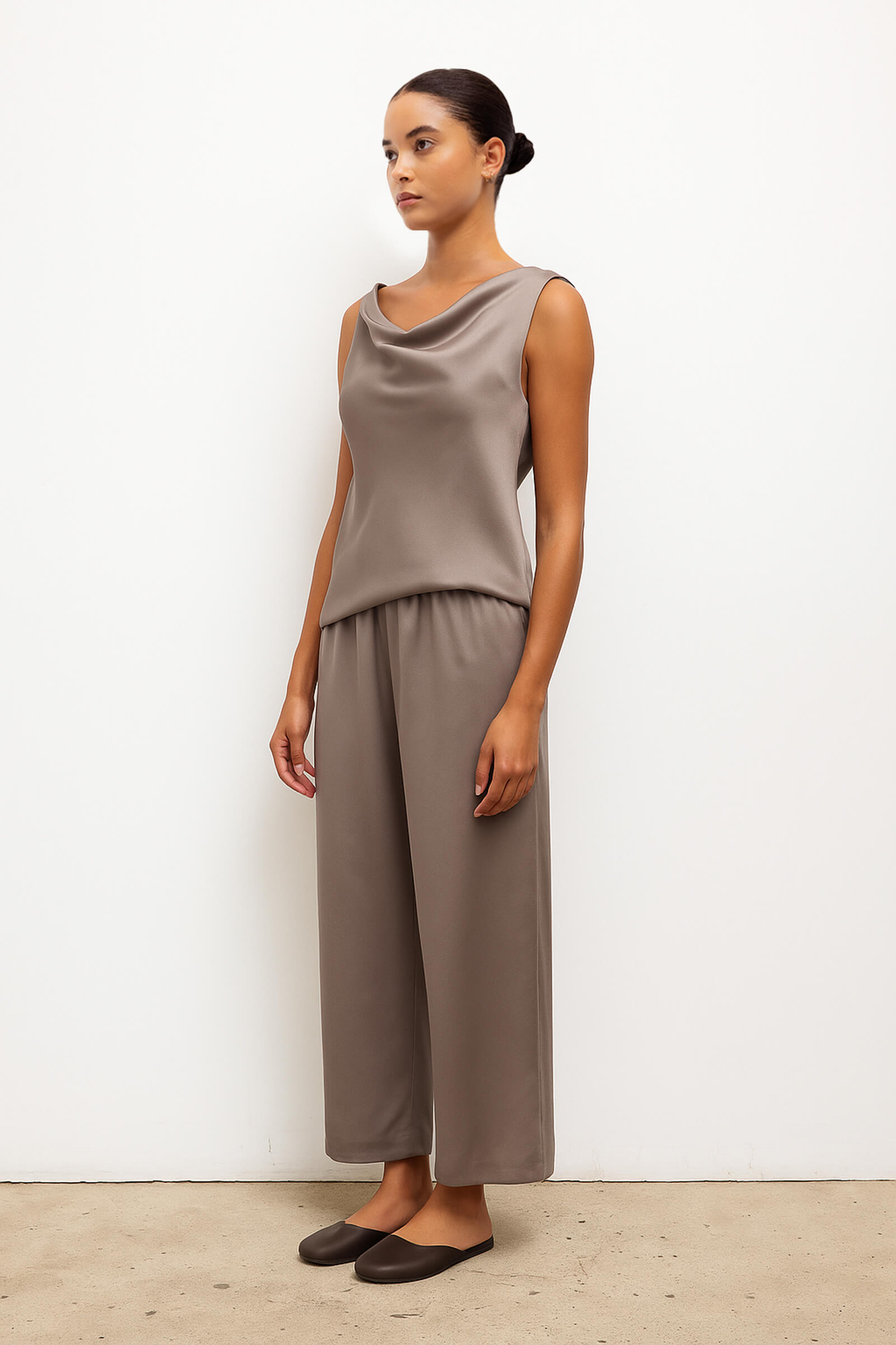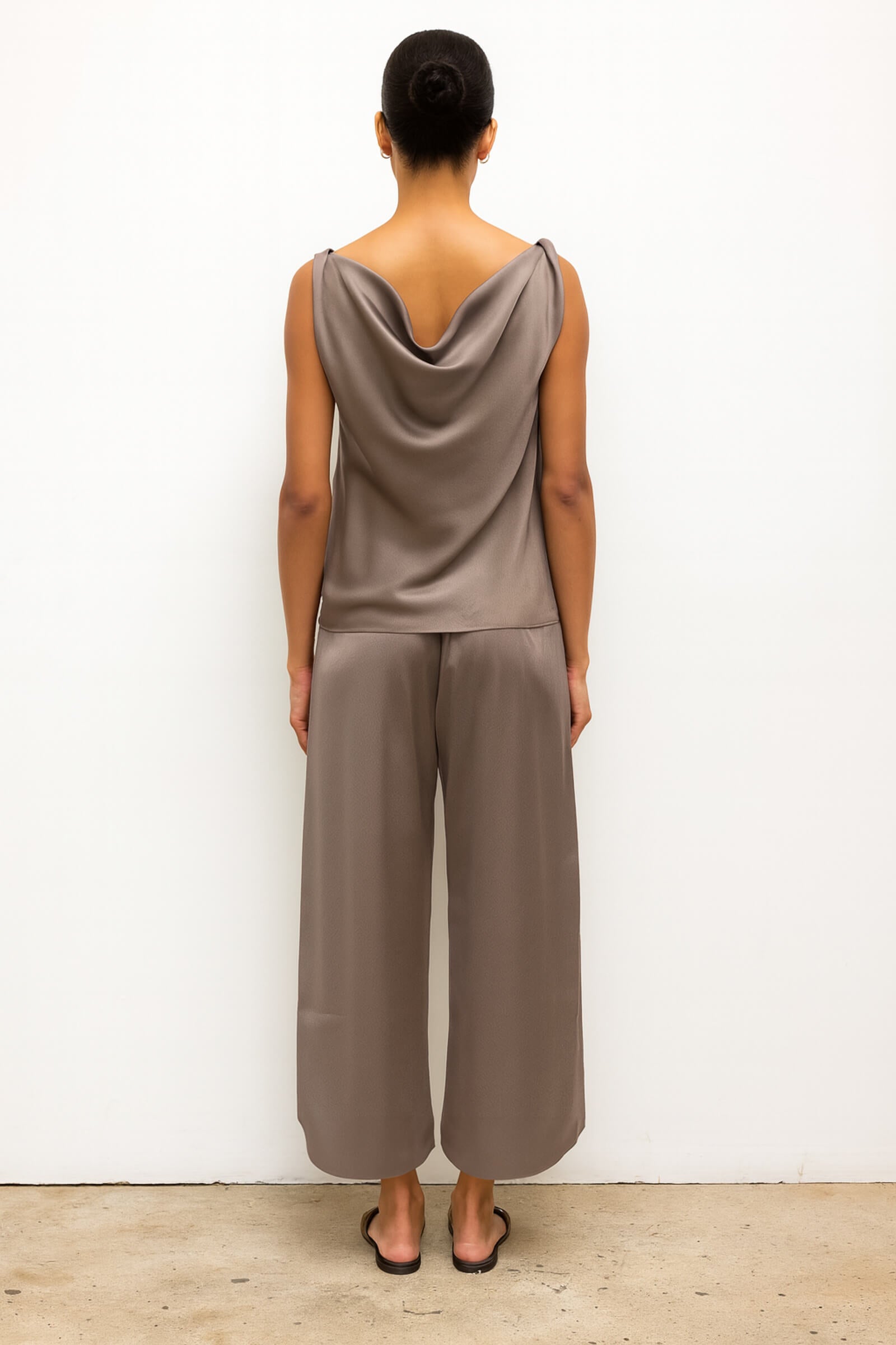 Cut in our best-selling, Japanese-crafted Barb Satin, The Barb Shell is a sleeveless top featuring twisted asymmetrical shoulders that drape perfectly. Make it a matching set with any Barb bottom.
