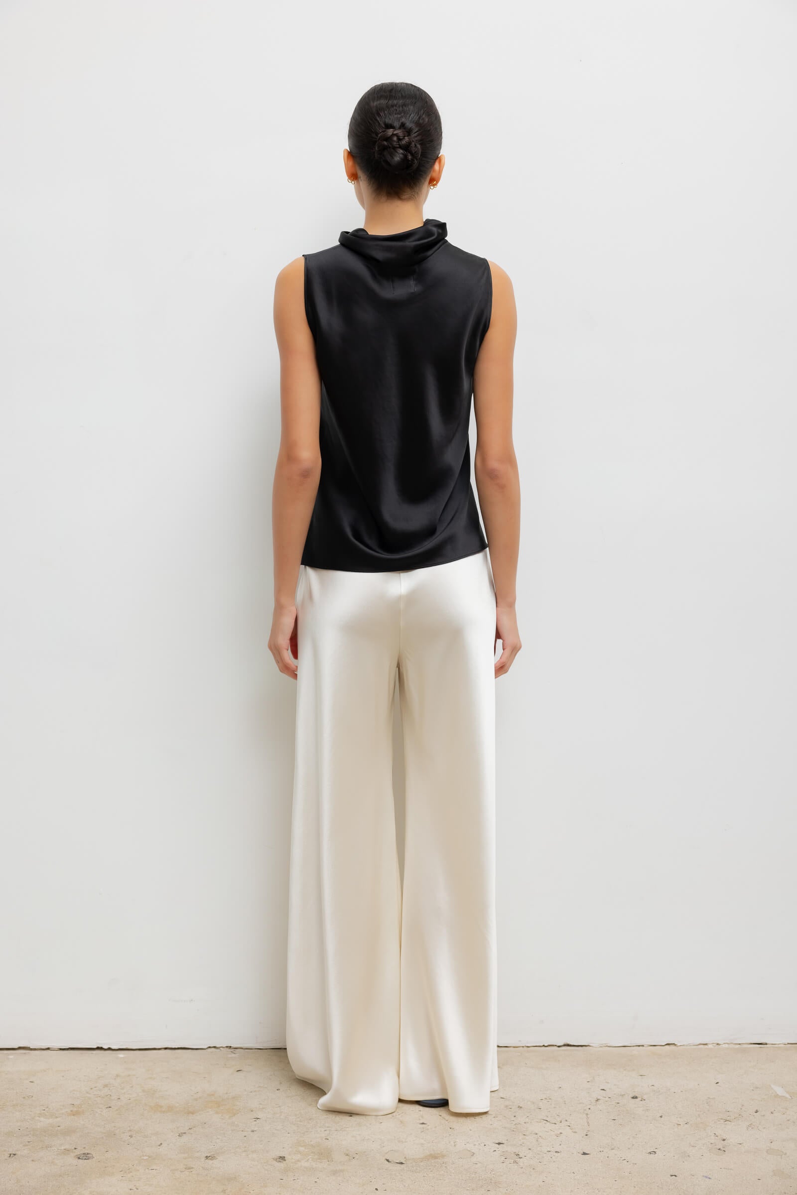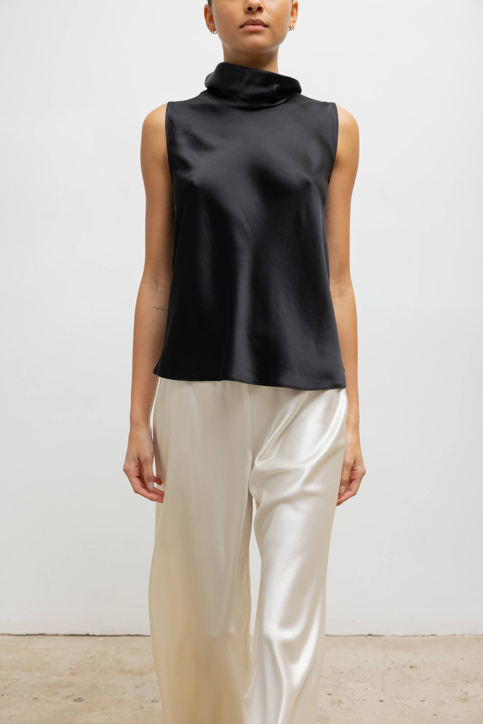 Cut in our Japanese-crafted Barb Satin, The Barb Sleeveless Cowl Neck is a classic shell silhouette, featuring a perfectly draped cowl neckline and tuckable length. Make it a matching set with any Barb bottom.