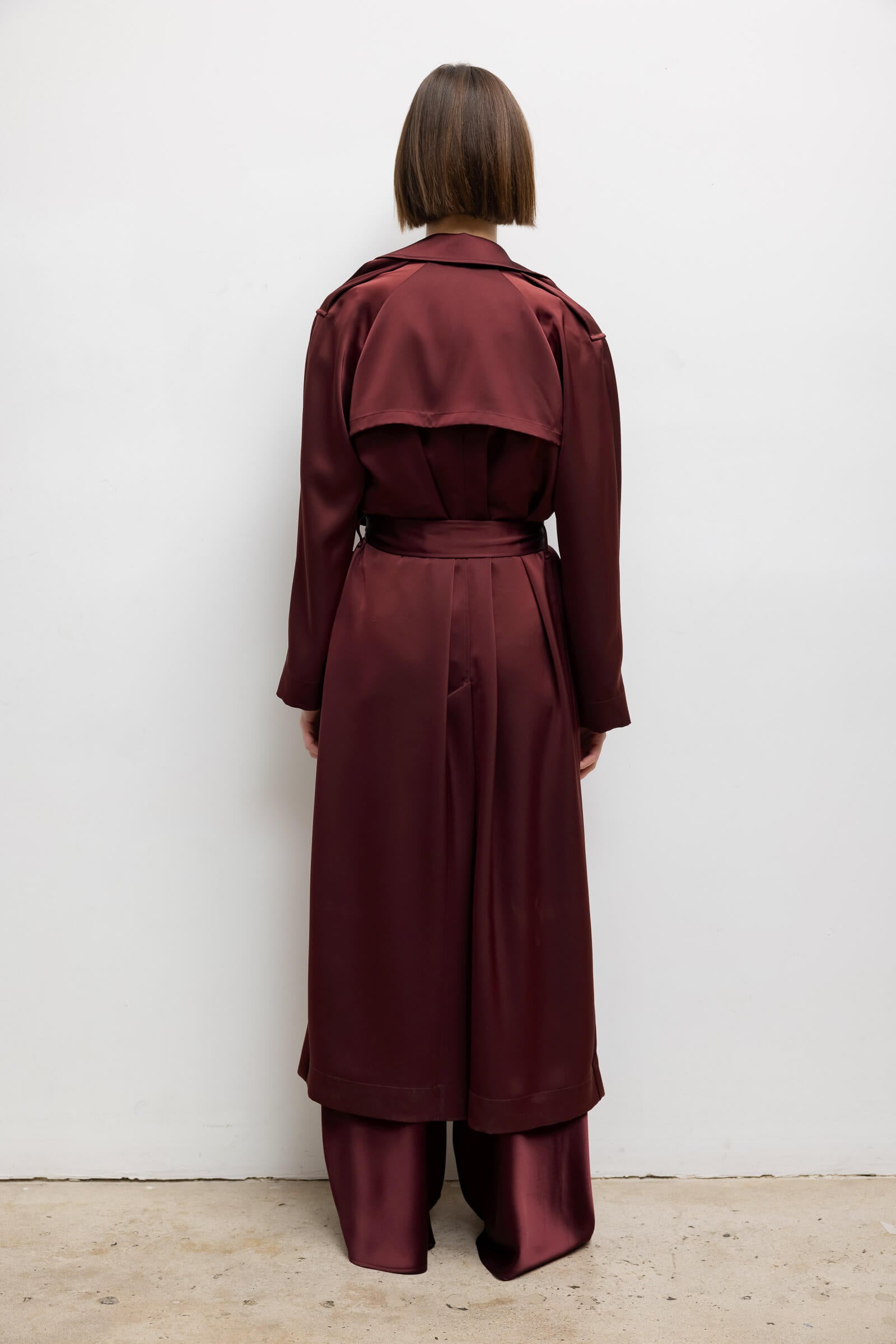 Cut in our best-selling Japanese-crafted satin, The Barb Classic Trench features a full, sweeping length, classic notched lapels, and an adjustable belt. Wear it over any of the The Barb Set in Bordeaux for a complete matching look.