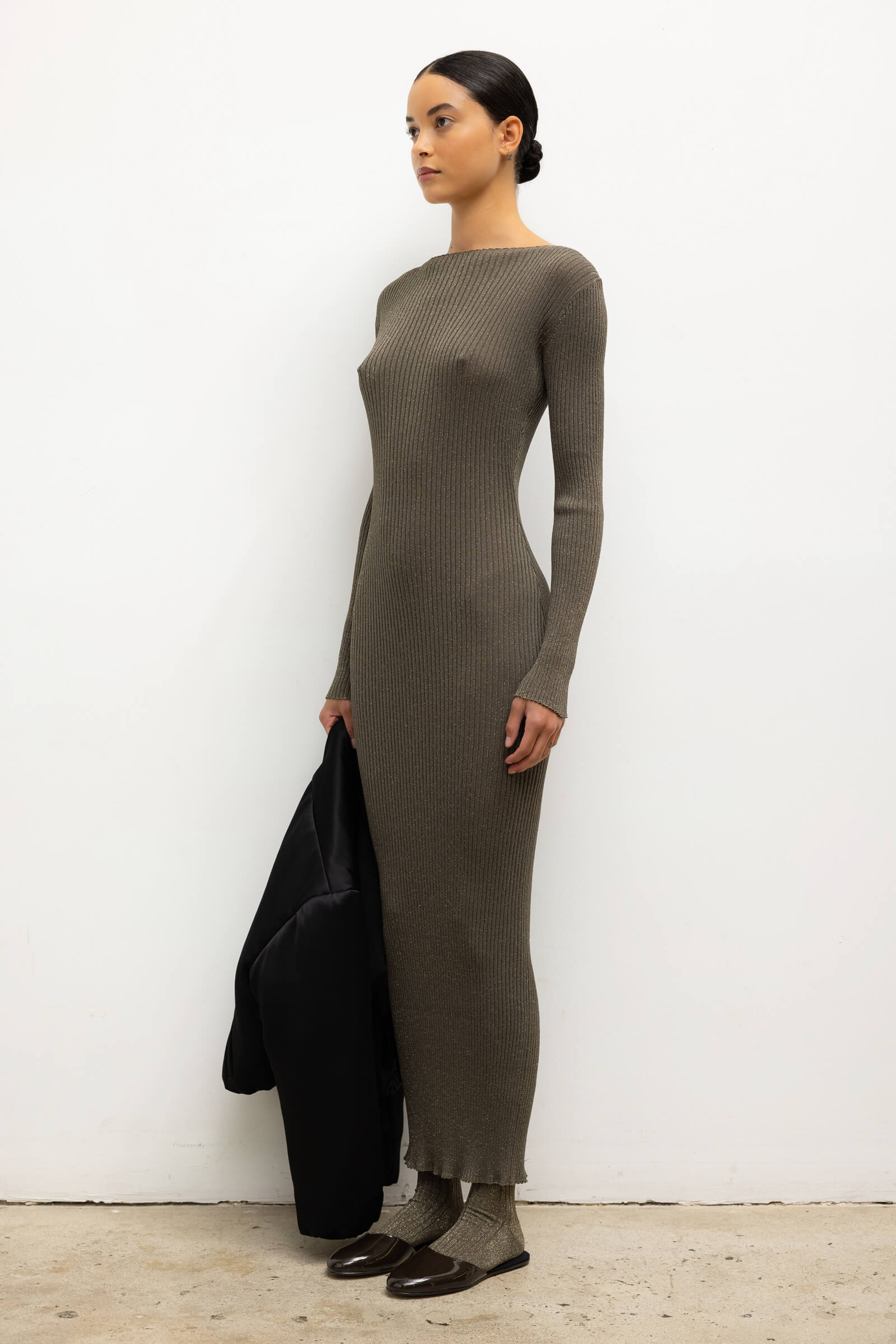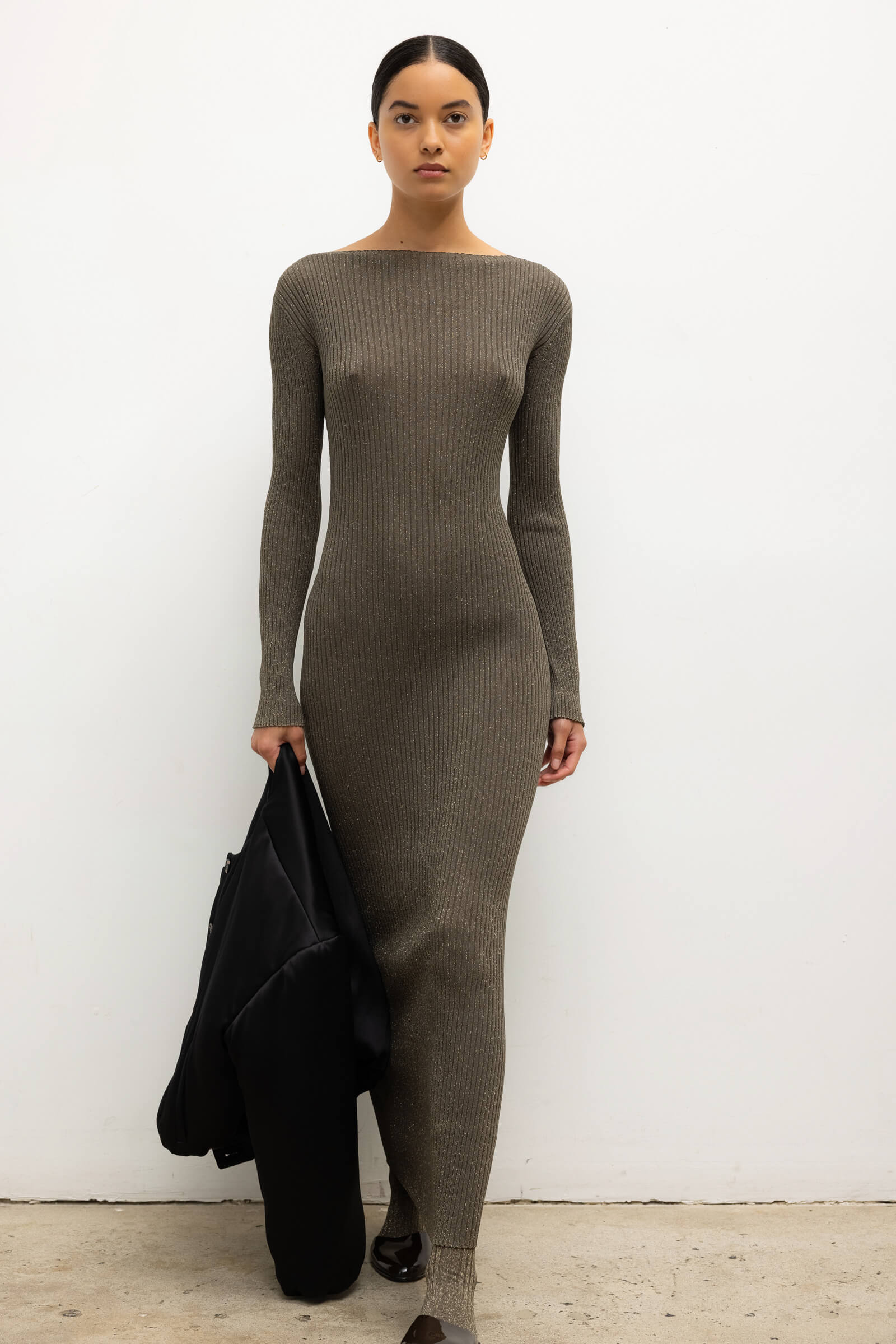Knit in our extra fine Blake Lurex, The Blake Rib Long Sleeve Maxi Dress is a fitted silhouette with a straight neckline and full length sleeves. Make it a matching set with The Blake Rib Crew Cardigan.