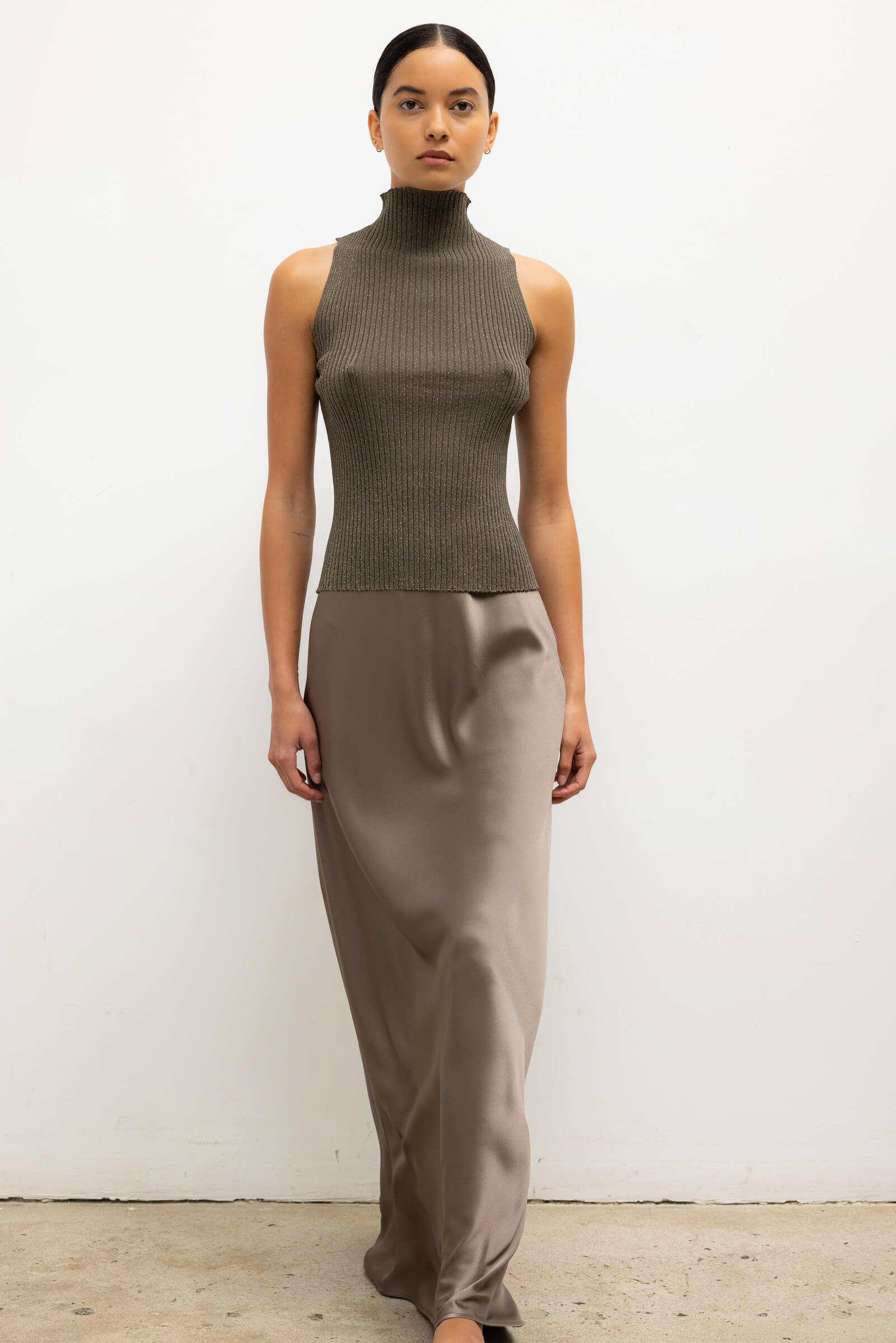 Knit in our extra fine Blake Lurex, The Blake Rib Crew Cardigan is a close fitting shell silhouette finished with a high neckline. Make it a matching set with The Blake Rib Crew Cardigan or mix it tonally with The Barb Set in Taupe.