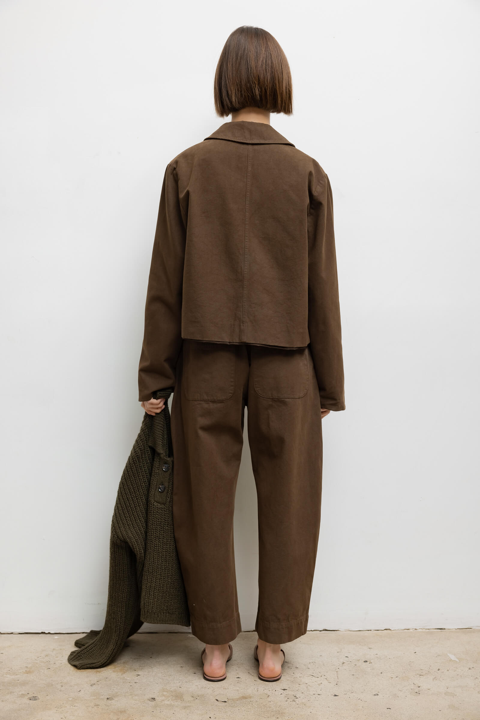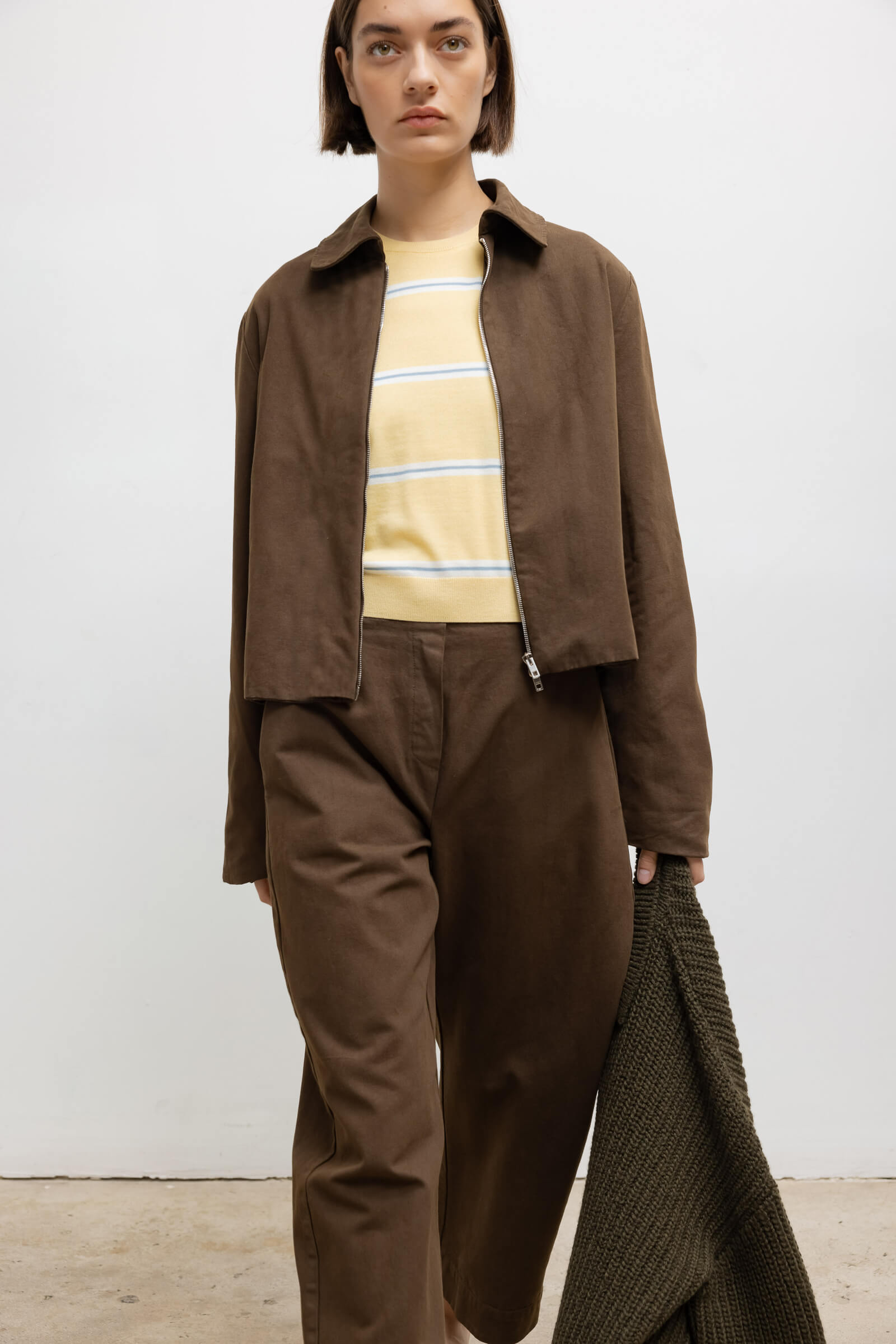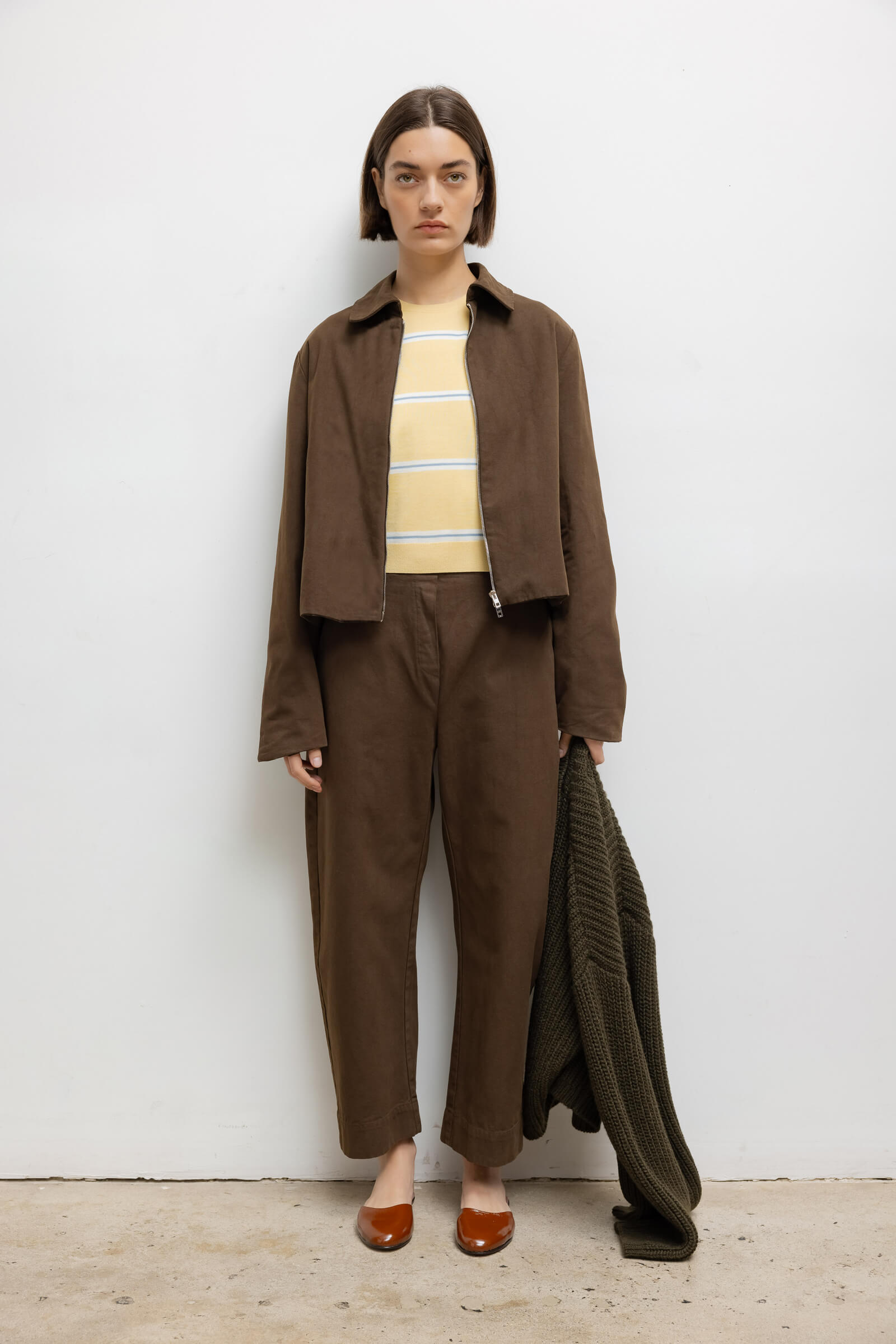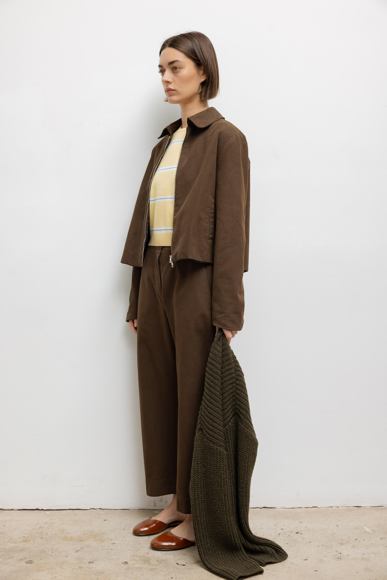 Cut in our new brushed Chloe Canvas, The Chloe Zip Jacket is the easiest third layer. This boxy silhouette features a classic pointed collar, full length sleeves, and zip front closure. Make it a matching set with The Chloe Barrel Pant.