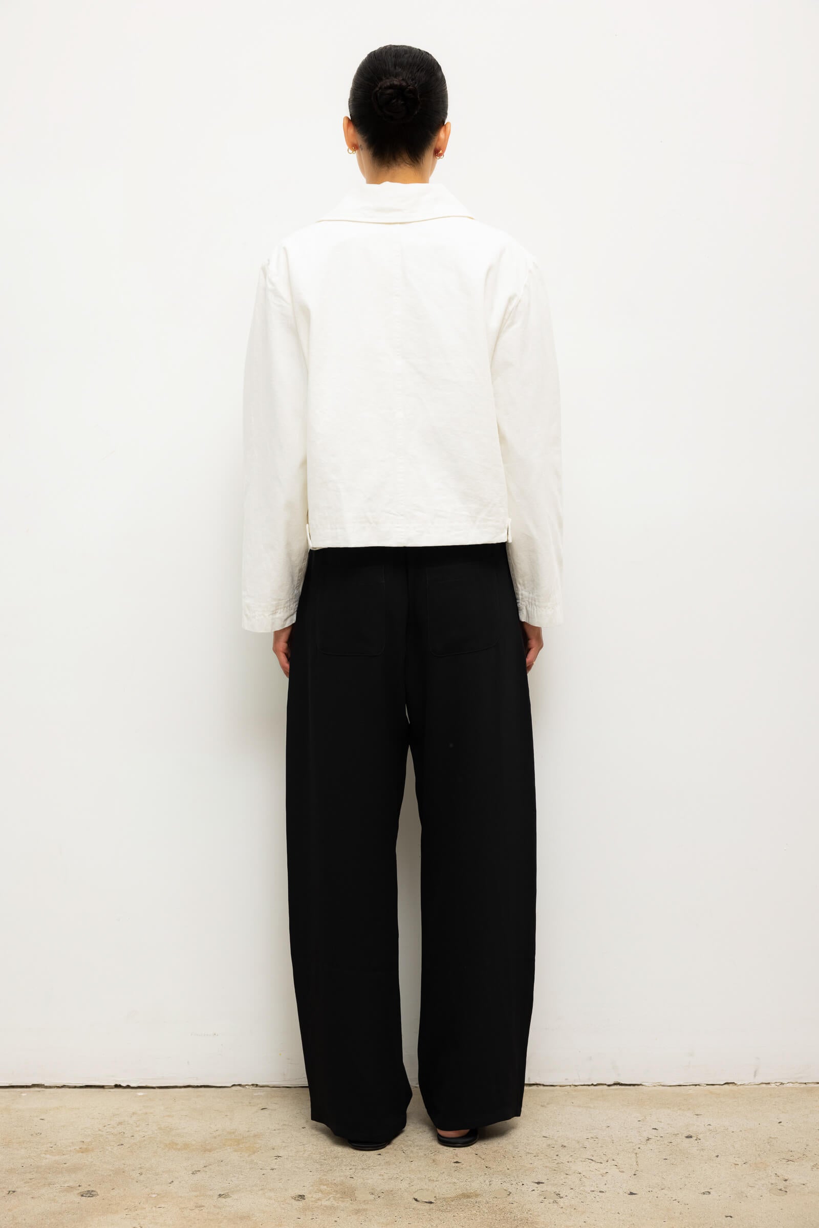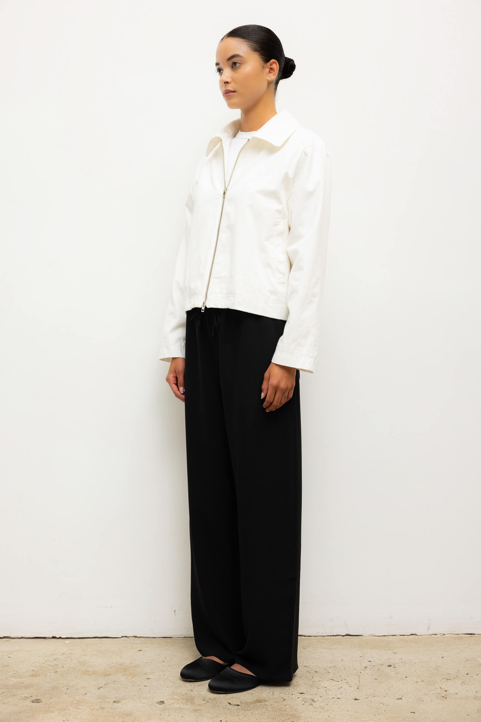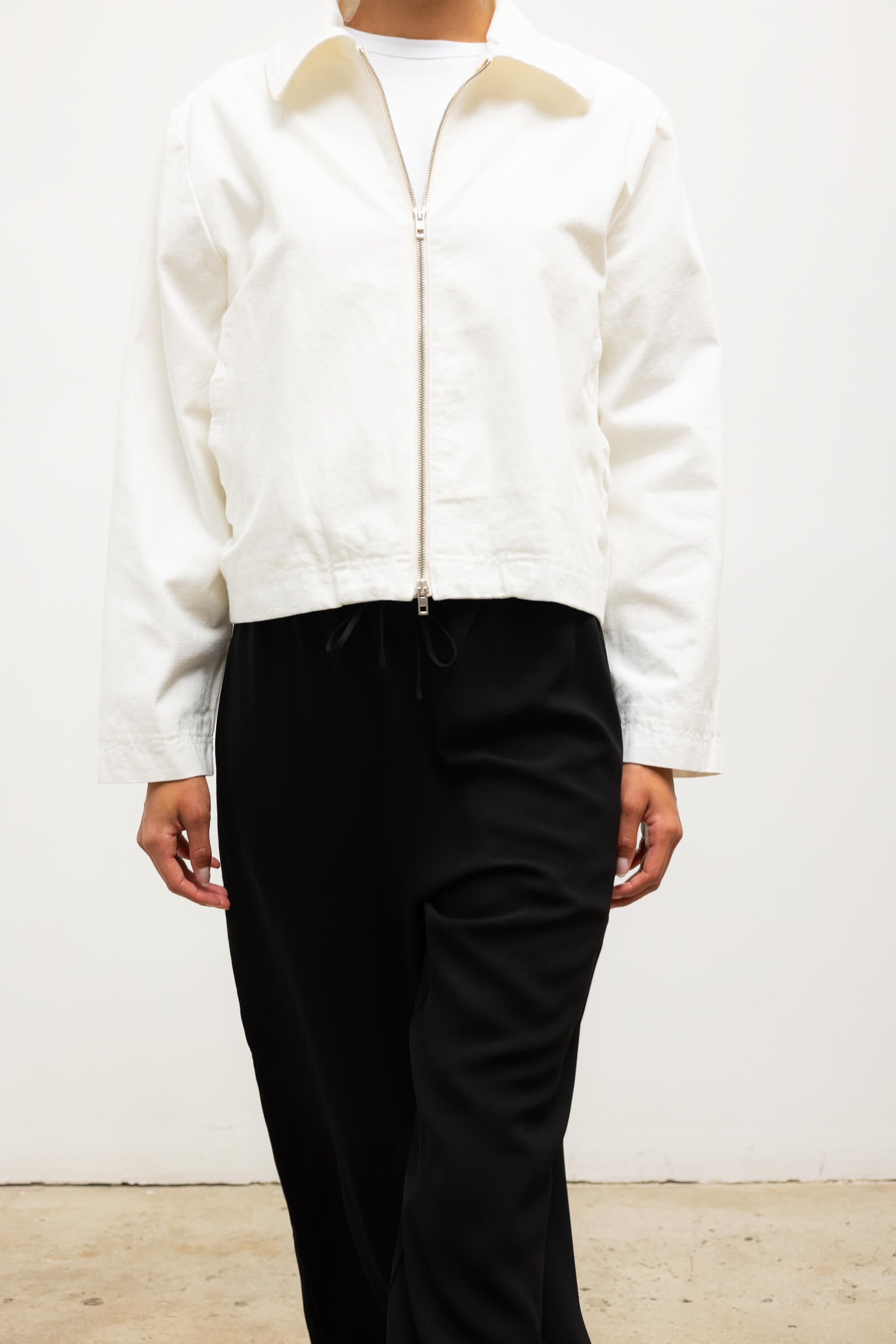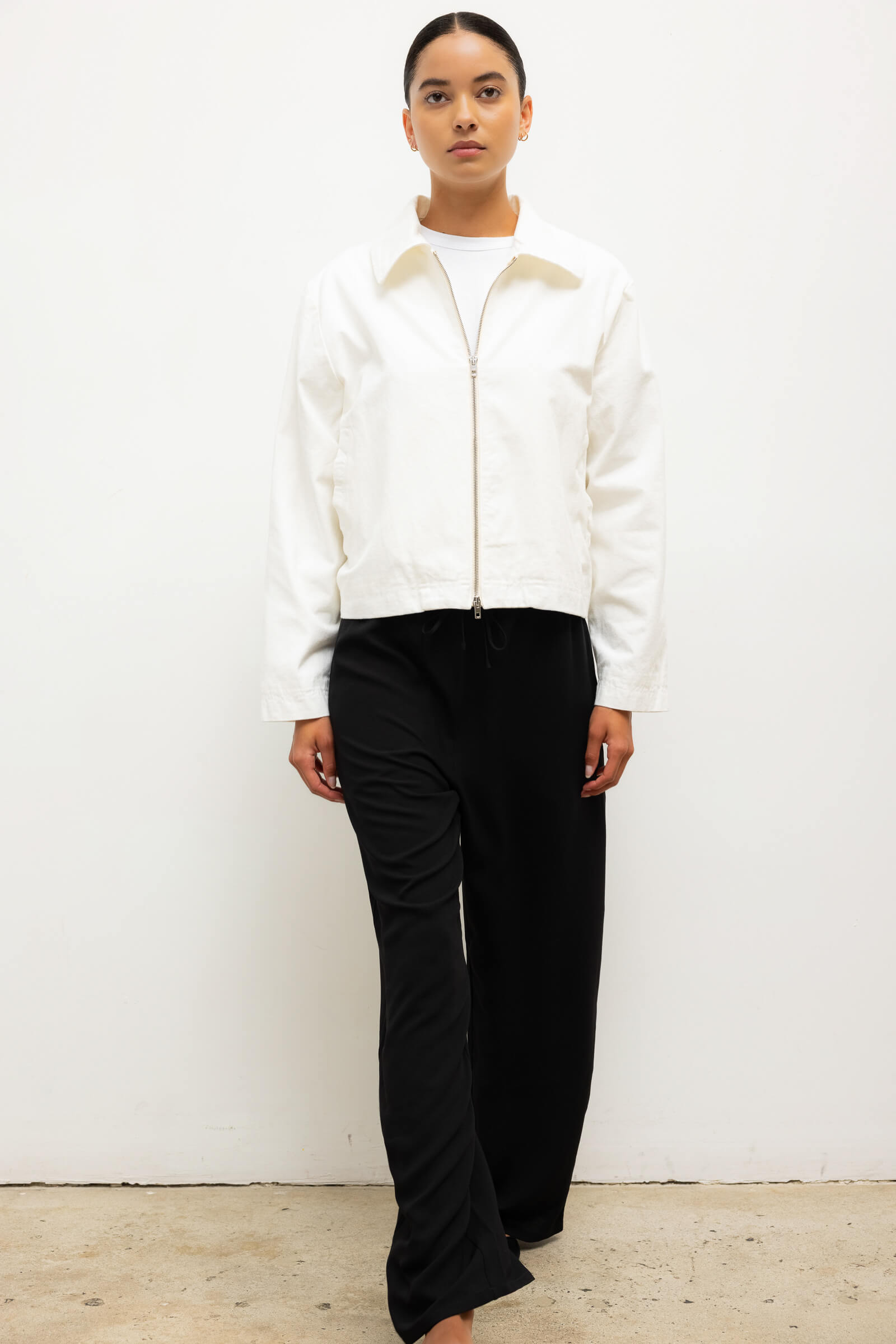 Cut in our new brushed Chloe Canvas, The Chloe Zip Jacket is the easiest third layer. This boxy silhouette features a classic pointed collar, full length sleeves, and zip front closure. Make it a matching set with The Chloe Barrel Pant.
