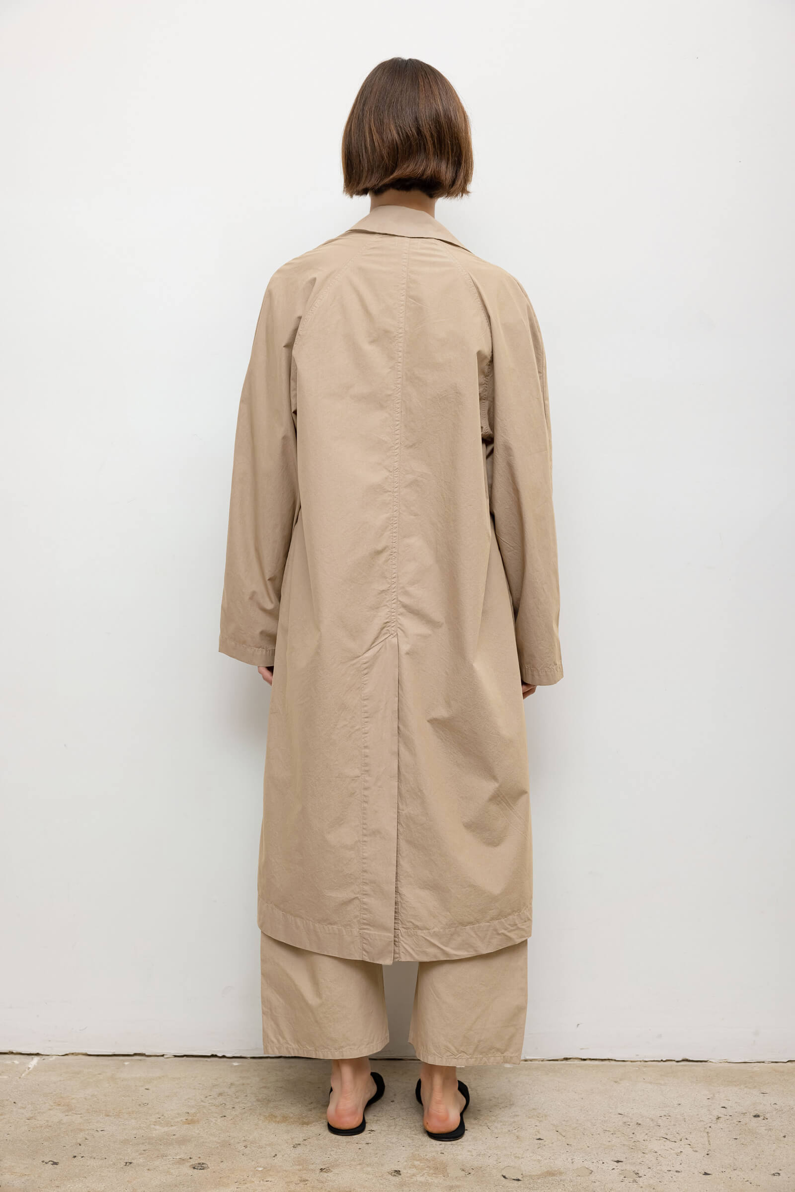 Transition seamlessly throughout the seasons in the crisp, 100% cotton Kyoto Car Coat. This timeless silhouette features a slightly oversized fit, with a classic pointed collar, horn button front closure, back slit detail, and side pockets.
