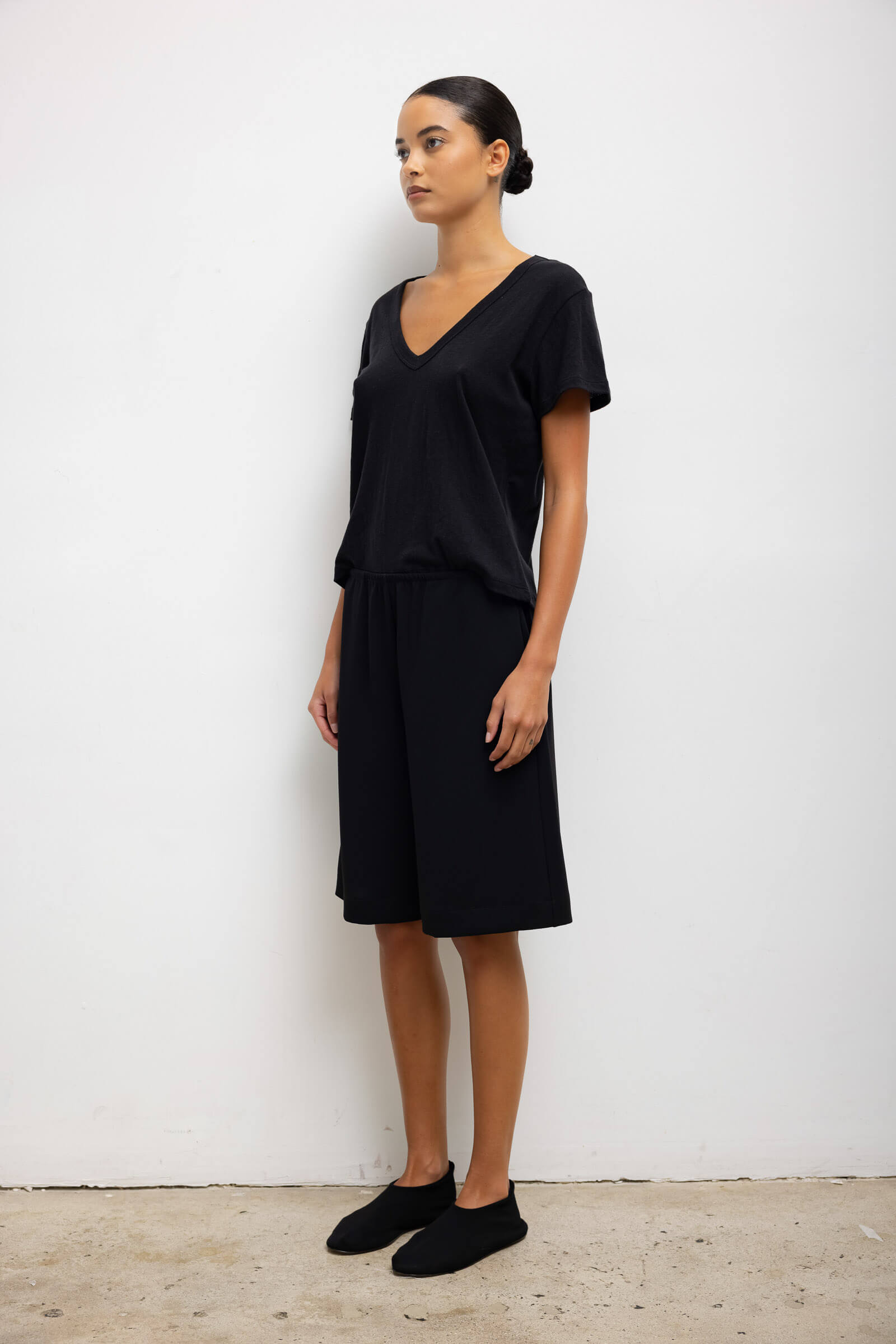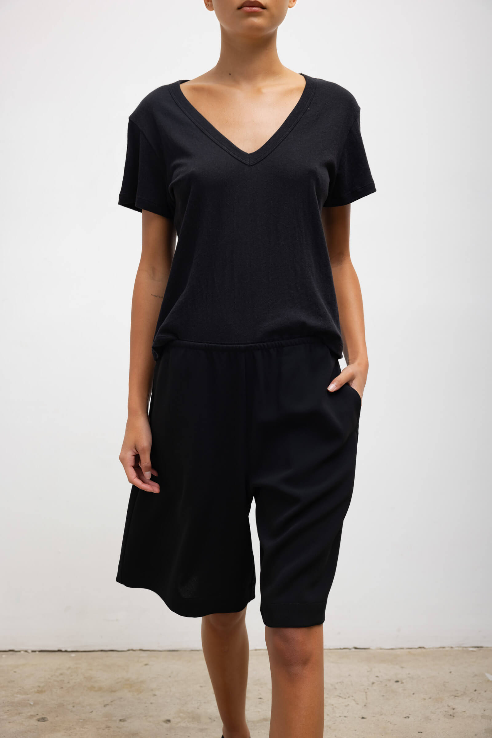 Cut in our feather light Laura Cotton, The Laura V Neck Tee features a wide V neckline, boxier silhouette, and short sleeves.