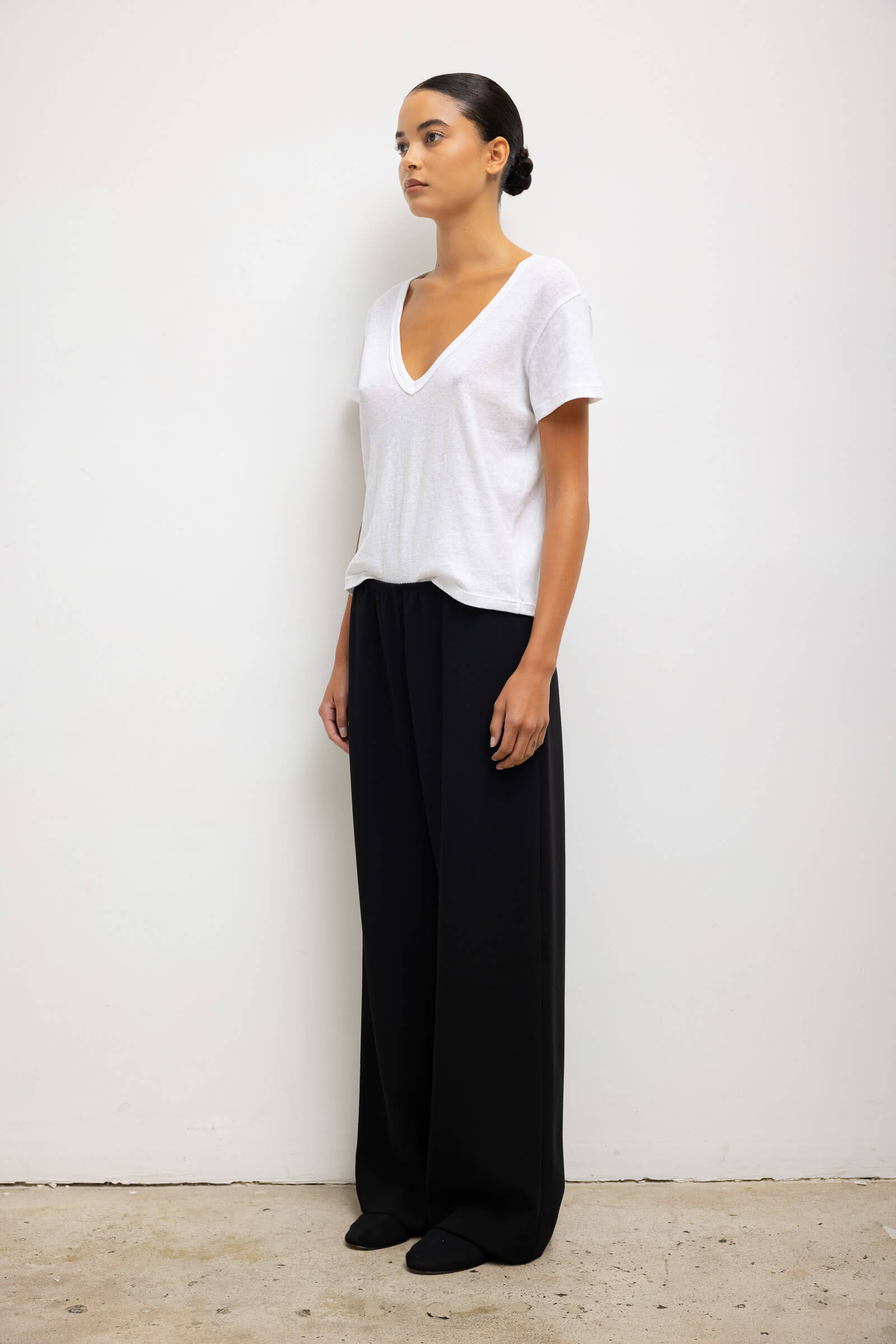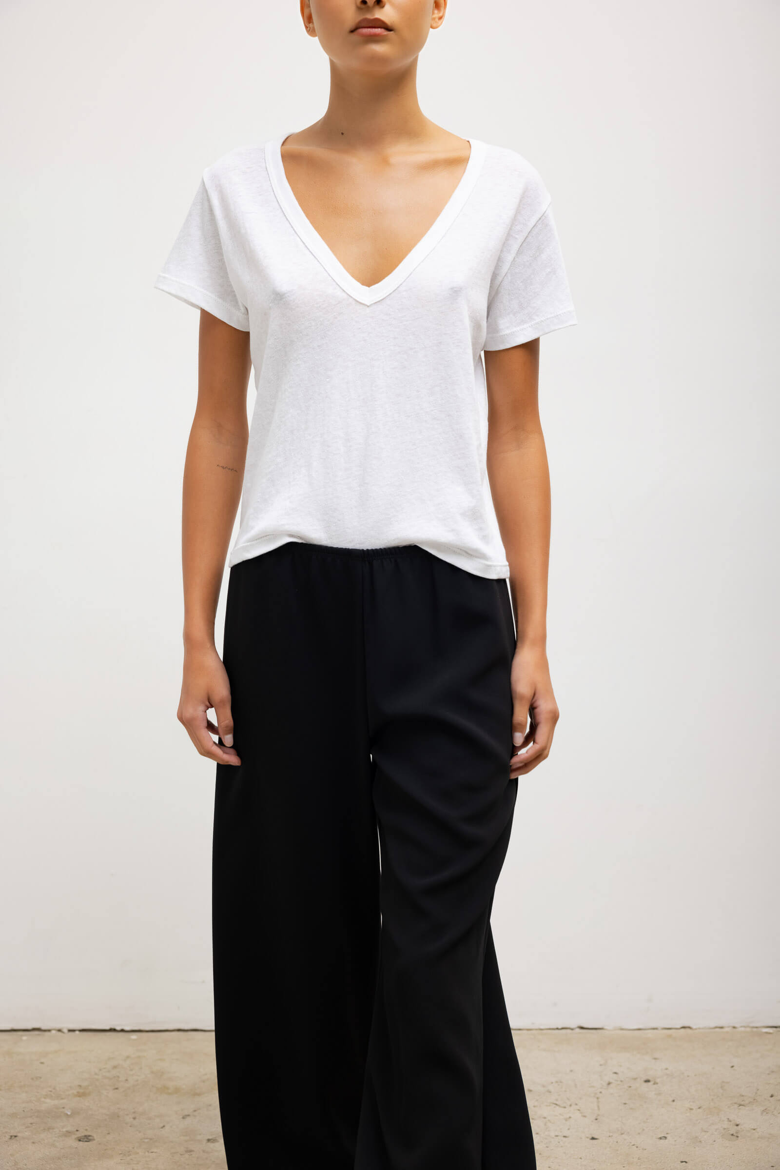 Cut in our feather light Laura Cotton, The Laura V Neck Tee features a wide V neckline, boxier silhouette, and short sleeves.