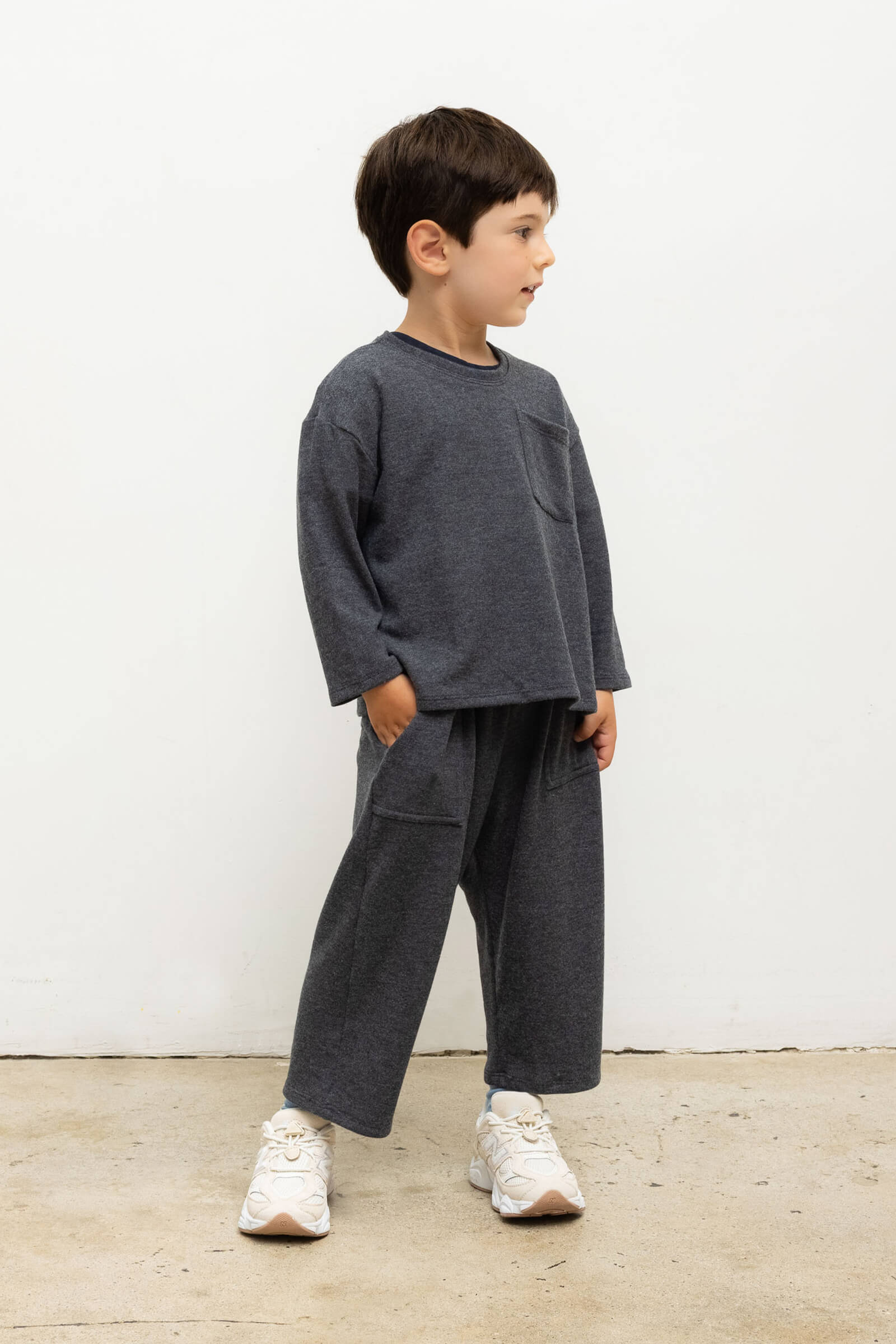 Cut in our buttery soft Lauren Sweater Jersey, The Lauren Bebe Long Sleeve Pocket Tee is a classic crewneck long sleeve with a tiny patch pocket at front. Match with mom in The Lauren Set in Charcoal.