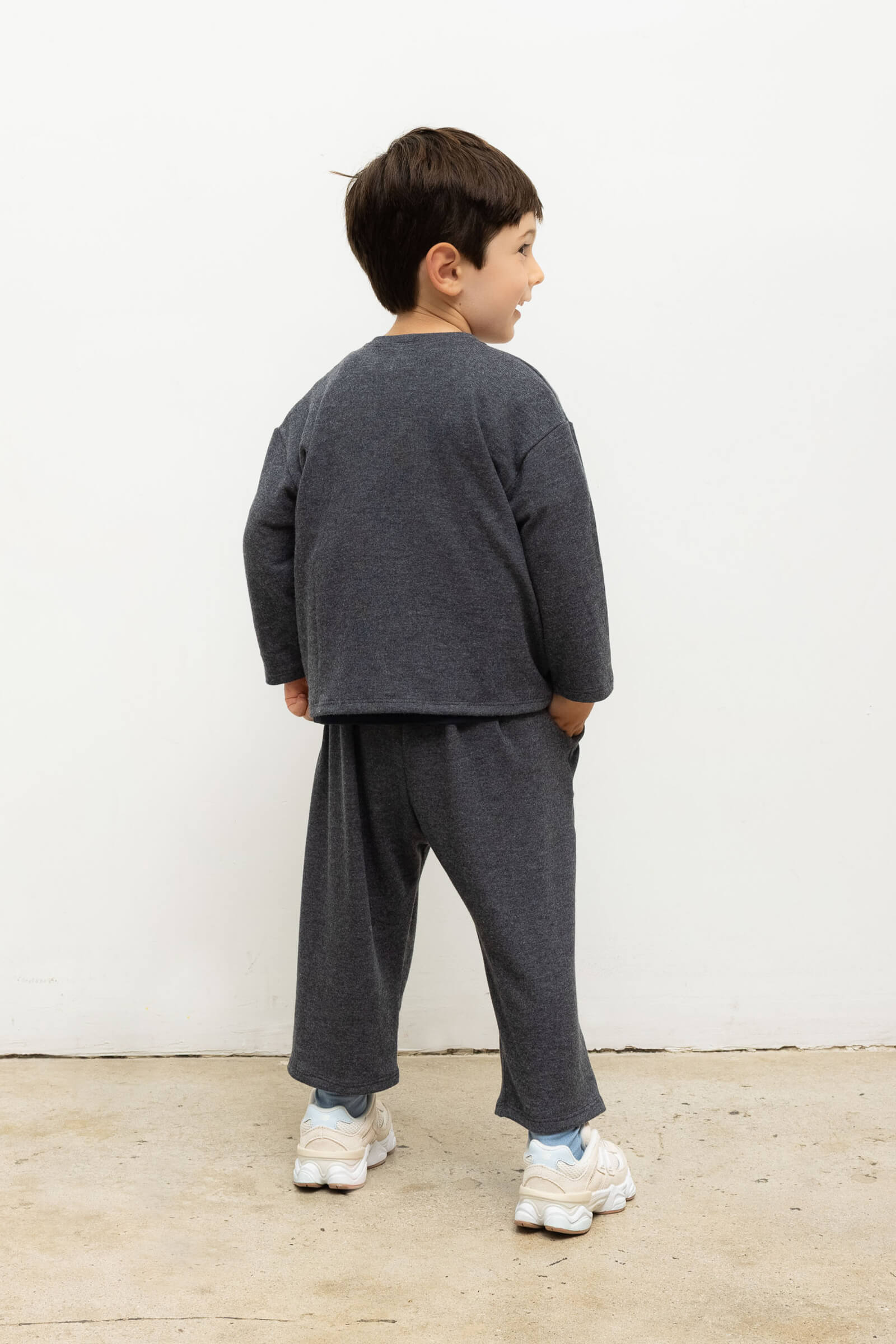 Cut in our buttery soft Lauren Sweater Jersey, The Lauren Bebe Pocket Pant is an easy pull on style pant with tiny side pockets and a soft elastic waistband. Match with mom in The Lauren Set in Charcoal.