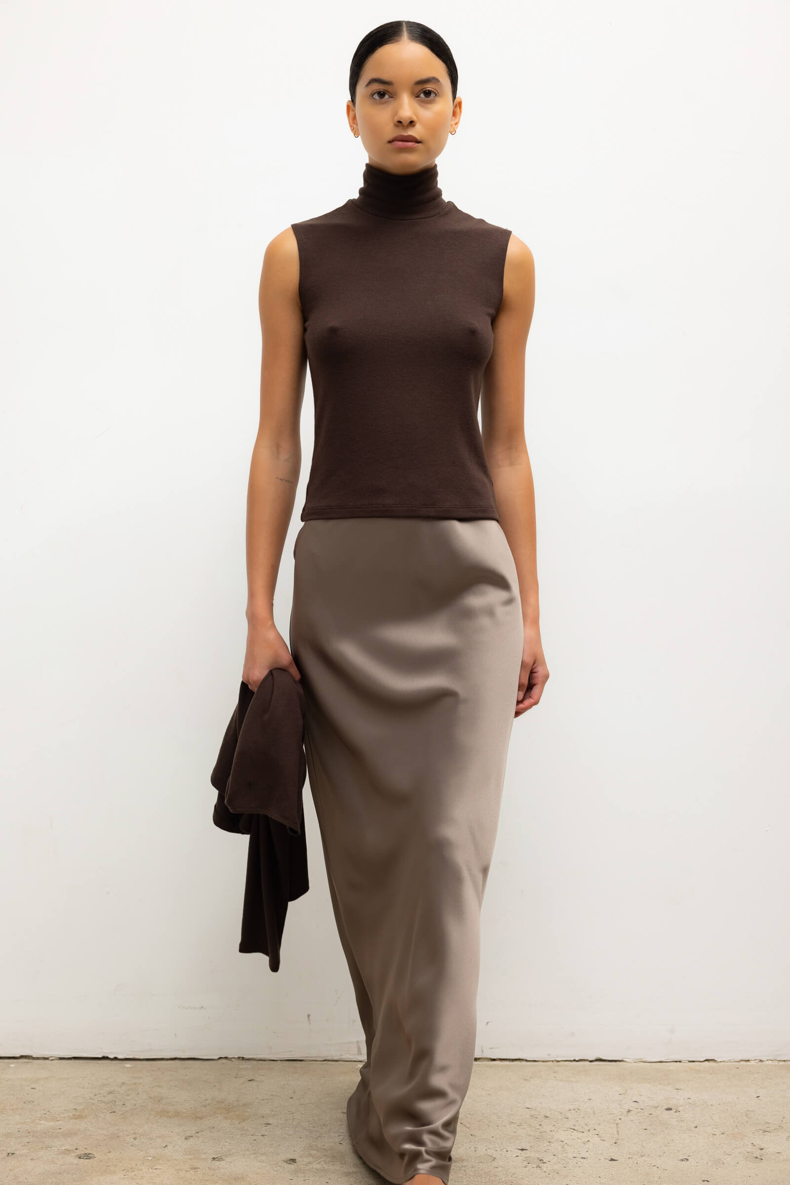 A foundation staple. Cut in our buttery soft brushed sweater jersey, The Lauren Sleeveless Turtleneck features a slightly fitted silhouette and a flexibly styled turtleneck. We're styling this underneath weightier knits, like The Zoe and Jesse - and as a matching set, of course, with the Lauren bottoms in Chocolate.