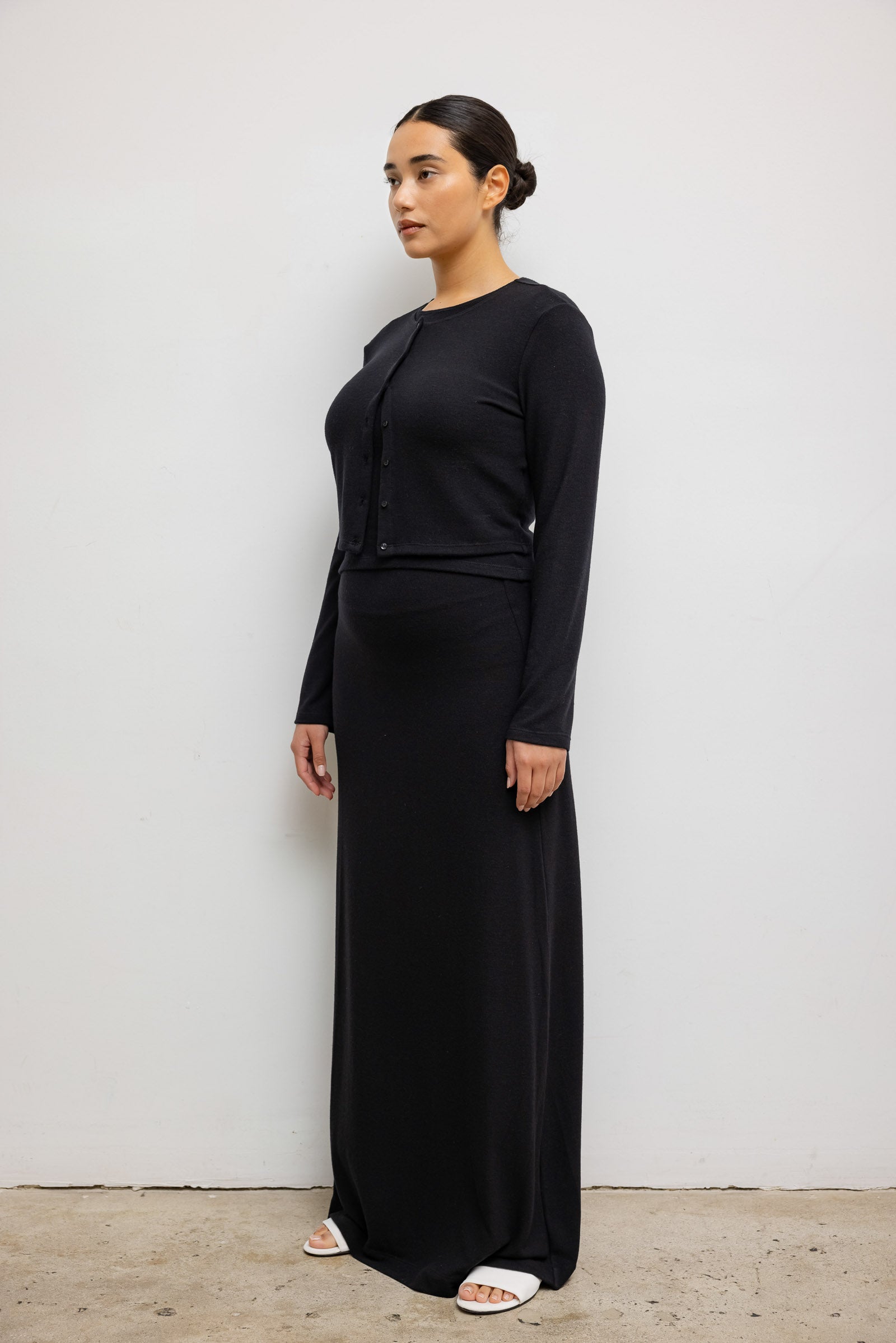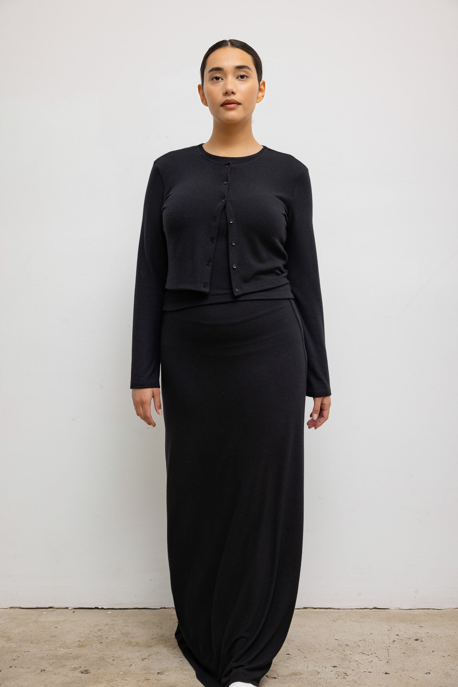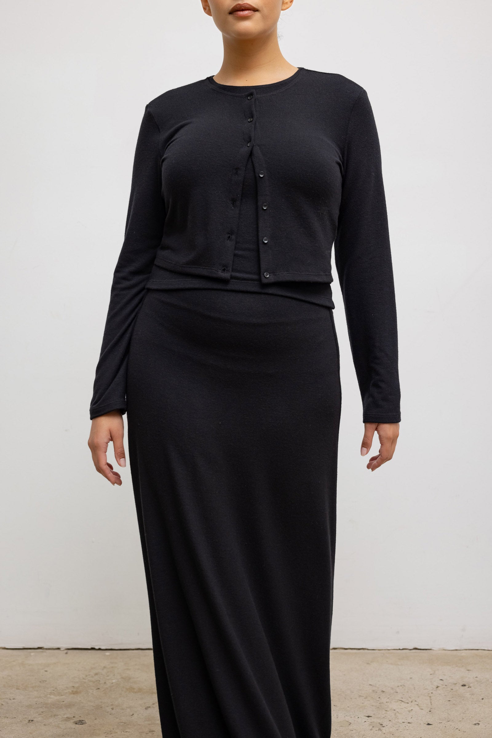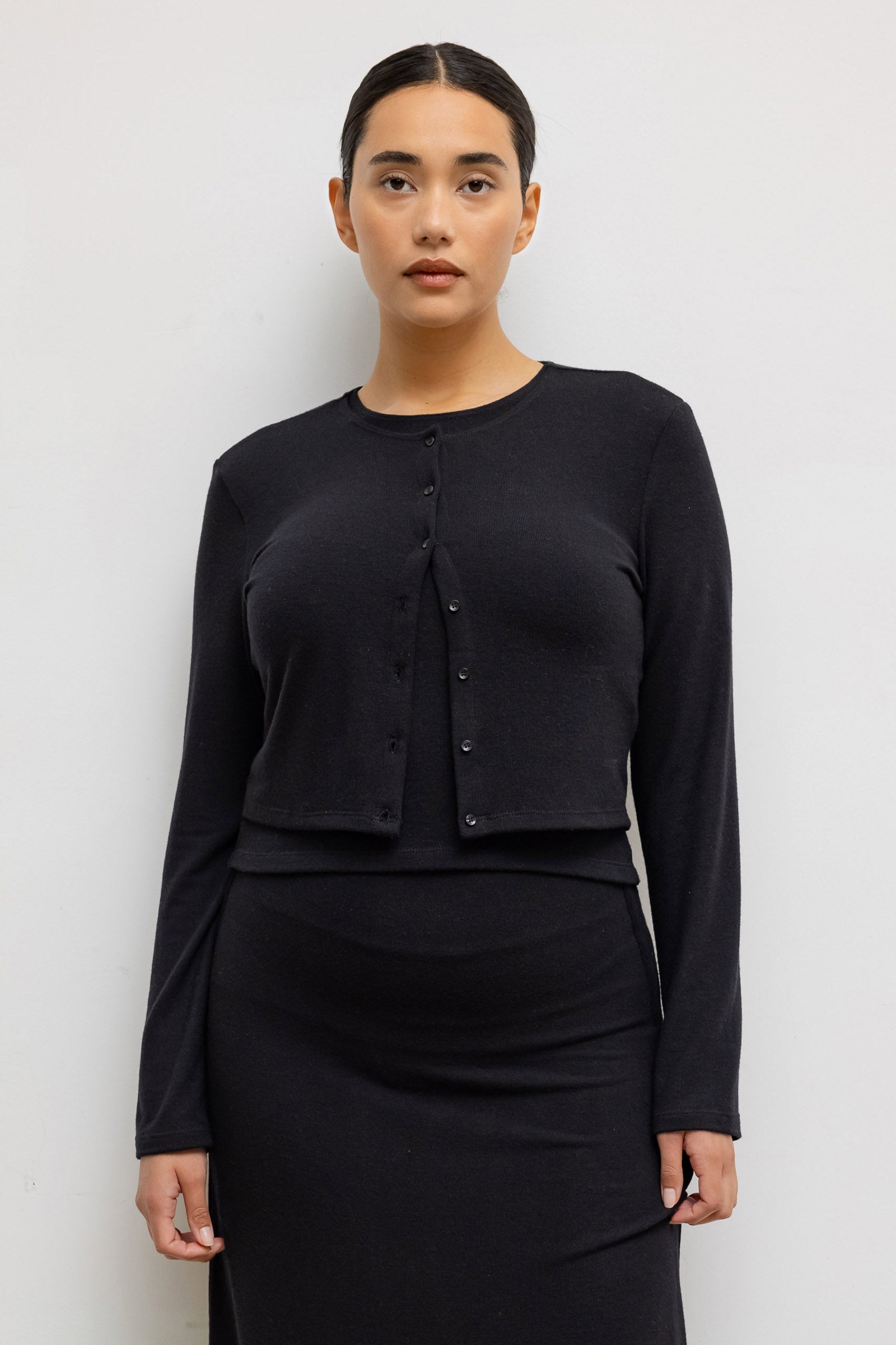 Cut in our buttery soft Lauren Sweater Jersey, The Lauren Crop Cardigan II is our bestselling everyday cardigan silhouette, featuring a cropped length, fitted full length sleeves and front button closure. We throw this over everything — t-shirts, turtlenecks, dresses, or by itself as a top.