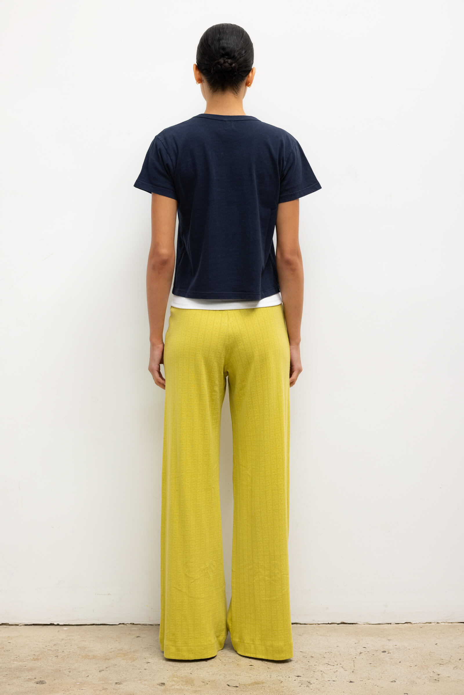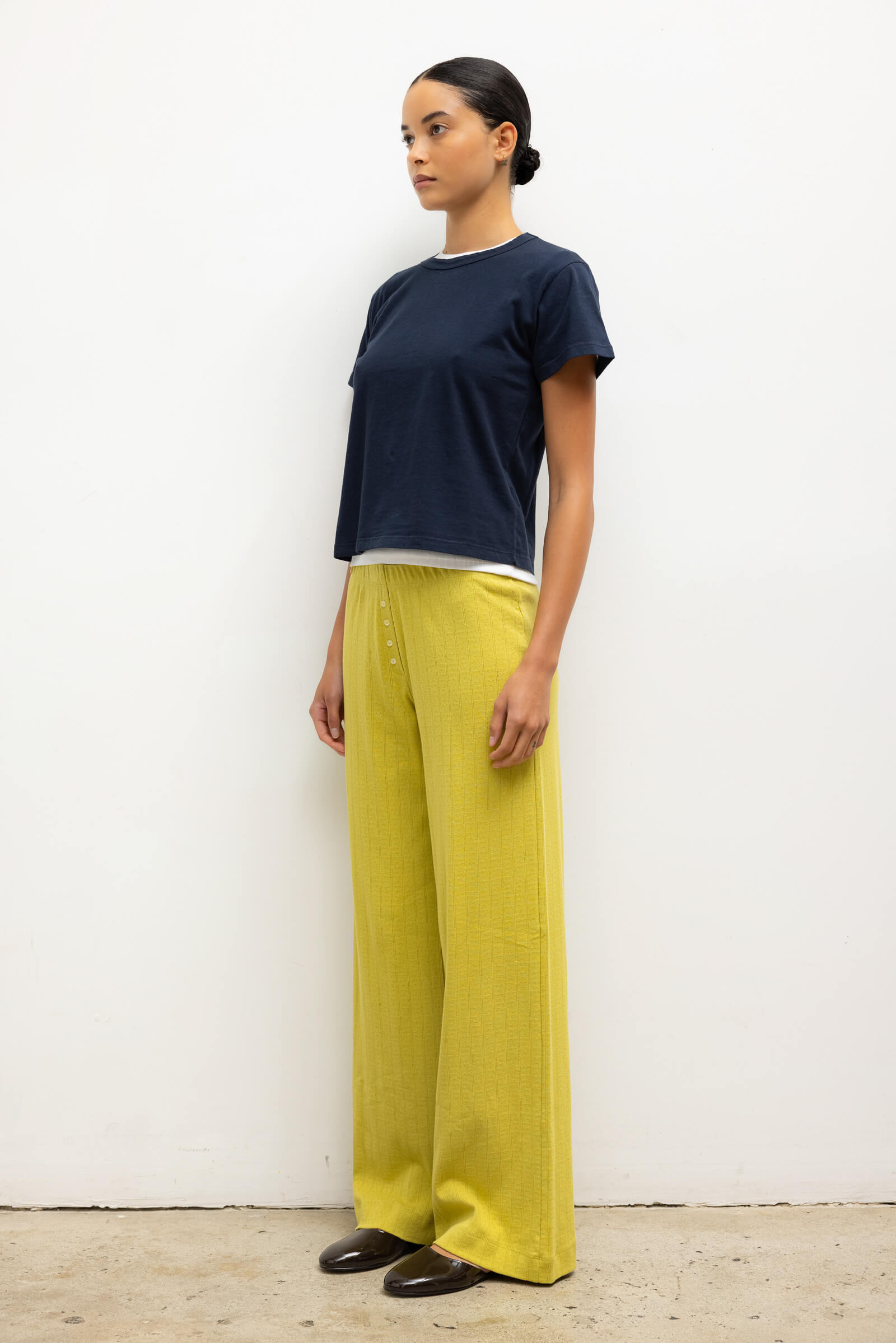 Cut in our nostalgic Pointelle Cotton, The Pointelle Boxer Pant is a wide leg pull-on style pant featuring our signature pinhole stripes, dainty eyelets, tonal henley buttons and a comfortable elasticized waistband that sits at the natural waist. Now in limited edition Chartreuse.