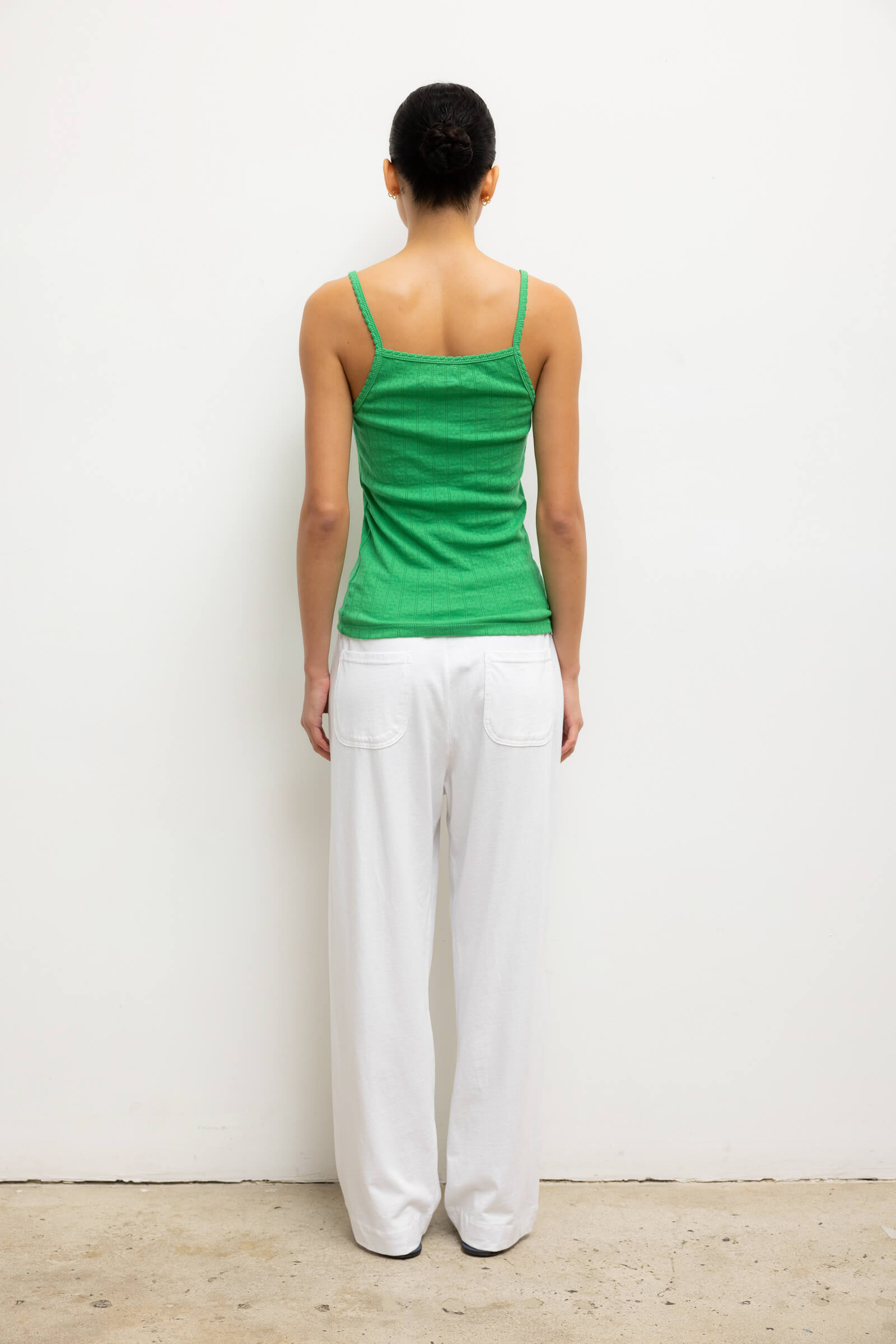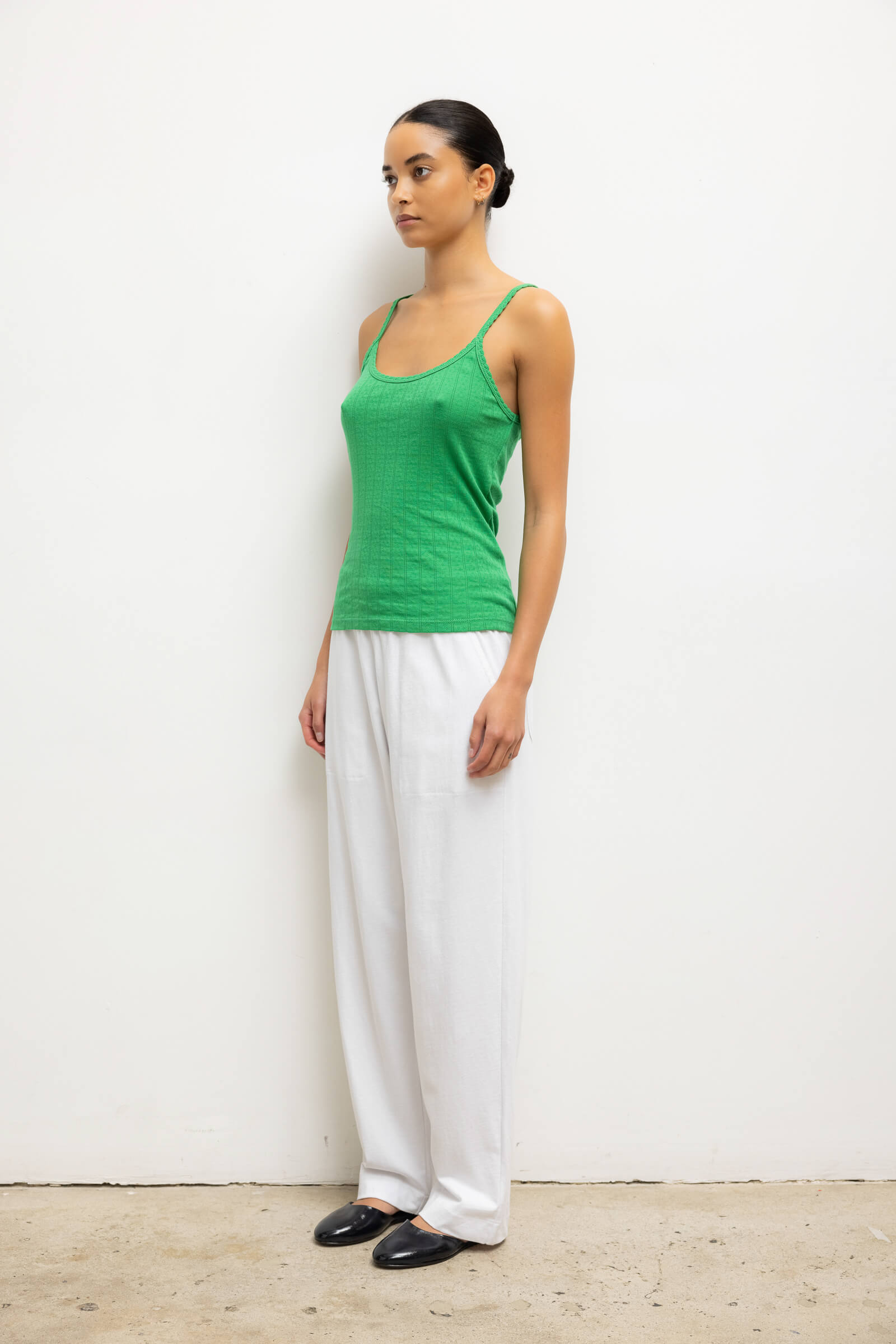 Cut in our nostalgic Pointelle Cotton, The Pointelle Tank is a classic spaghetti strap silhouette, featuring our signature pinhole stripes, dainty eyelets and scalloped edging. Wear this by itself, or layered underneath the matching Pointelle Classic Crew Cardigan.