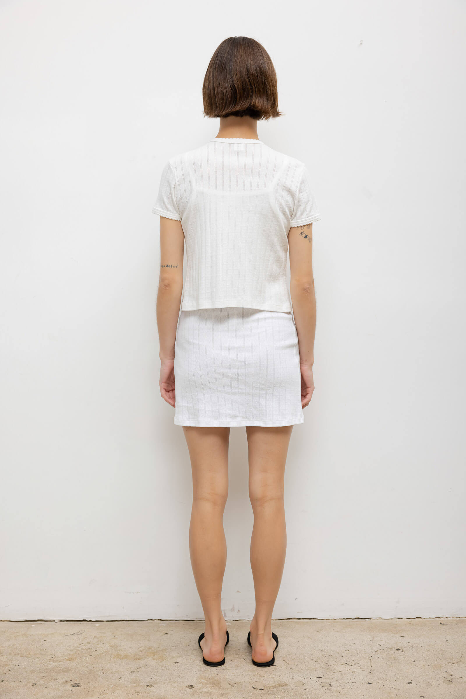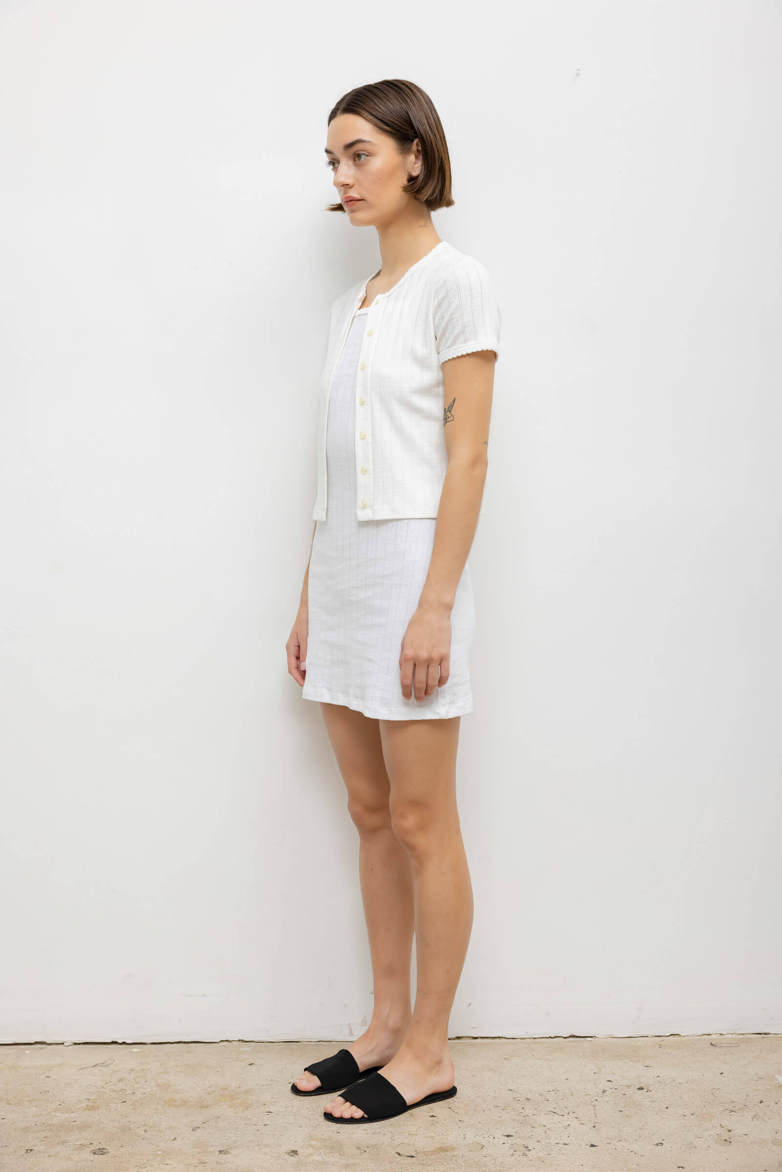 Cut in our nostalgic Pointelle Cotton, The Pointelle Short Sleeve Cardigan features a crew neckline, short sleeves and our signature pinholes stripes, dainty eyelets, tonal buttons and scalloped edging. Wear it buttoned up by itself or open with our new Pointelle Square Neck Mini Dress.