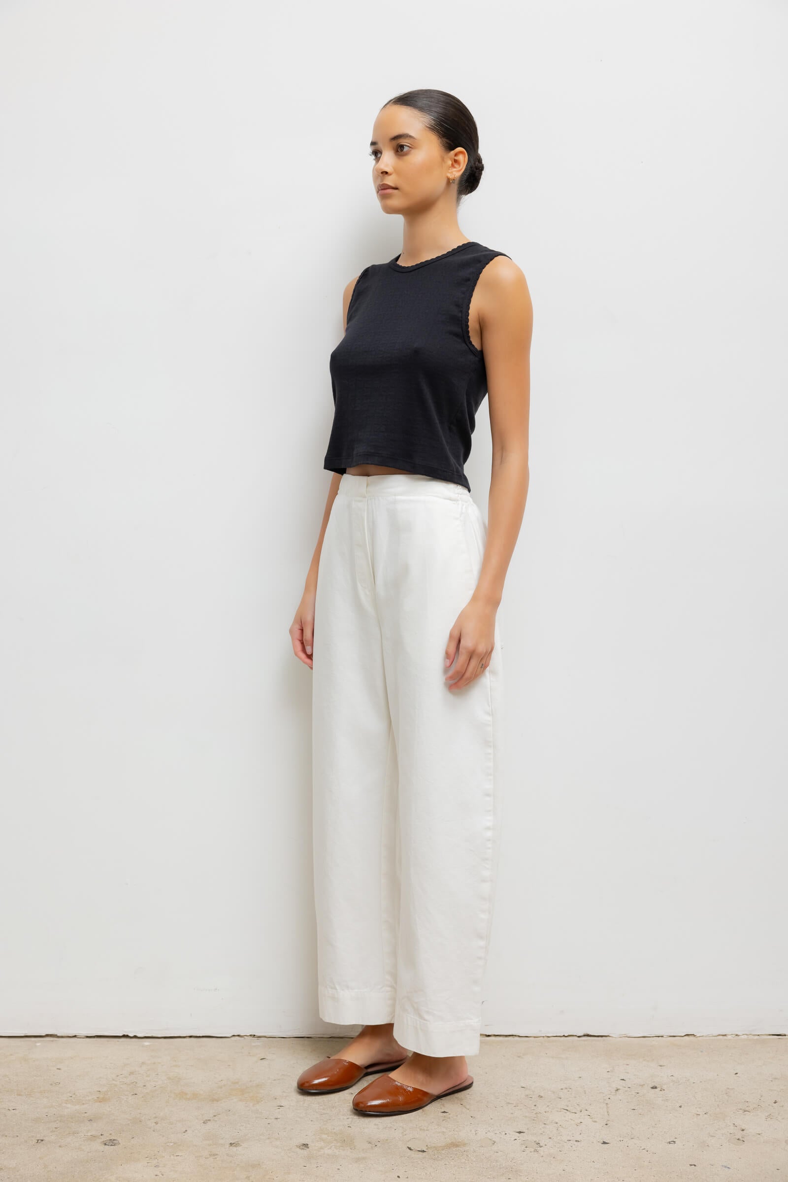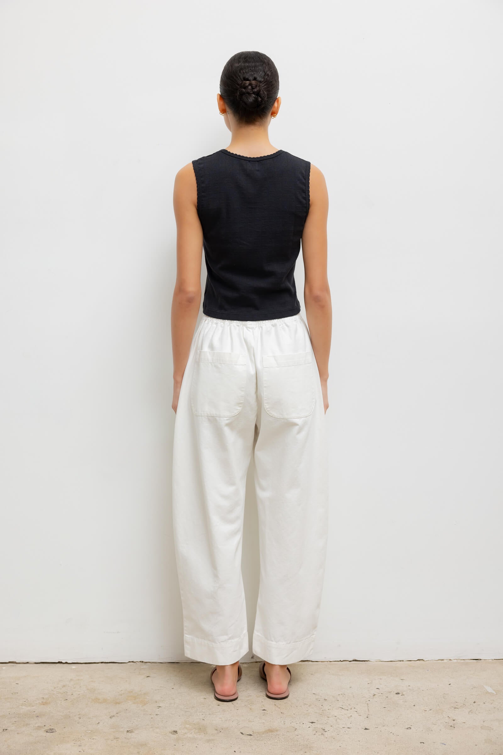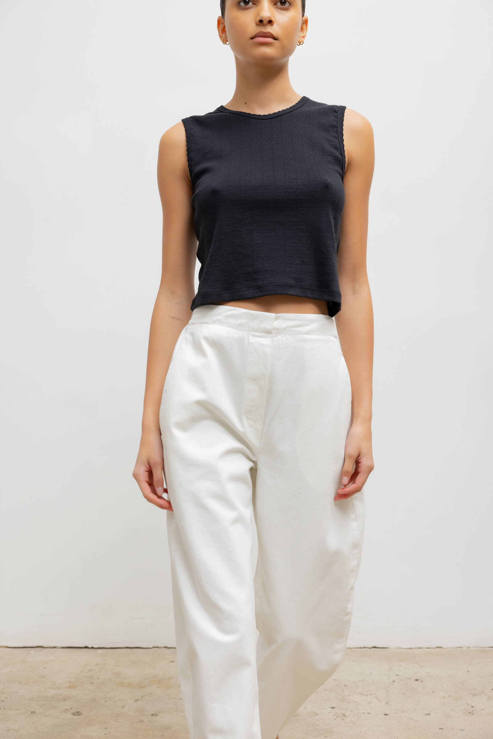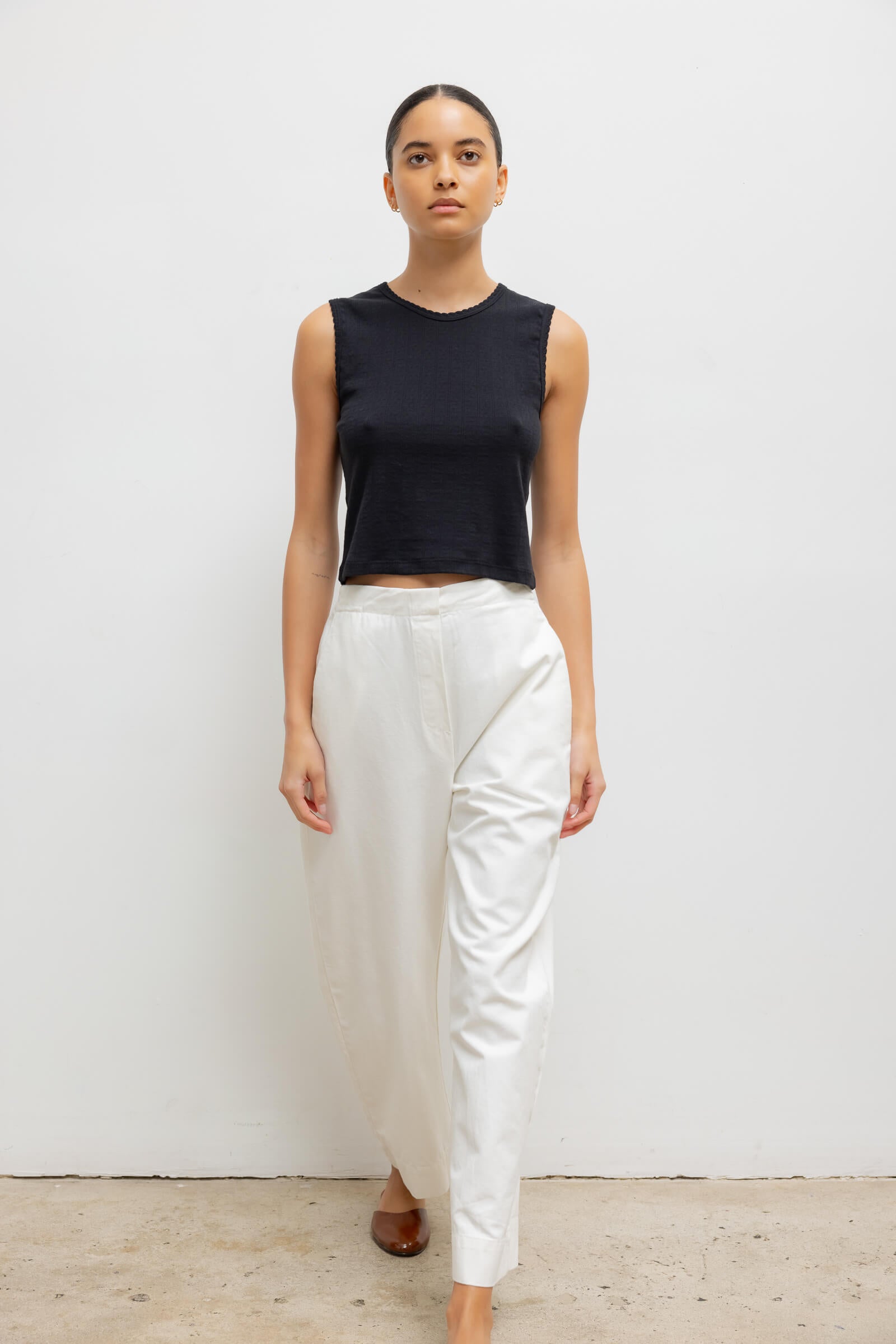 Cut in our nostalgic Pointelle Cotton, The Pointelle Sleeveless is a classic bateau silhouette, featuring our signature pinhole stripes, dainty eyelets, and scalloped edging. We're dressing it down with our favorite Yoshi Carpenter Pant - then up with The Rio Side Slit Skirt and heels at night.