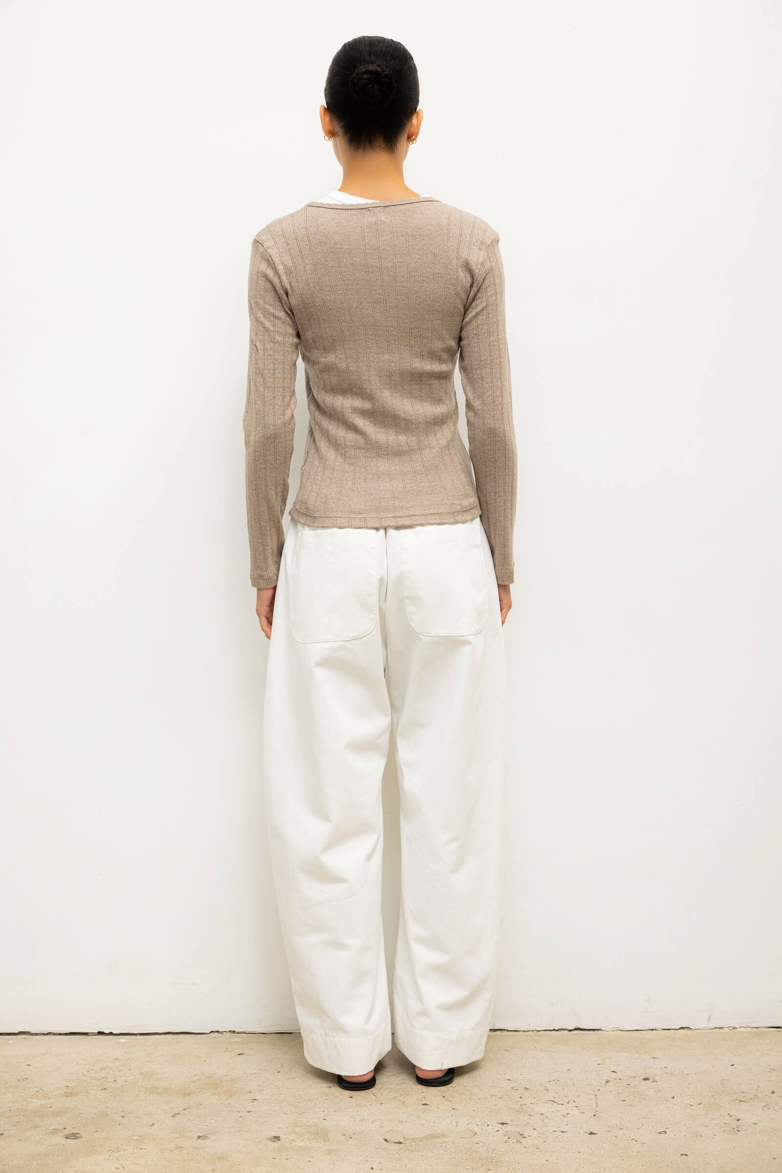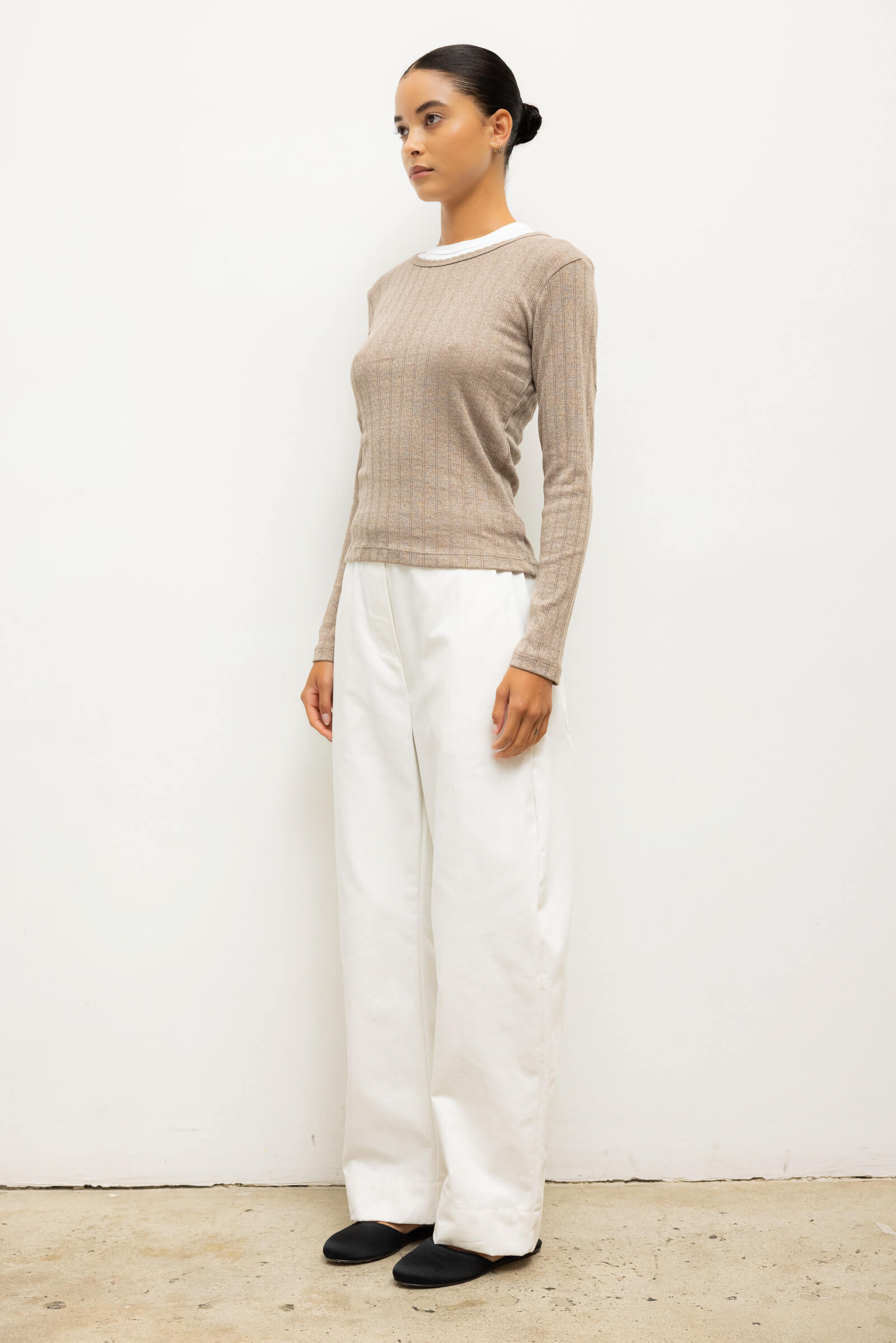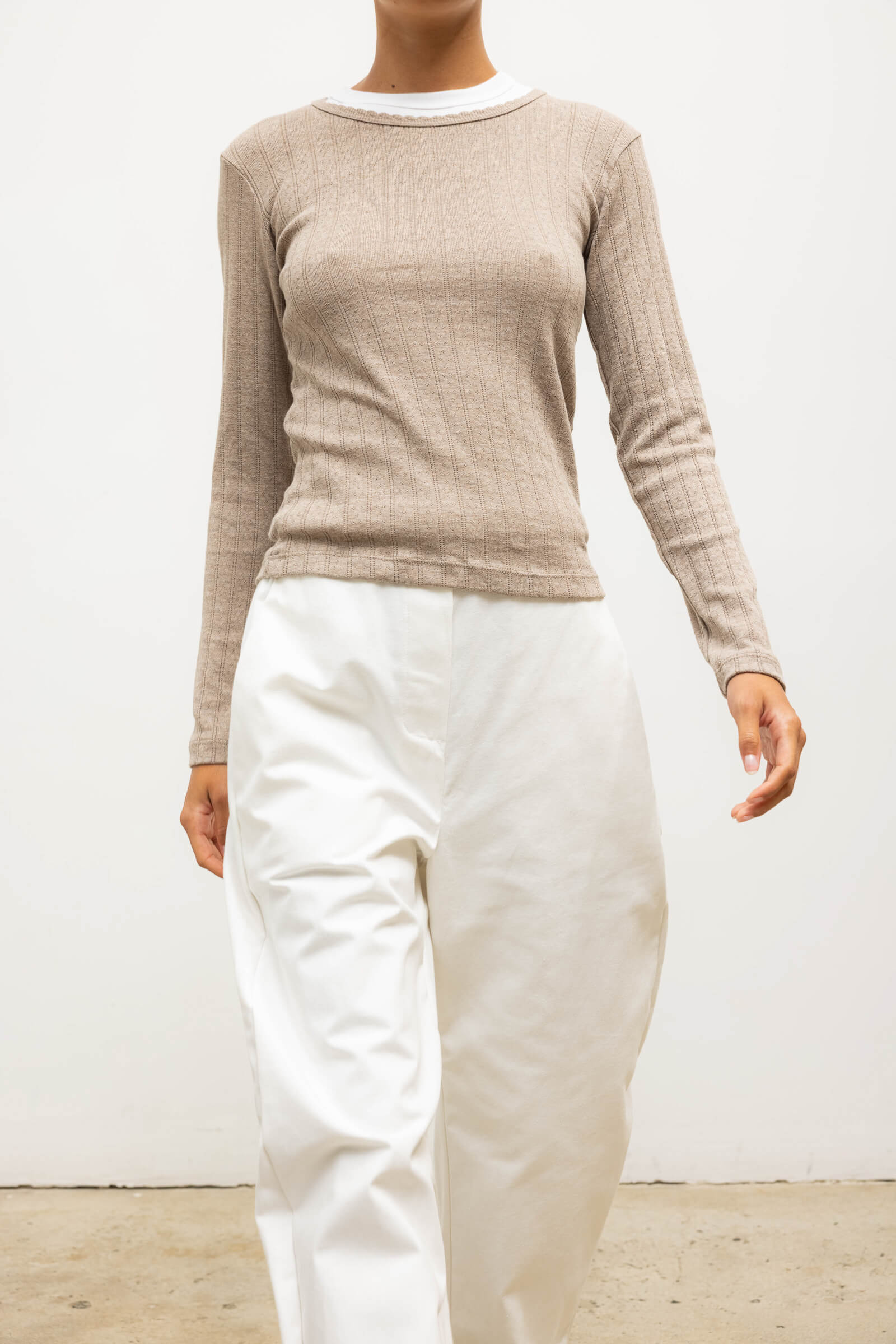 Cut in our nostalgic Pointelle Cotton, The Pointelle Slim Fit Long Sleeve features a classic crew neckline with our signature pinhole stripes, dainty eyelets, and scalloped edging. Full length with fitted long sleeves.