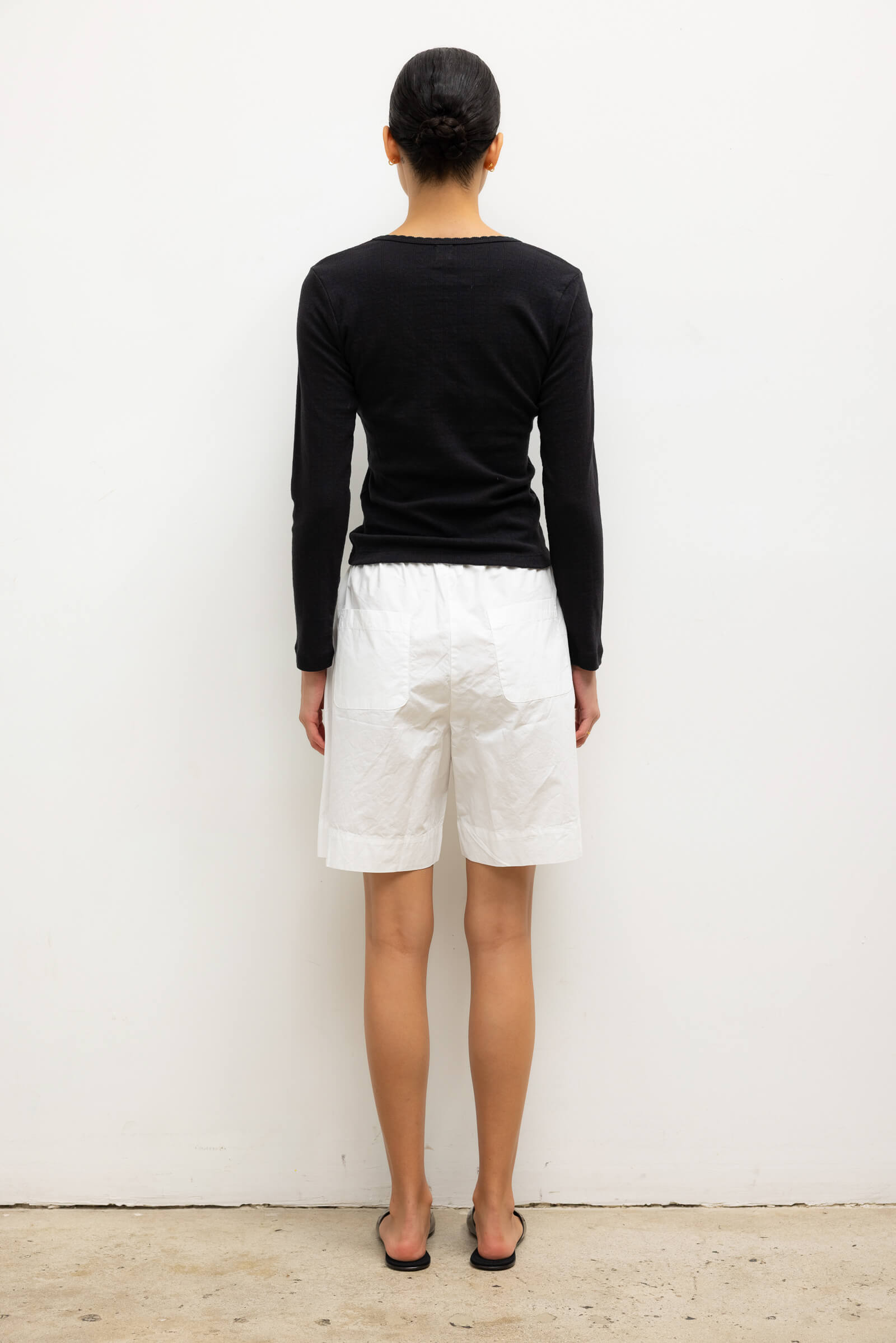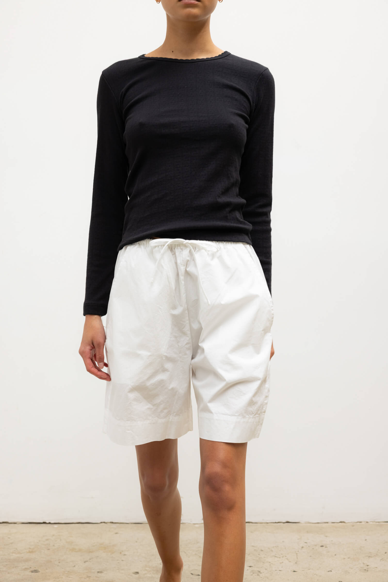 Cut in our nostalgic Pointelle Cotton, The Pointelle Slim Fit Long Sleeve features a classic crew neckline with our signature pinhole stripes, dainty eyelets, and scalloped edging. Full length with fitted long sleeves.