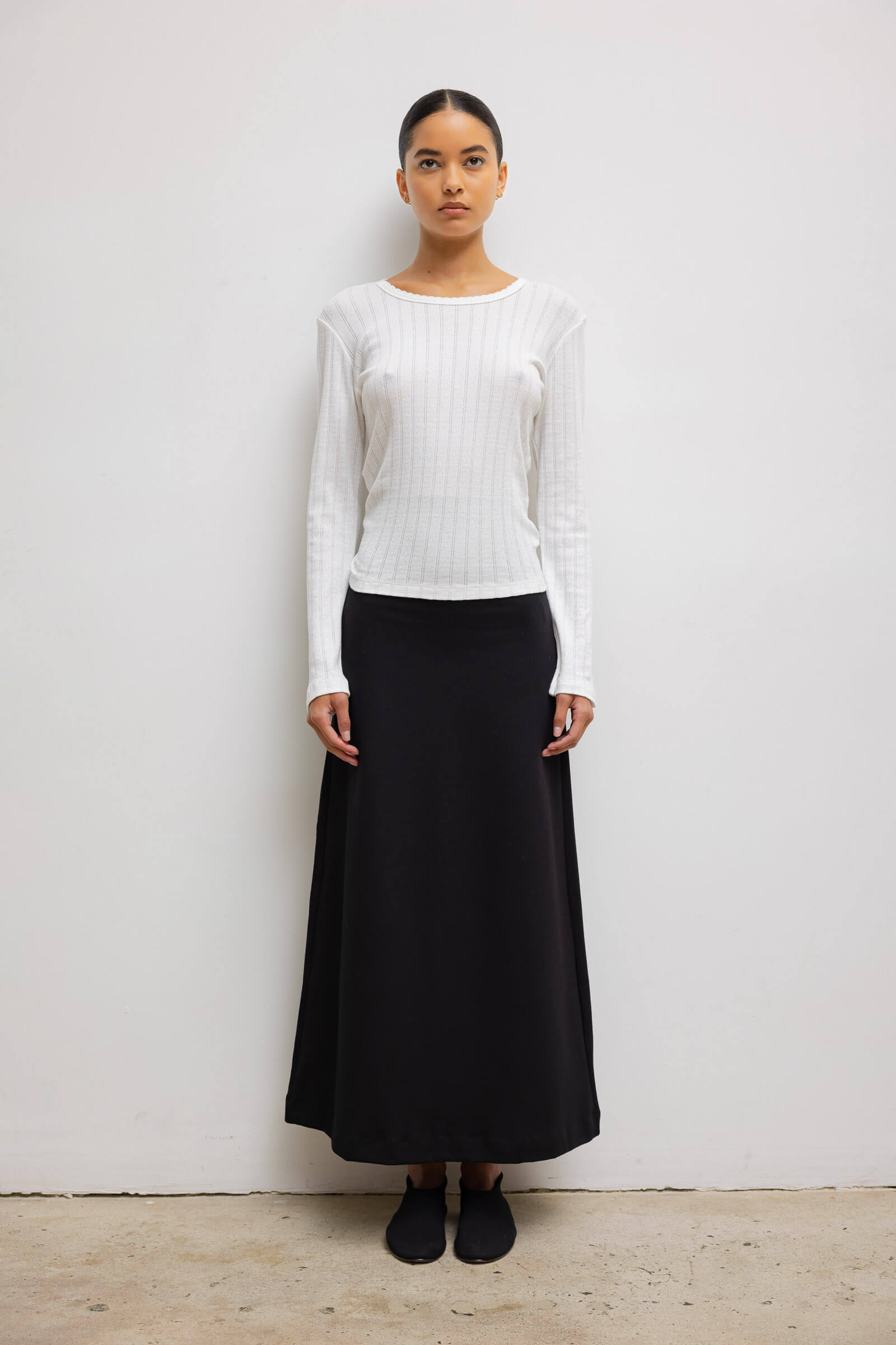 Cut in our nostalgic Pointelle Cotton, The Pointelle Slim Fit Long Sleeve features a classic crew neckline with our signature pinhole stripes, dainty eyelets, and scalloped edging. Full length with fitted long sleeves.