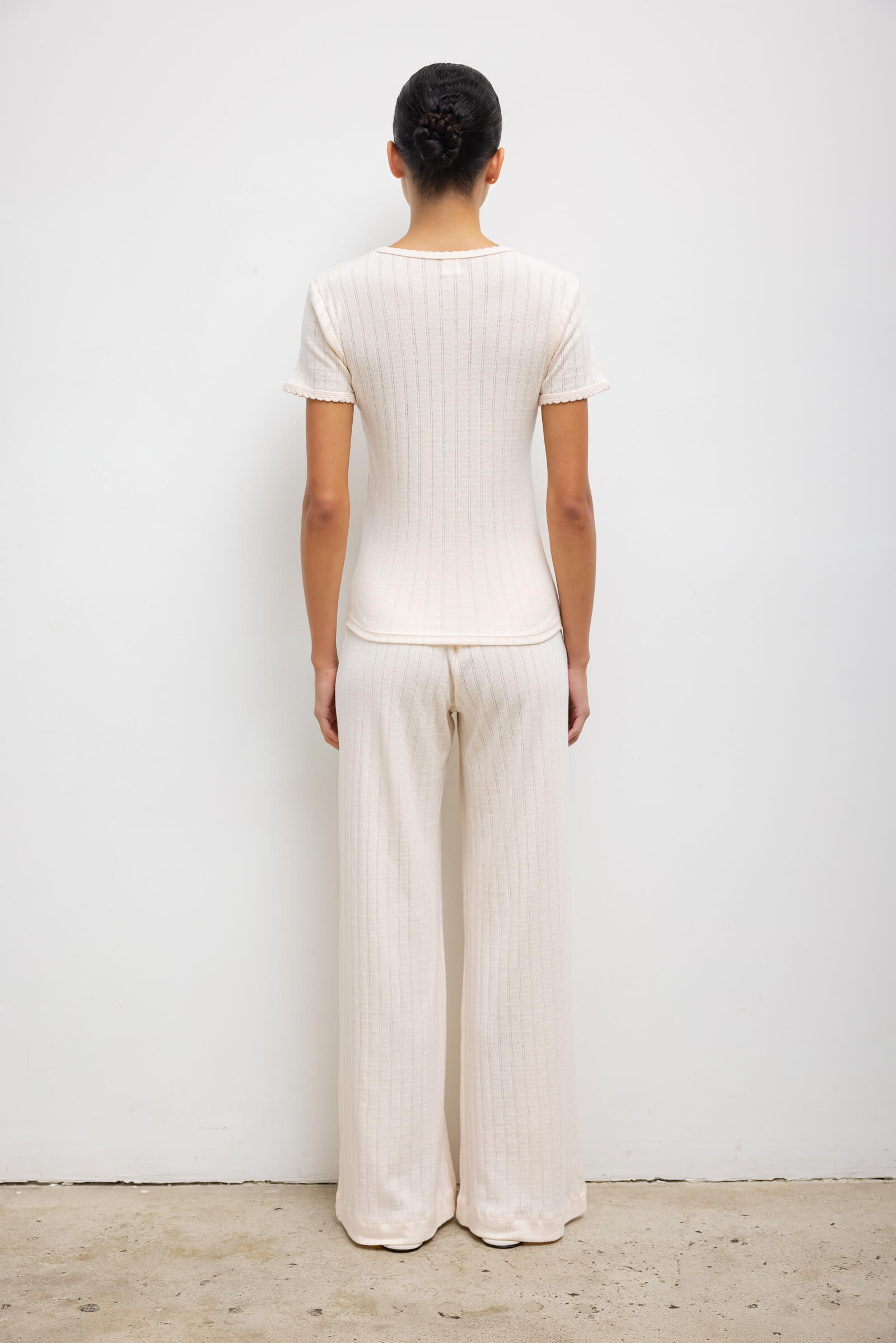 Cut in our nostalgic Pointelle Cotton, The Pointelle Slim Fit Tee features a classic crew neckline with our signature pinhole stripes, dainty eyelets, and scalloped edging.