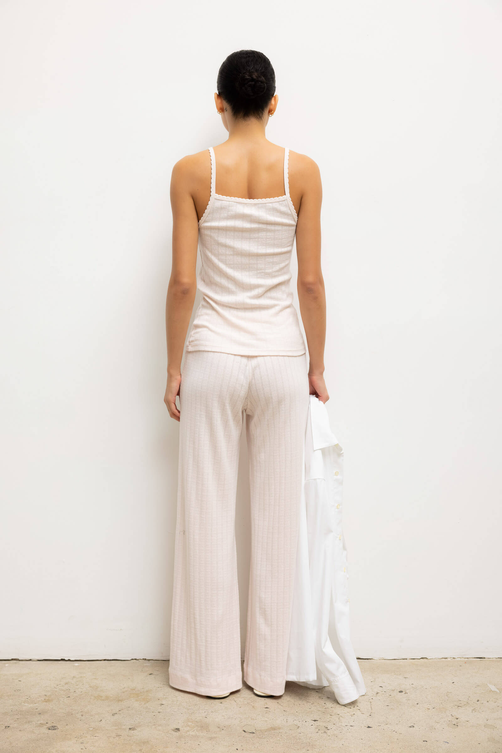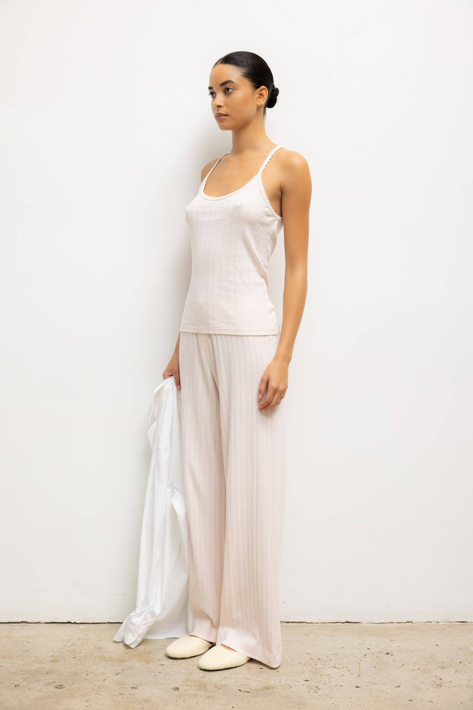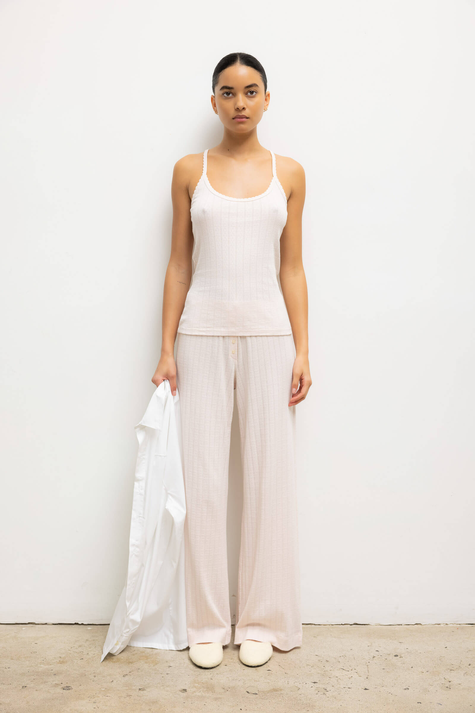 Cut in our nostalgic Pointelle Cotton, The Pointelle Tank is a classic spaghetti strap silhouette, featuring our signature pinhole stripes, dainty eyelets and scalloped edging. Wear this by itself, or layered underneath button downs and sweaters.