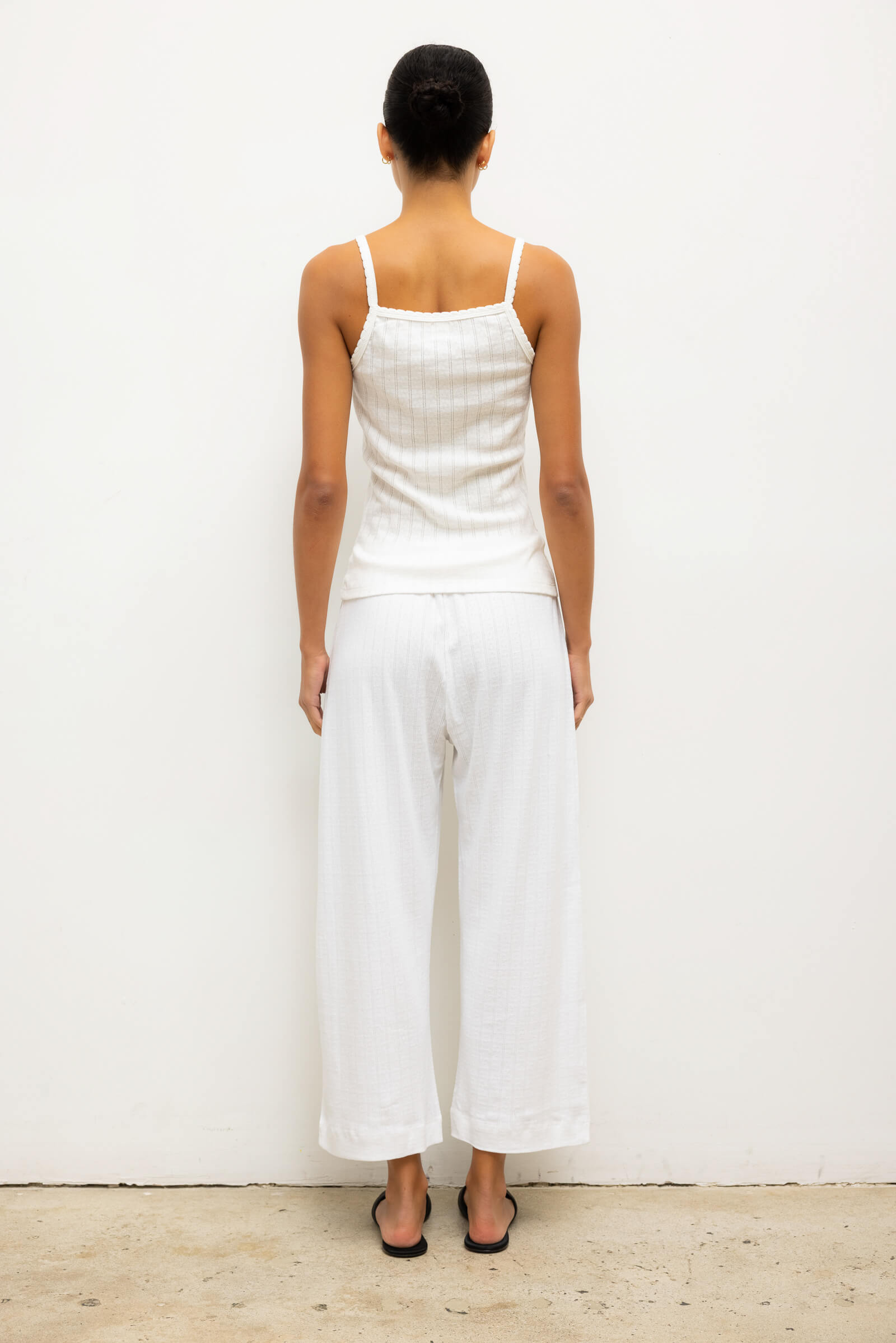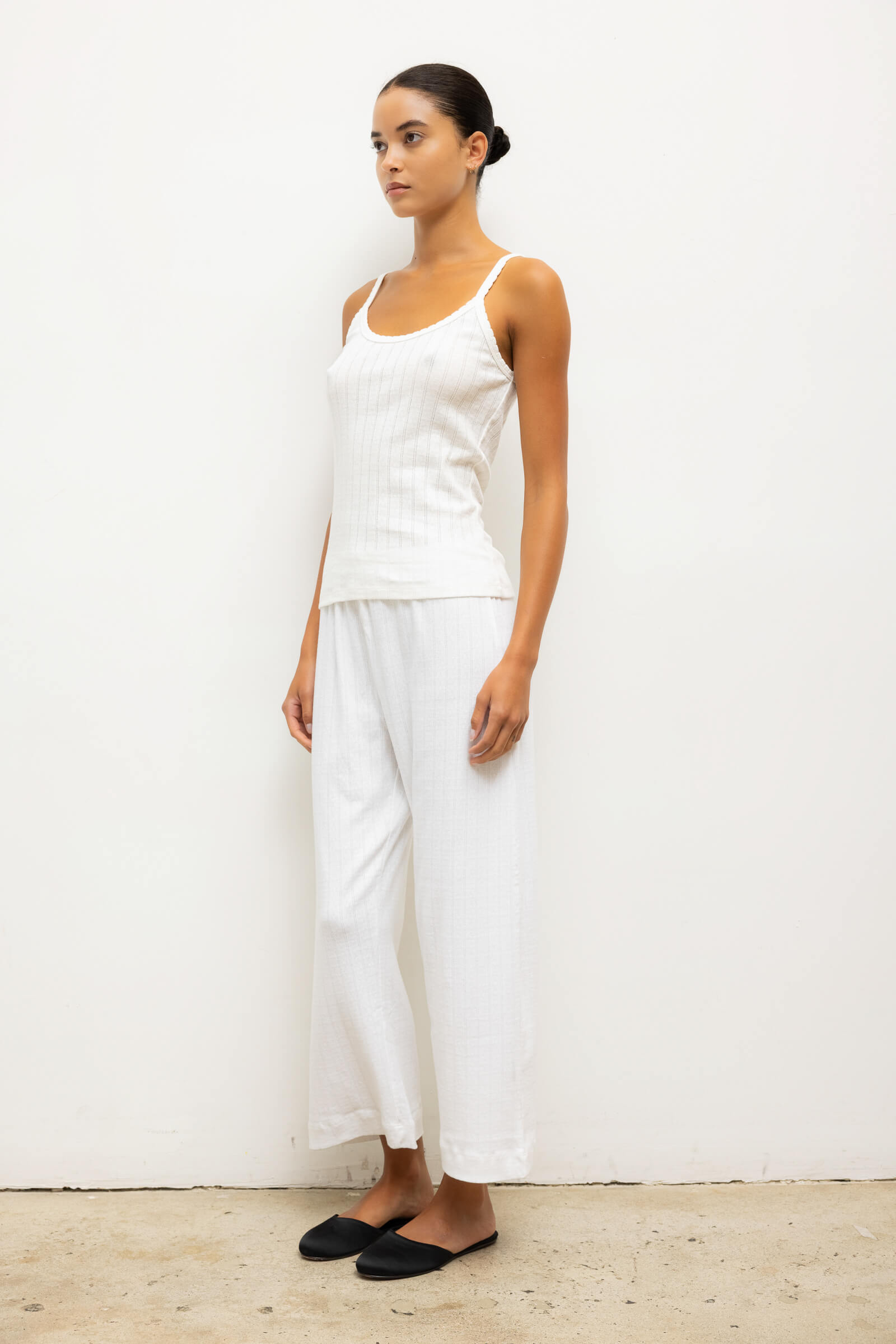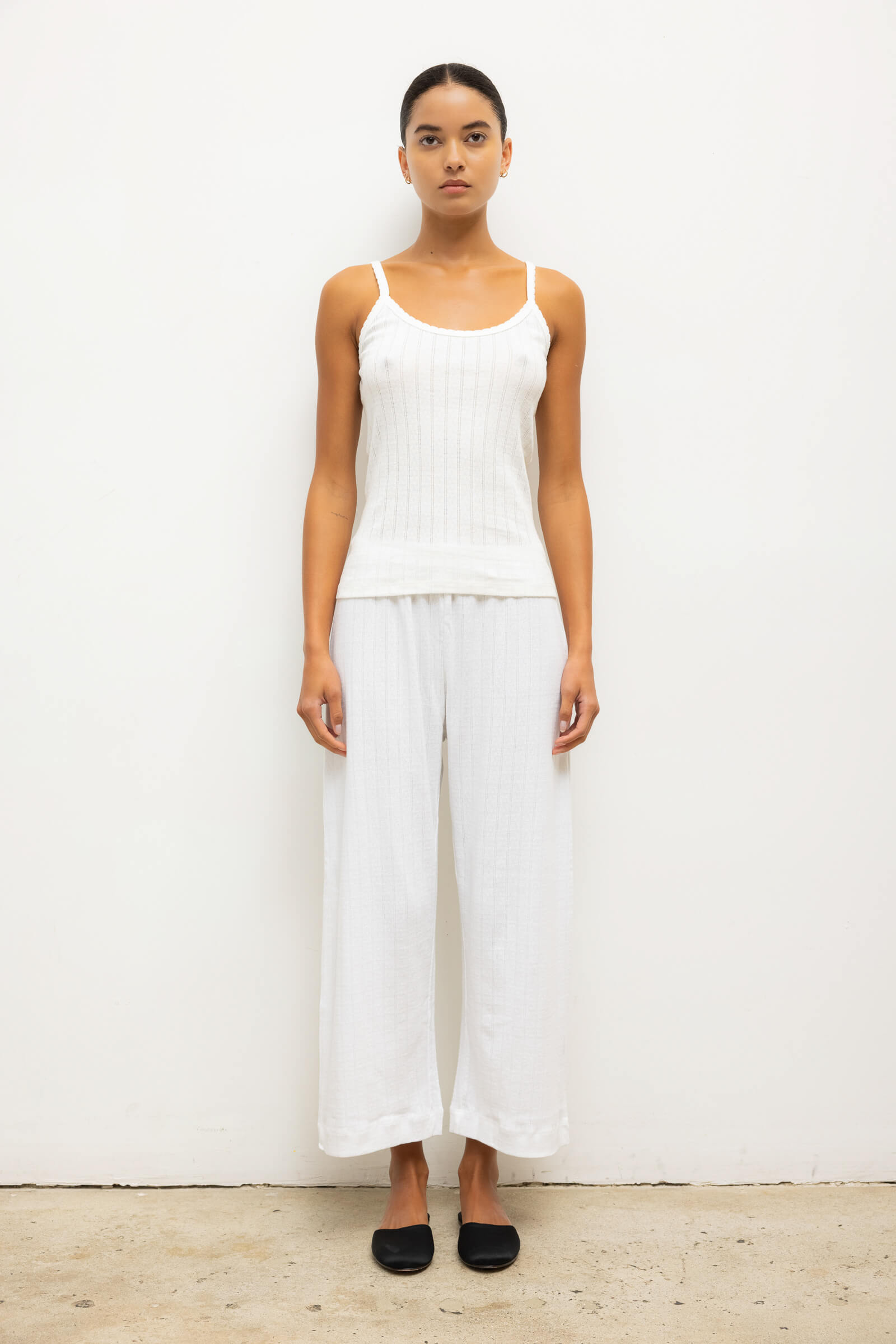 Cut in our nostalgic Pointelle Cotton, The Pointelle Tank is a classic spaghetti strap silhouette, featuring our signature pinhole stripes, dainty eyelets and scalloped edging. Wear this by itself, or layered underneath button downs and sweaters.