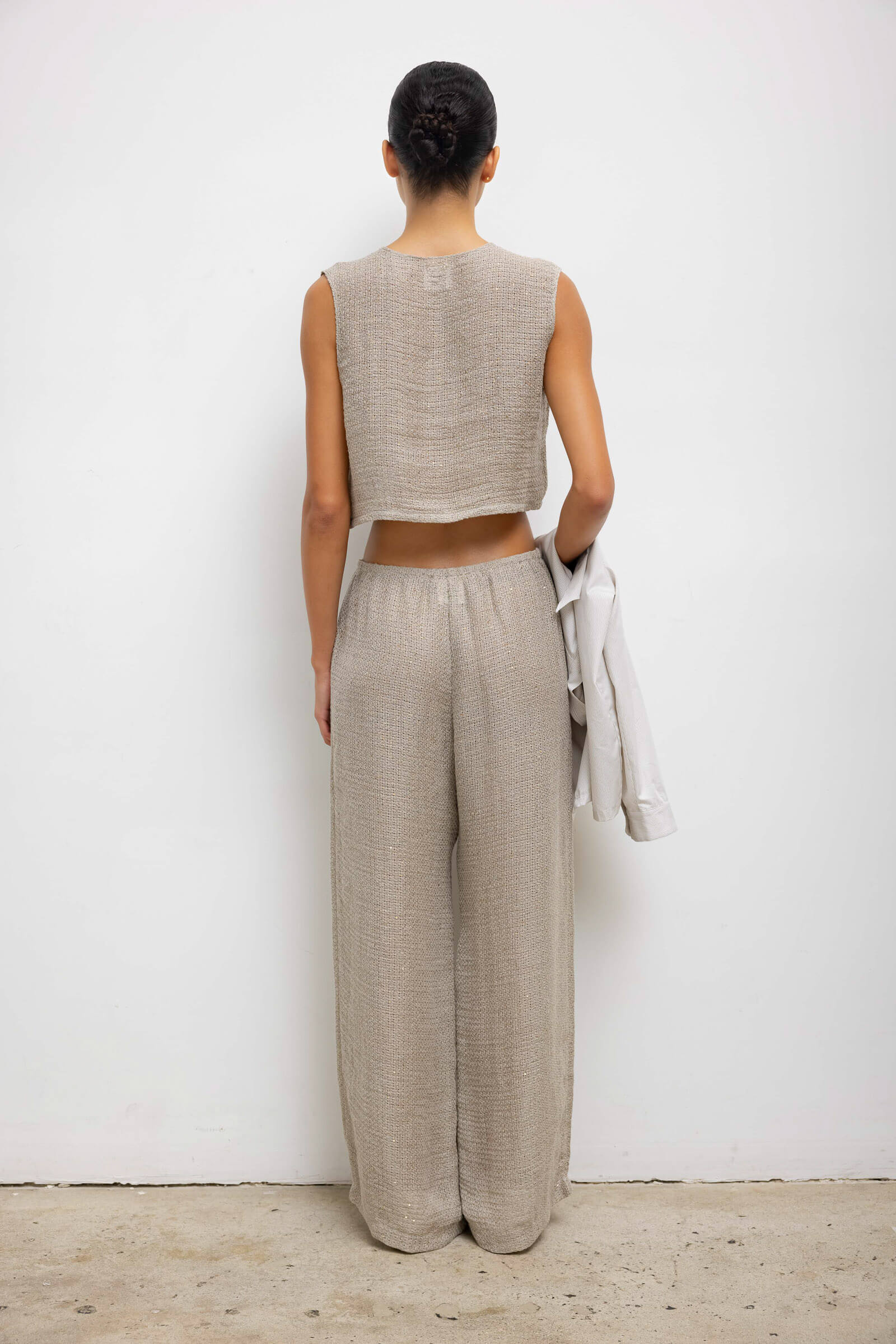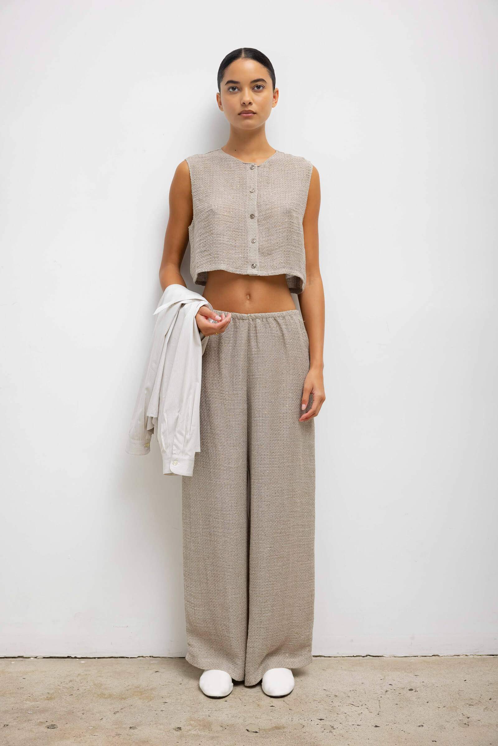 Cut in our subtly sequined Stella Linen, the Stella Crewneck Vest is a sleeveless crewneck top, featuring a button front closure and cropped length. Wear it open and layered over a bra top or bikini, or buttoned up.