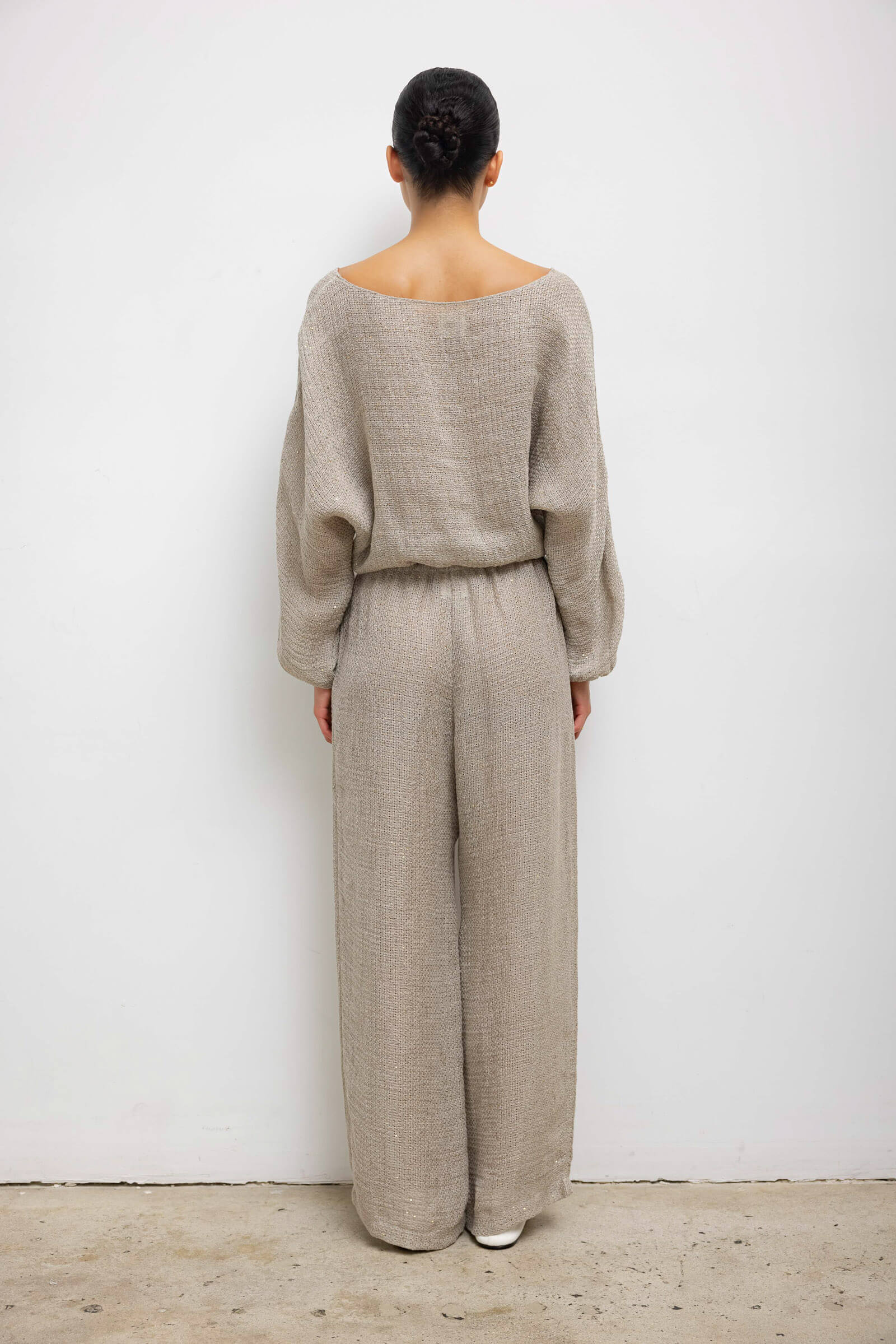 Cut in our subtly sequined Stella Linen, the Stella Wide Leg Pant is an easy, pull-on pant that features an elasticized waistband for comfortable all day wear. Build a Stella Set with the Stella Long Sleeve Blouson or Stella Crewneck Vest.