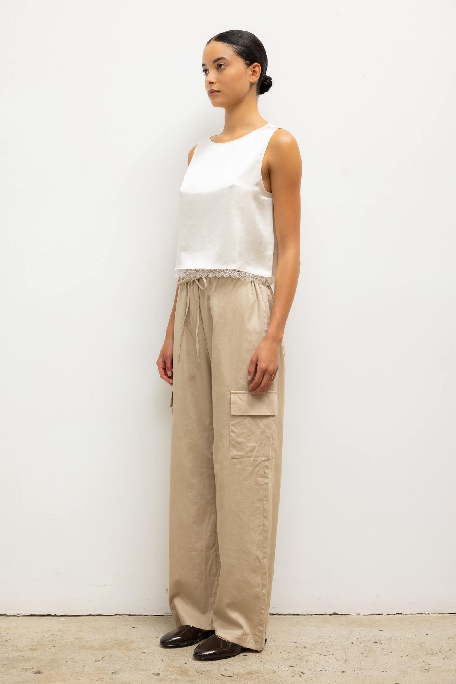 Cut in our bed sheet feel Yoko Cotton, The Yoko Drawstring Pant is a classic off-duty silhouette featuring an adjustable drawstring waist, patch side pockets, and a straight leg.