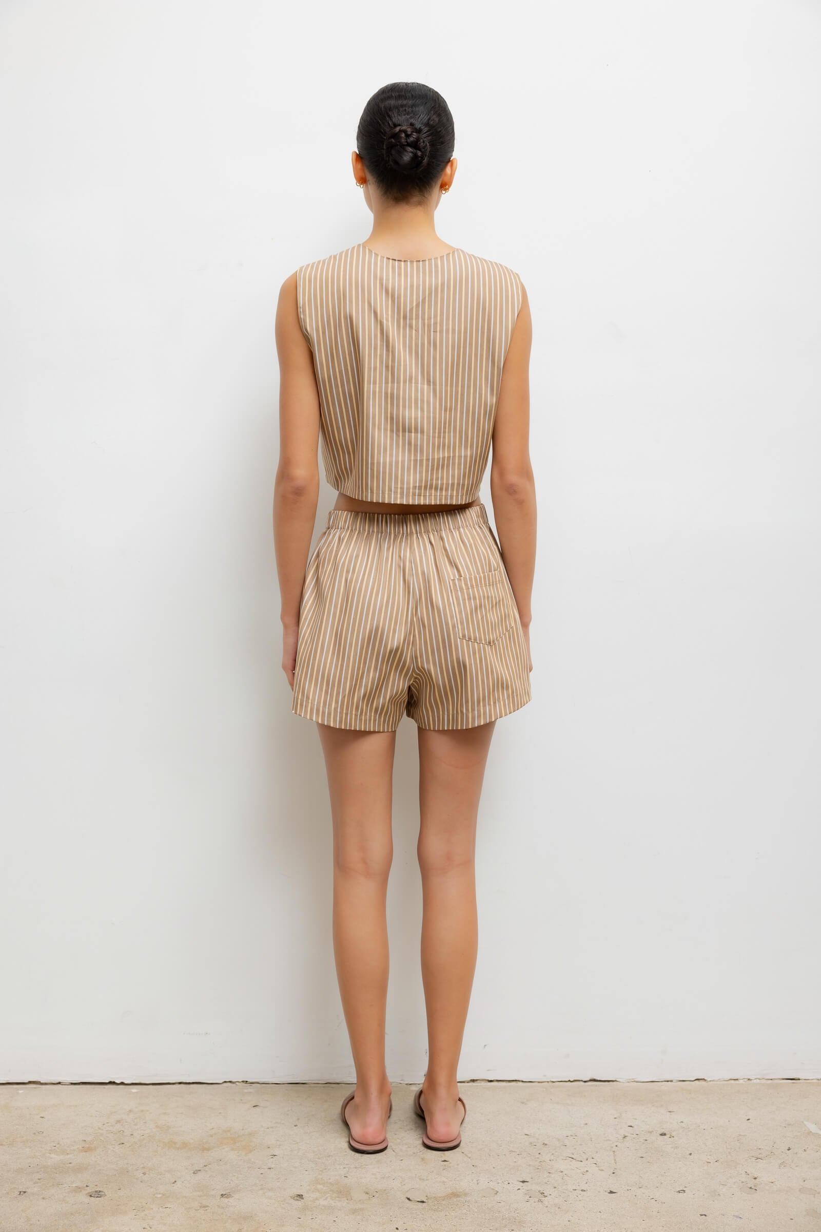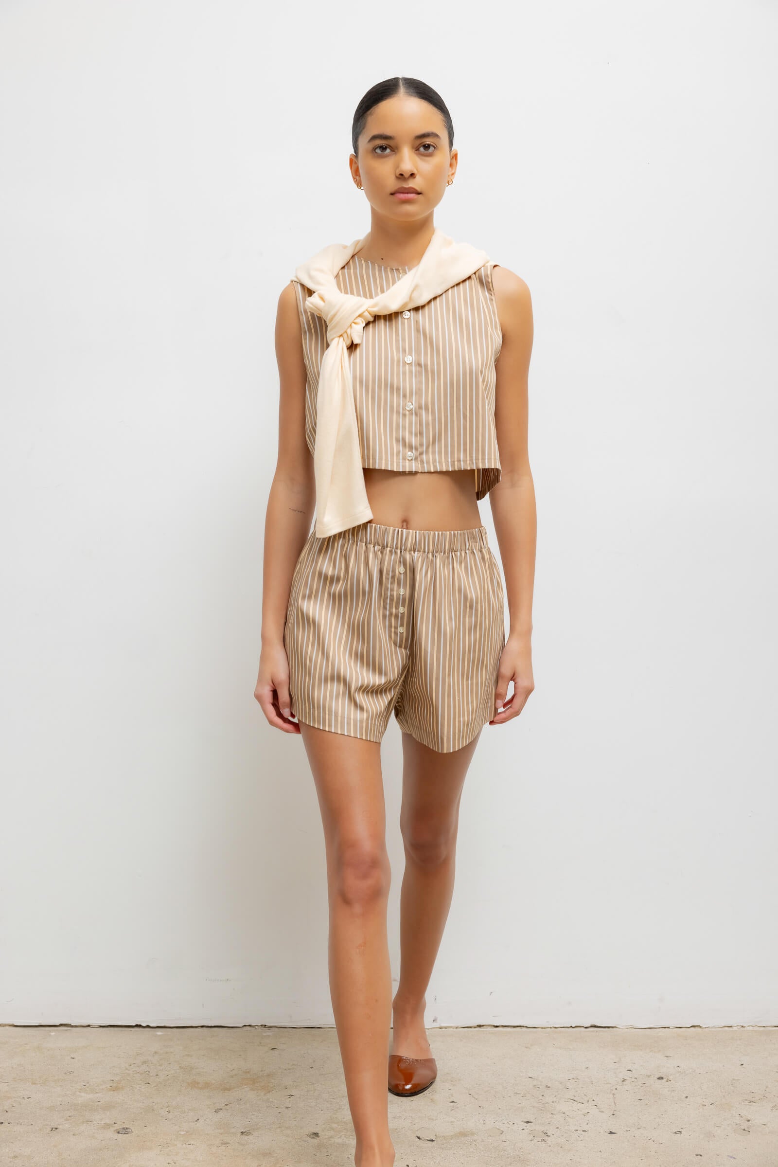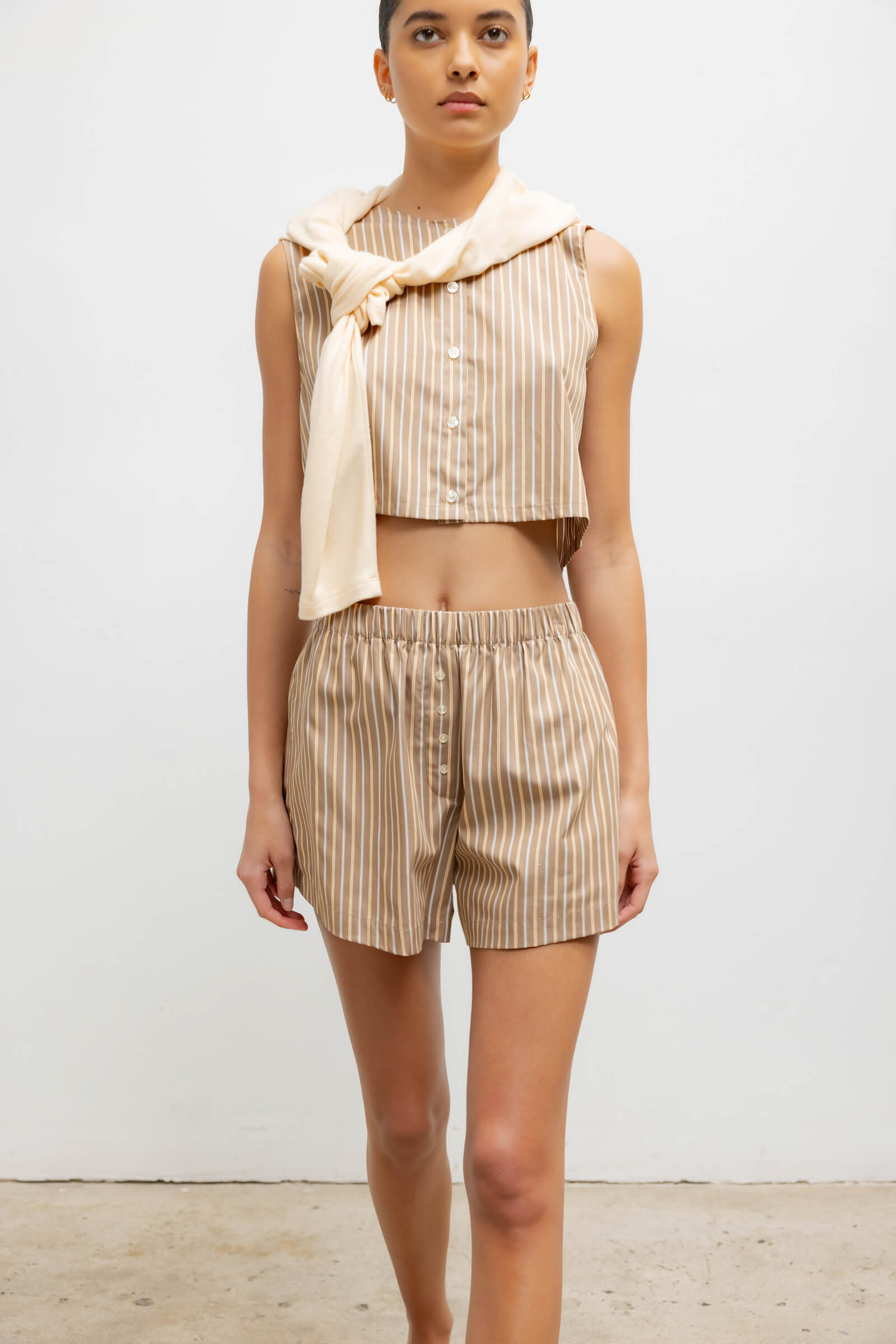 Cut in our striped Yoshi Cotton Twill, The Yoshi Boxer Short is our feminine take on a classic mens' sleepwear style, featuring everyday wear-minded details like a cinched waistband, A line silhouette, and side slit pockets.