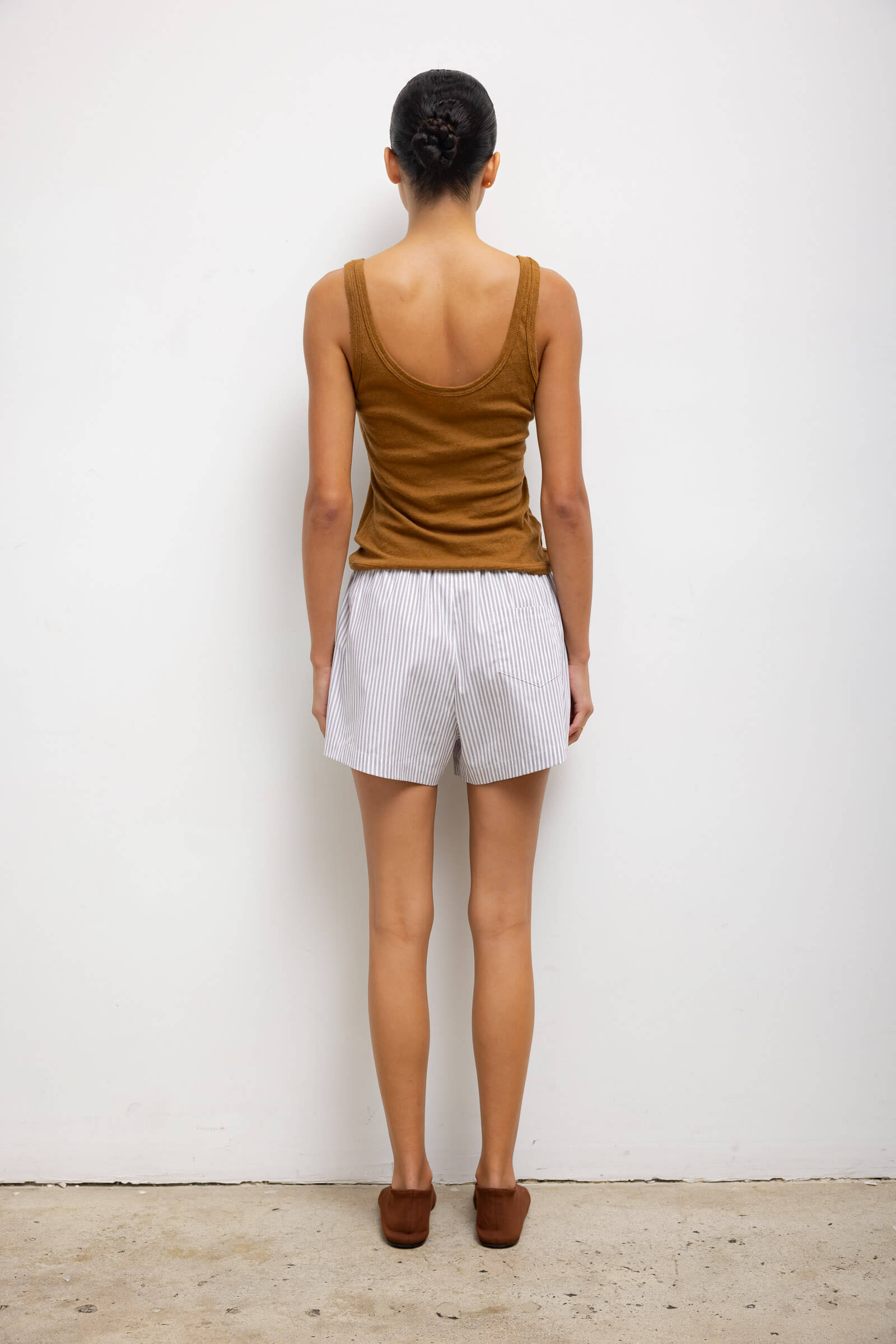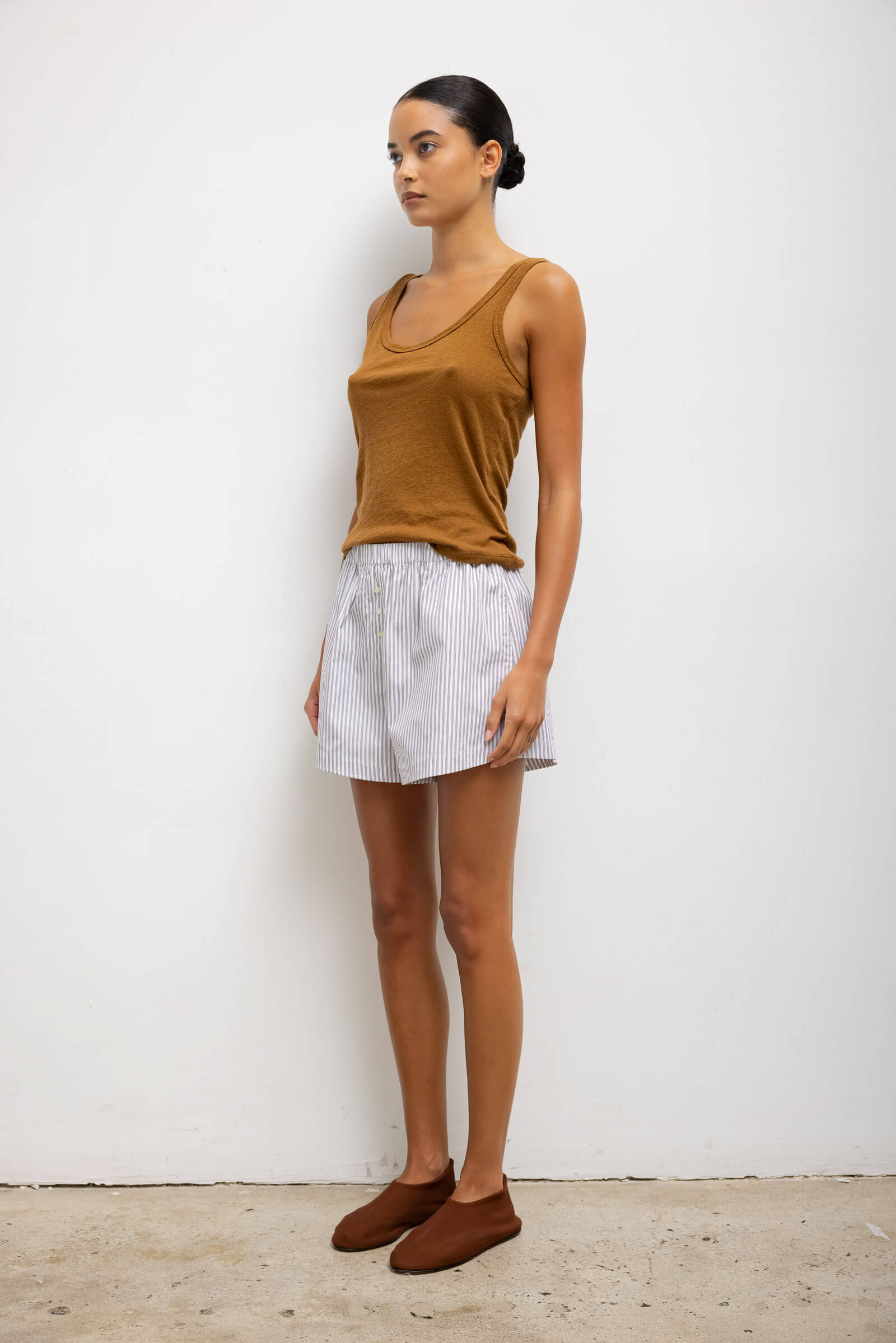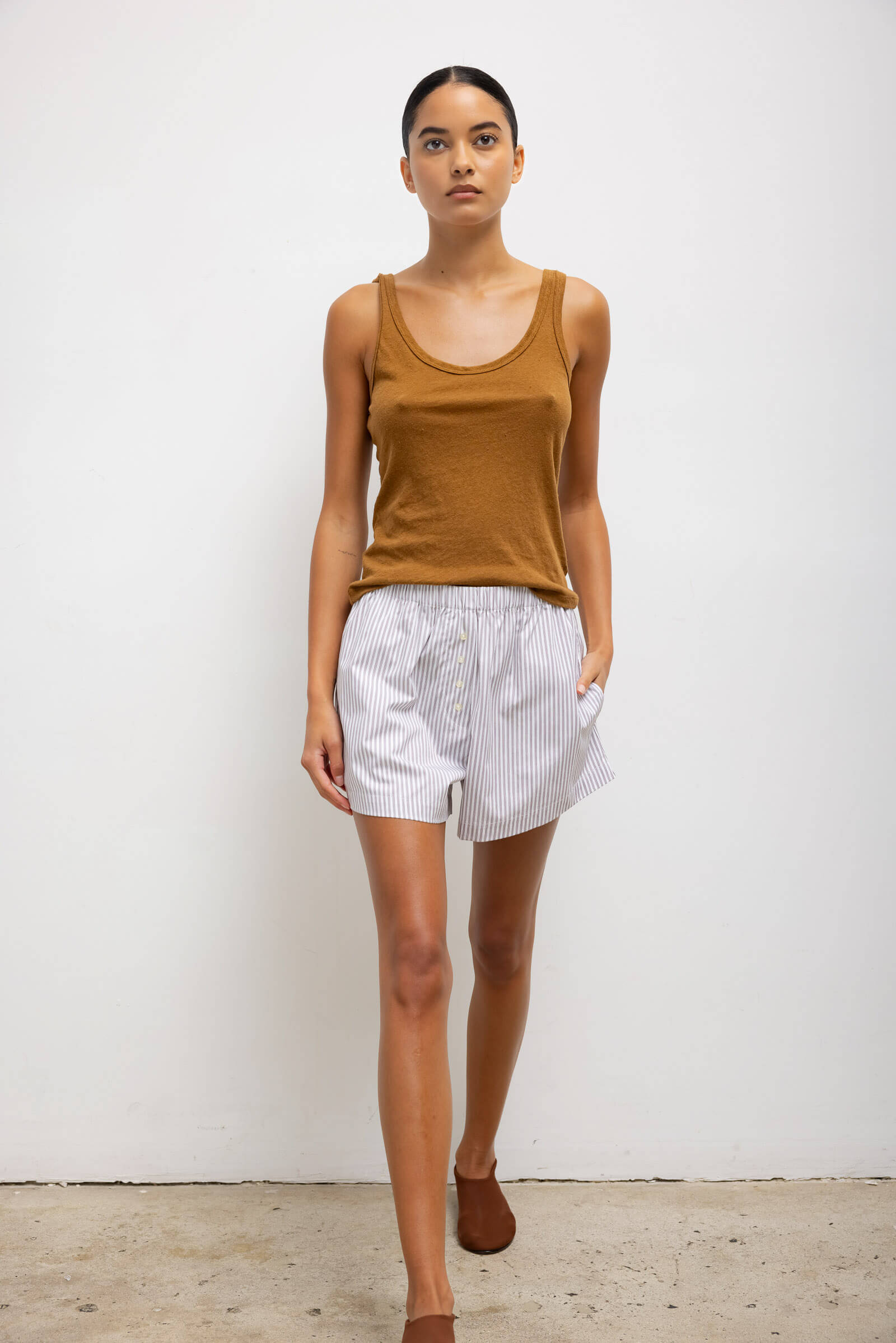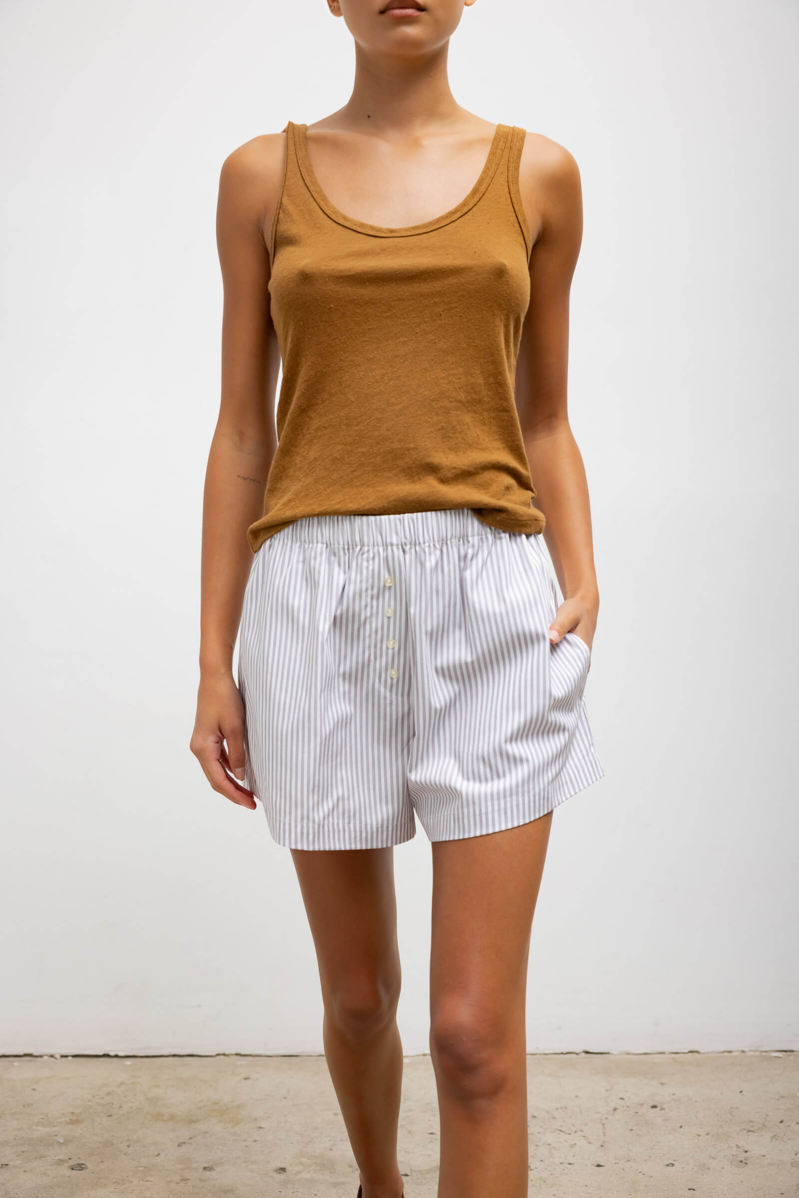 Cut in our striped Yoshi Cotton Twill, The Yoshi Boxer Short is our feminine take on a classic mens' sleepwear style, featuring everyday wear-minded details like a cinched waistband, A line silhouette, and side slit pockets.