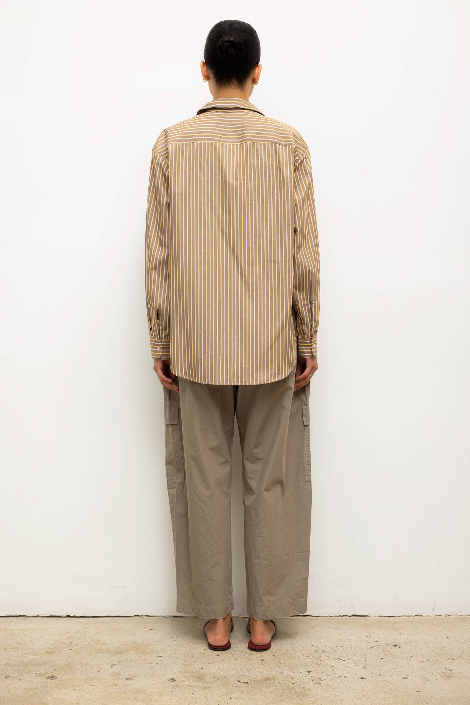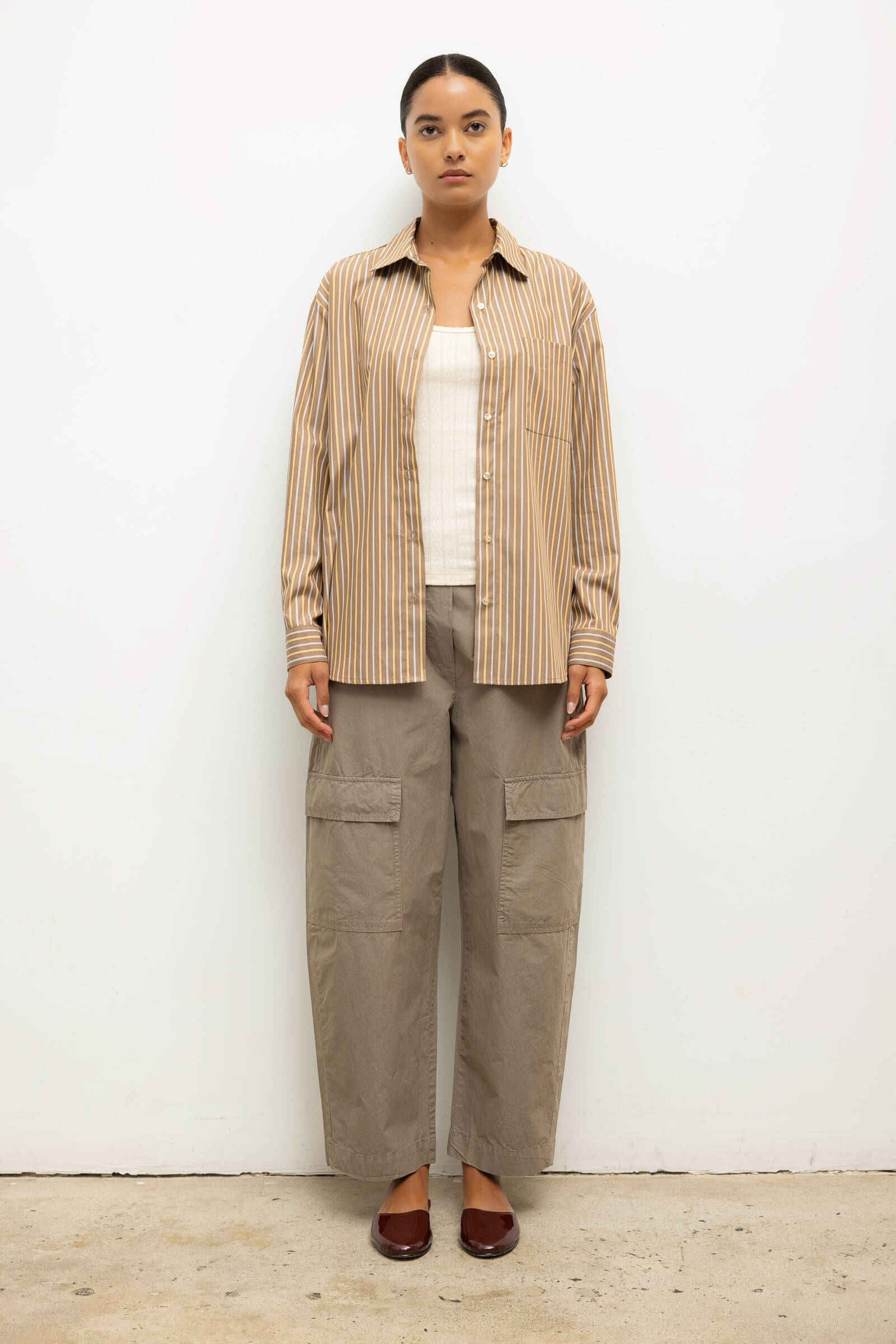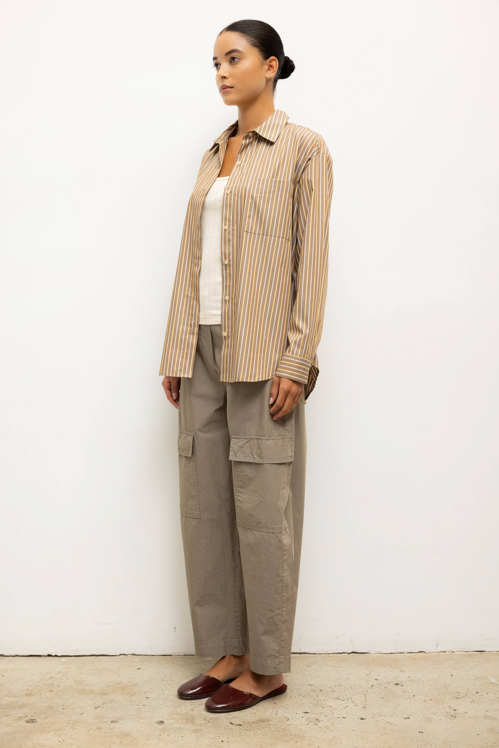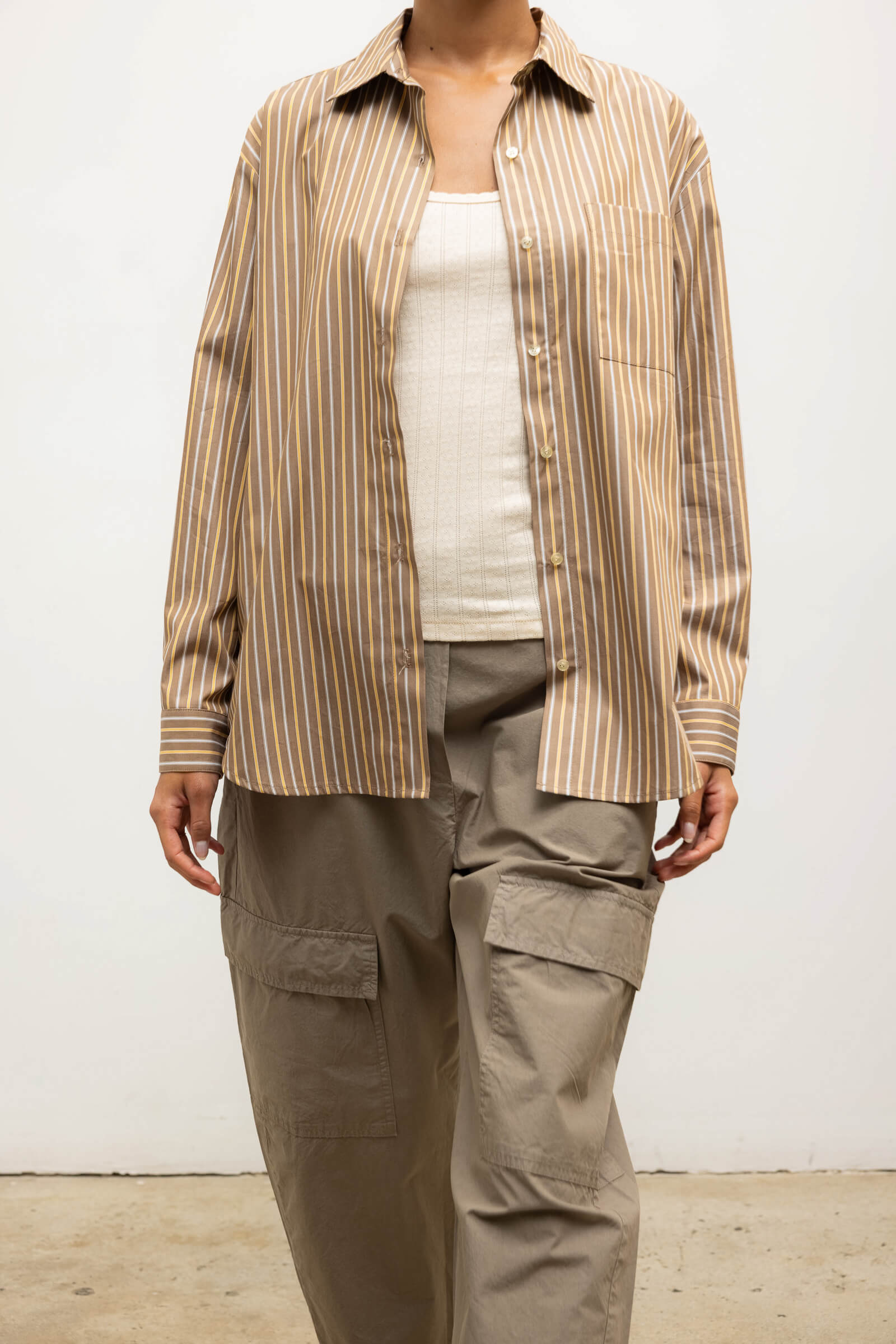Cut in our striped Yoshi Cotton Twill, The Yoshi Classic Oversized Button Down features a classic pointed collar, curved hem, and a button front closure. Wear this buttoned up with matching Yoshi bottoms — or open over our any of The Classics.