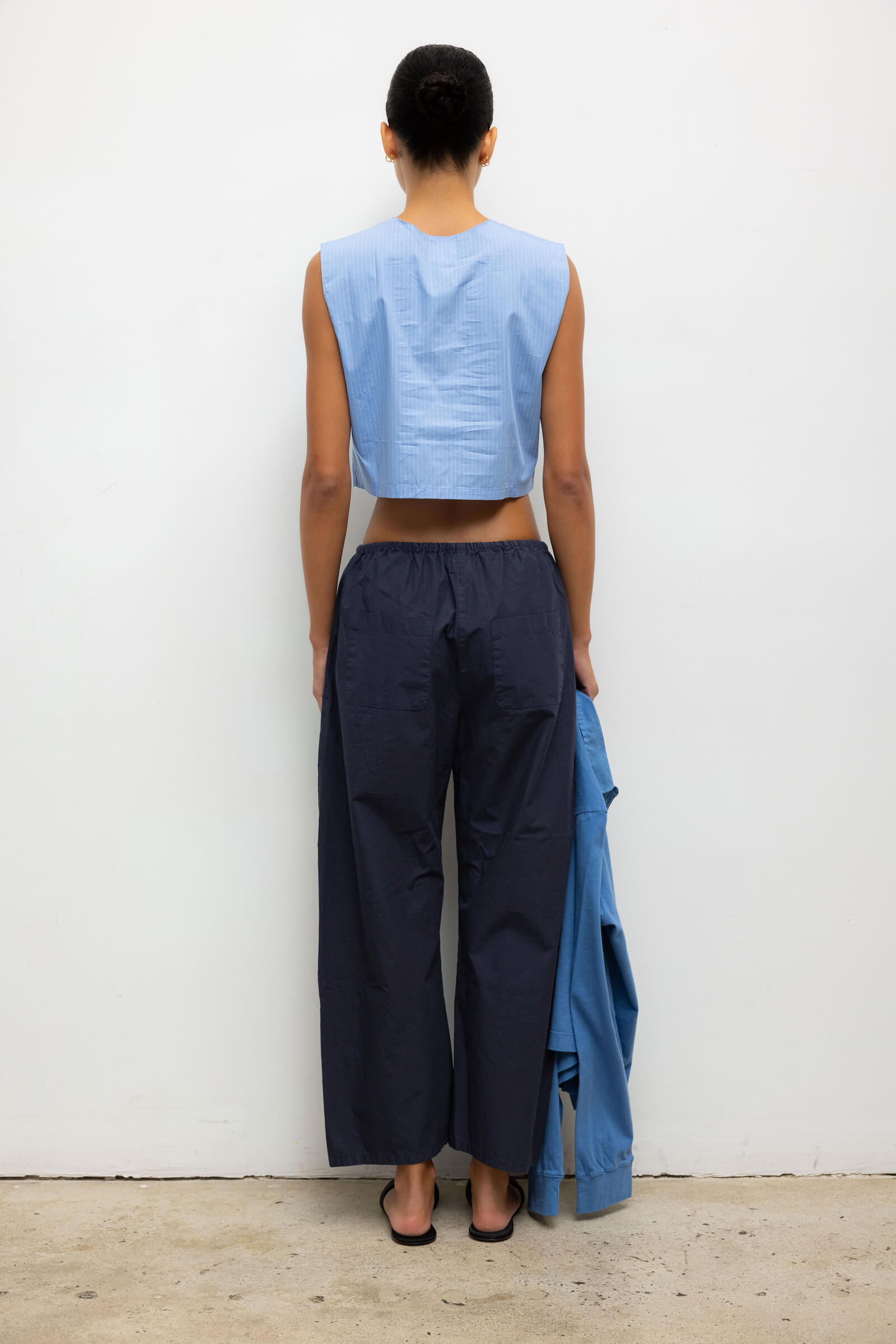 Cut in our striped Yoshi Cotton Twill, The Yoshi Crewneck Vest is a sleeveless silhouette, featuring a crew neckline, exposed button placket, and a cropped length. Make it a matching set with the Yoshi Drawstring Pant.