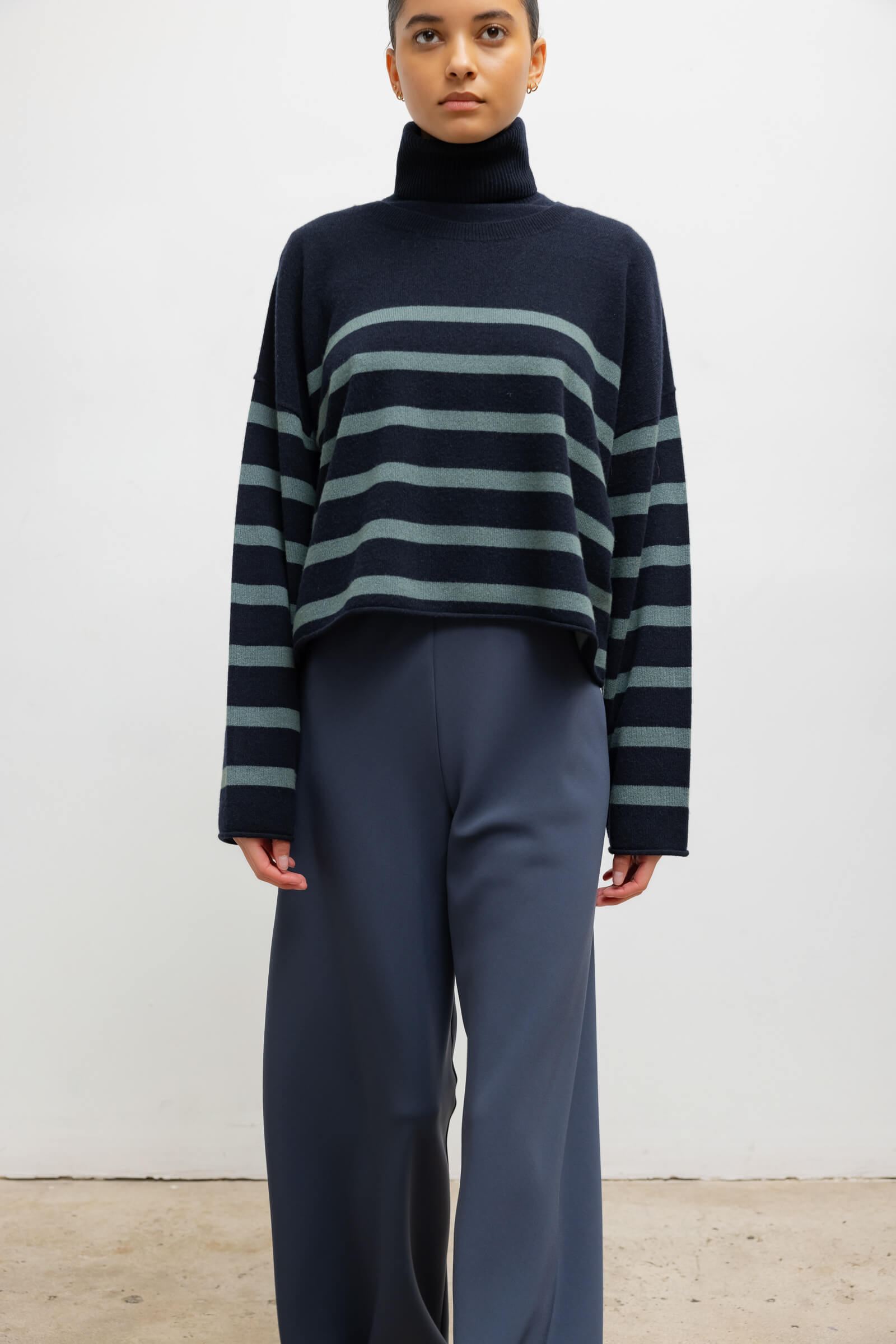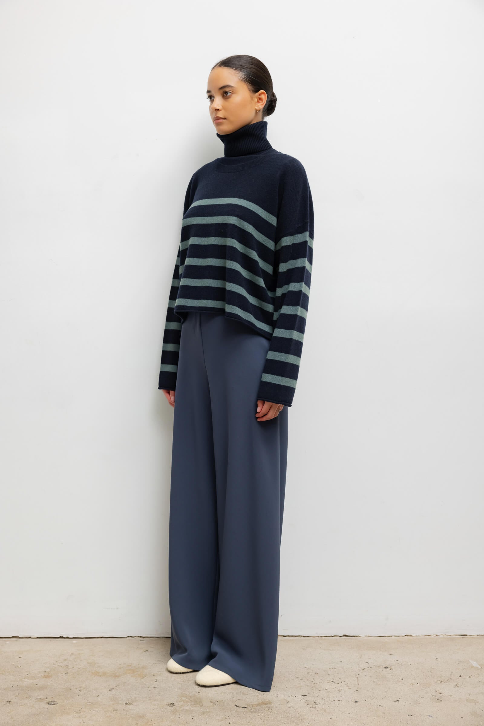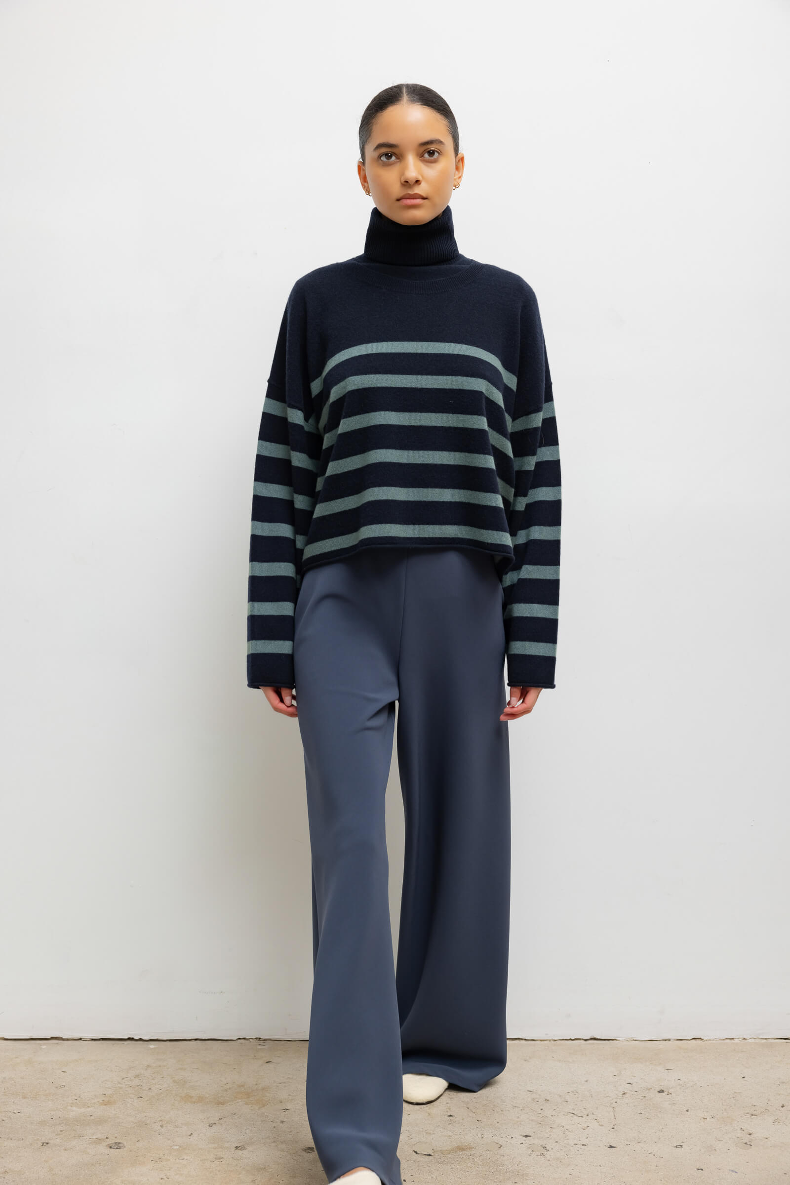Knit in our plush Zoe Wool/Cashmere Knit, The Zoe Crew striped update to our beloved knit set. Featuring a clean crew neckline, slightly dropped shoulders, and a rolled hemline. Throw it over the shoulders or layer it underneath outerwear as the season changes.