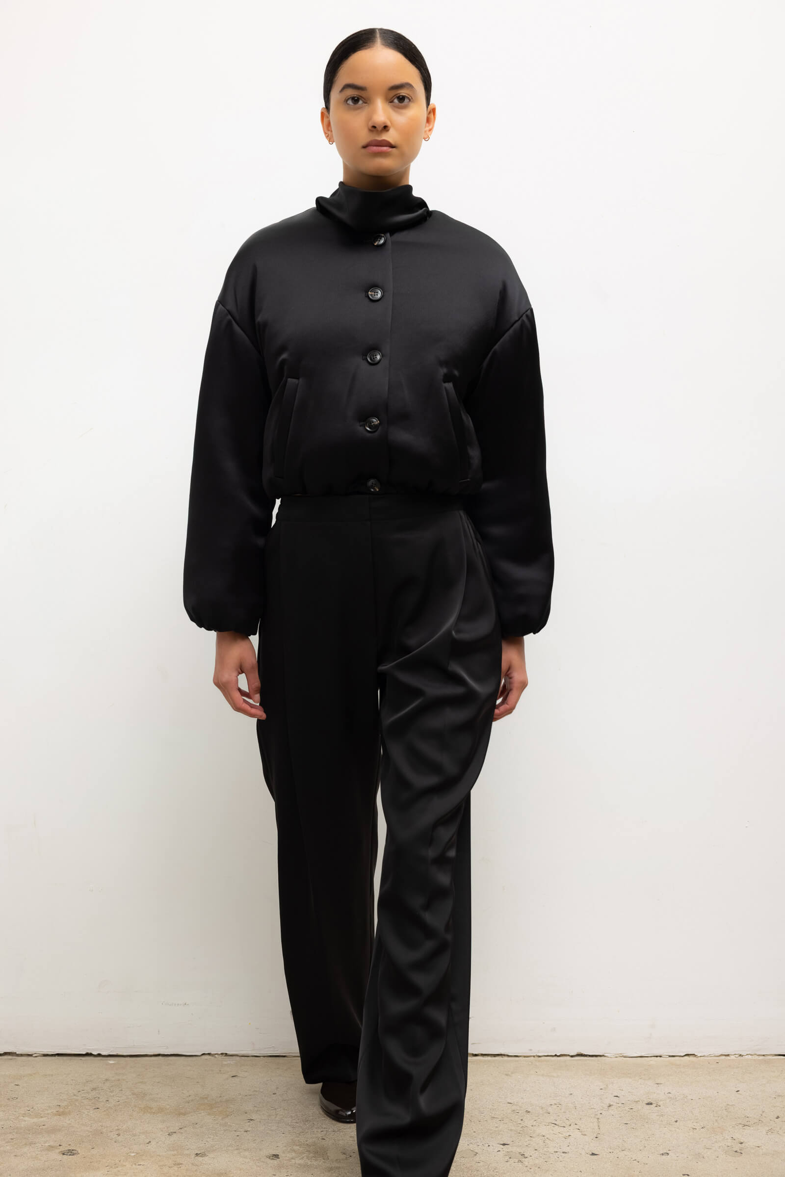 Cut in our best-selling, Japanese-crafted Barb Satin, The Barb Bomber reimagines the classic utility bomber. This collarless crop jacket features a soft poly faille, button front closure and shapely full length sleeves. Make it a matching set with any Barb style.