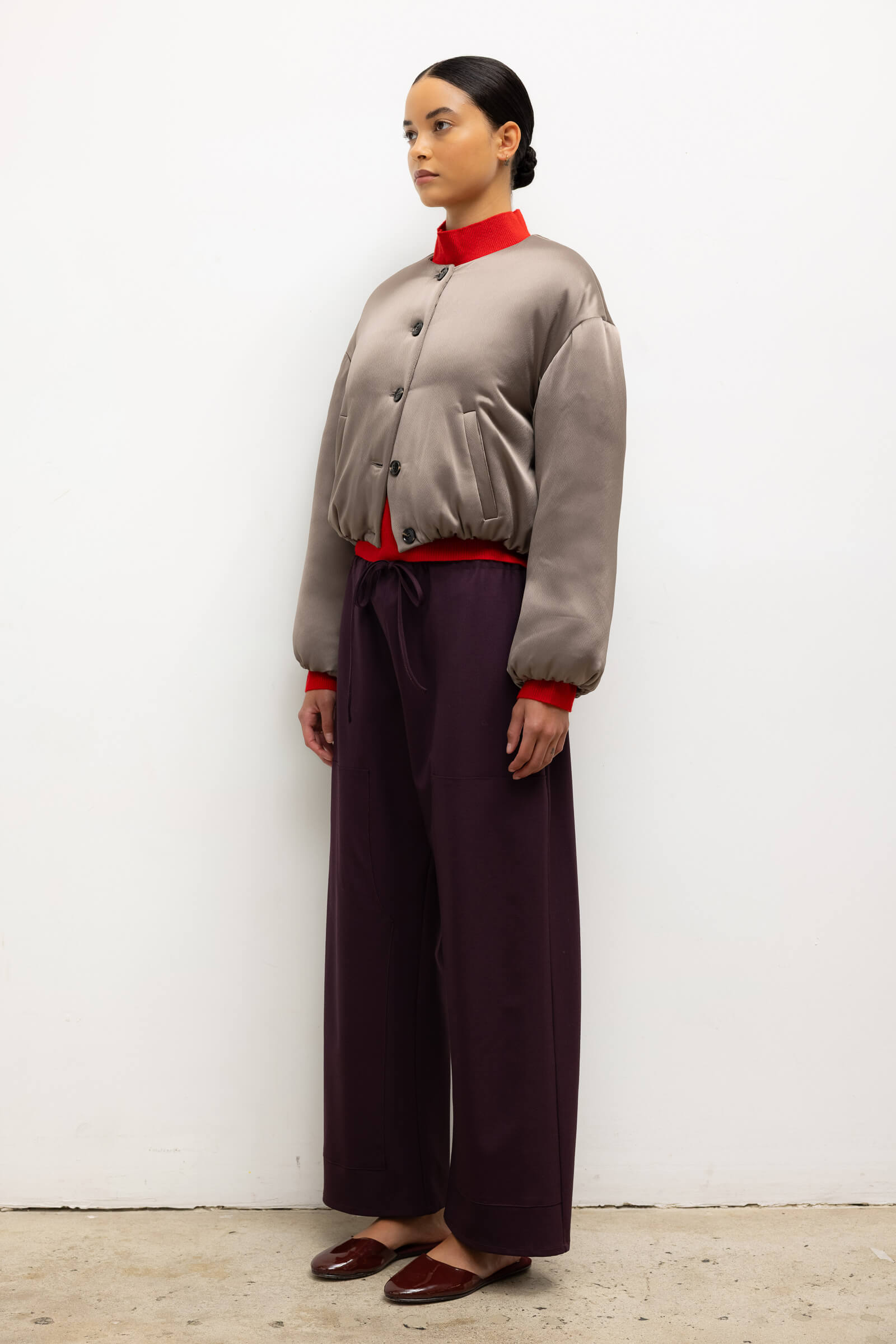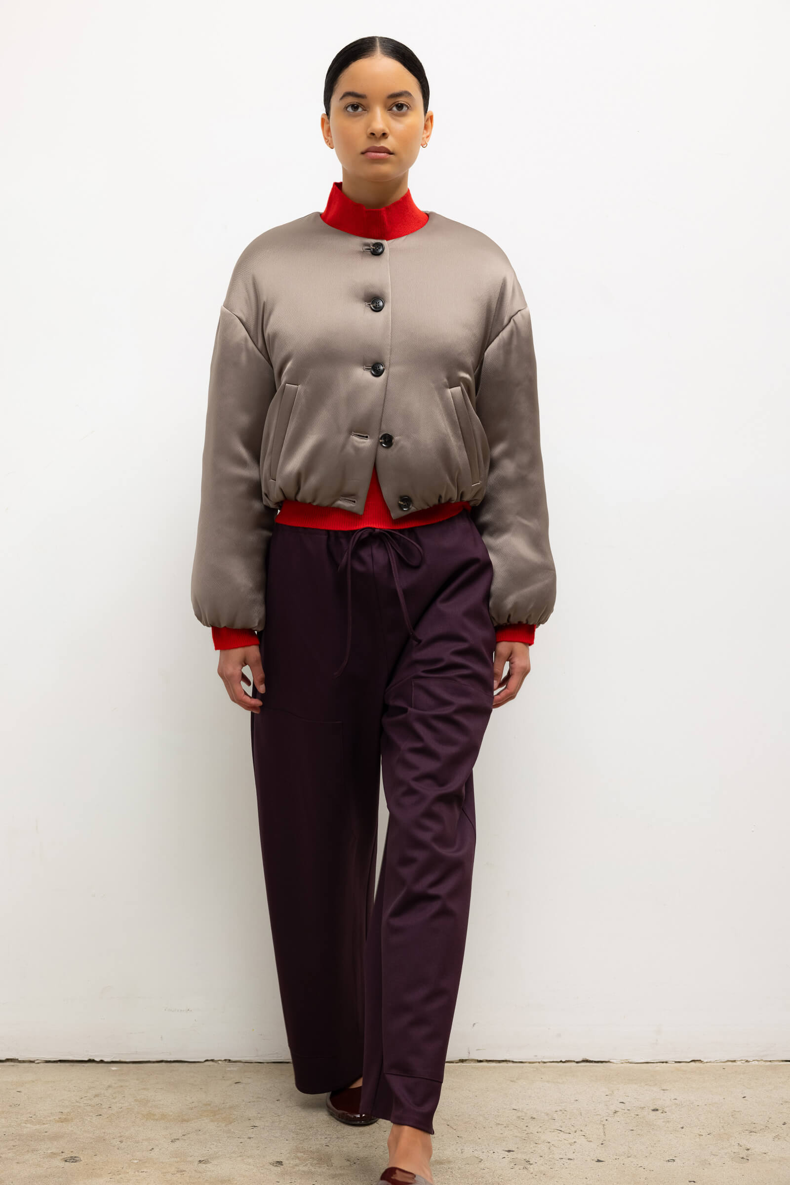 Cut in our best-selling, Japanese-crafted Barb Satin, The Barb Bomber reimagines the classic utility bomber. This collarless crop jacket features a soft poly faille, button front closure and shapely full length sleeves. Make it a matching set with any Barb style.